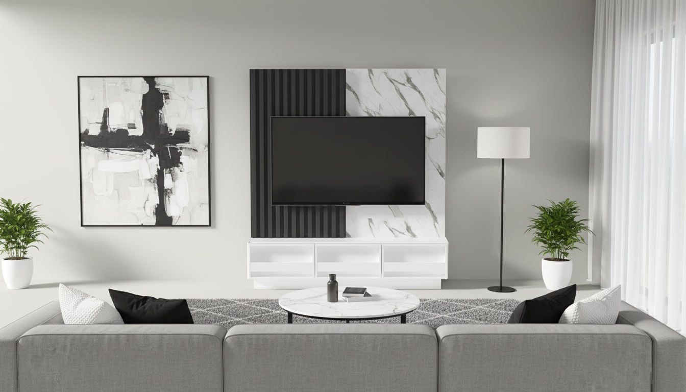 Mueble TV moderno con panel alistonado gris pizarra, encimera mármol gris y base blanca seda con cajones. Diseño asimétrico y modular con revistero integrado para un salón elegante.