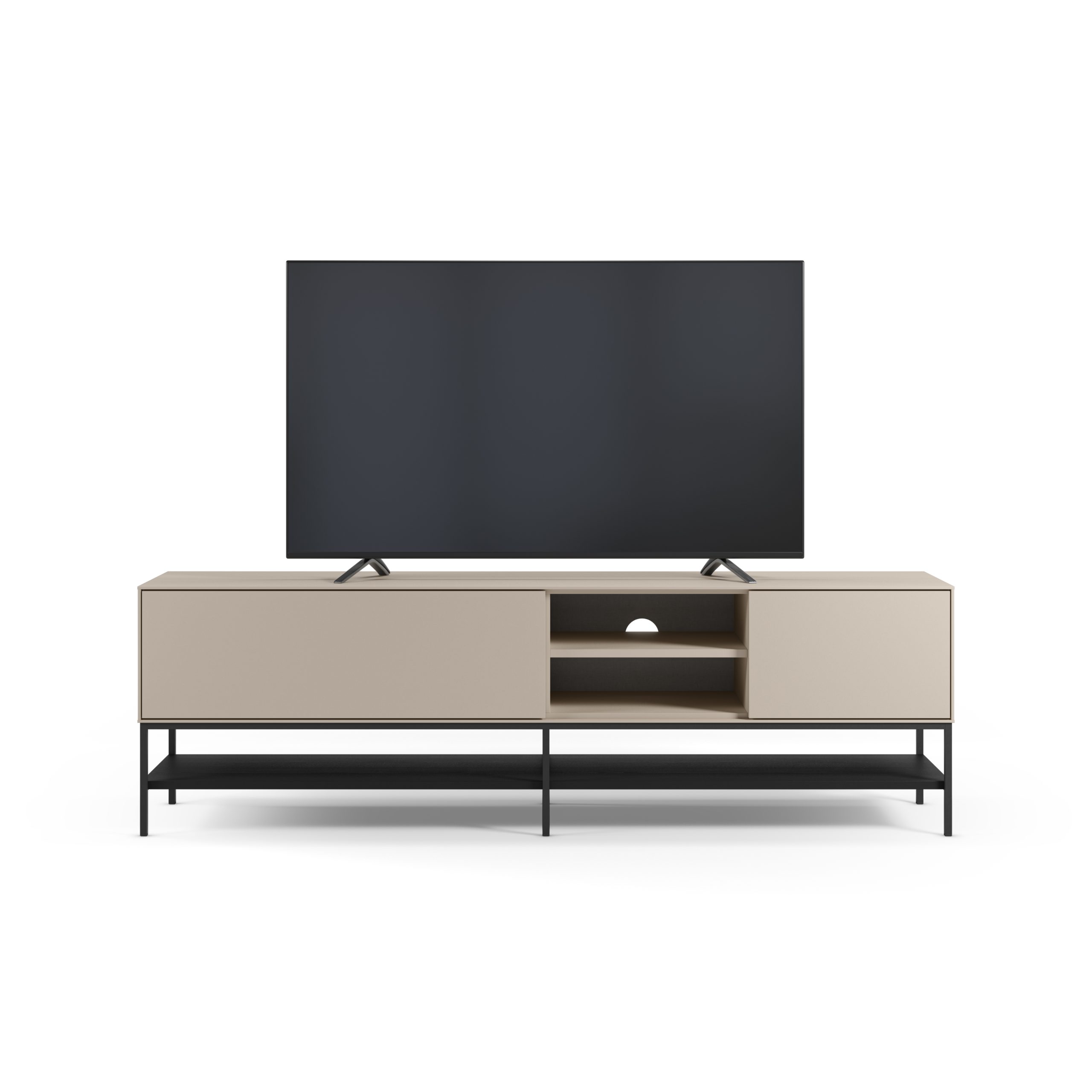 Mueble de TV de diseño contemporáneo con líneas rectas y estructura ligera en metal, ideal para salones modernos. Ofrece dos módulos cerrados y baldas centrales para equipos multimedia, además de estante inferior para almacenaje adicional.