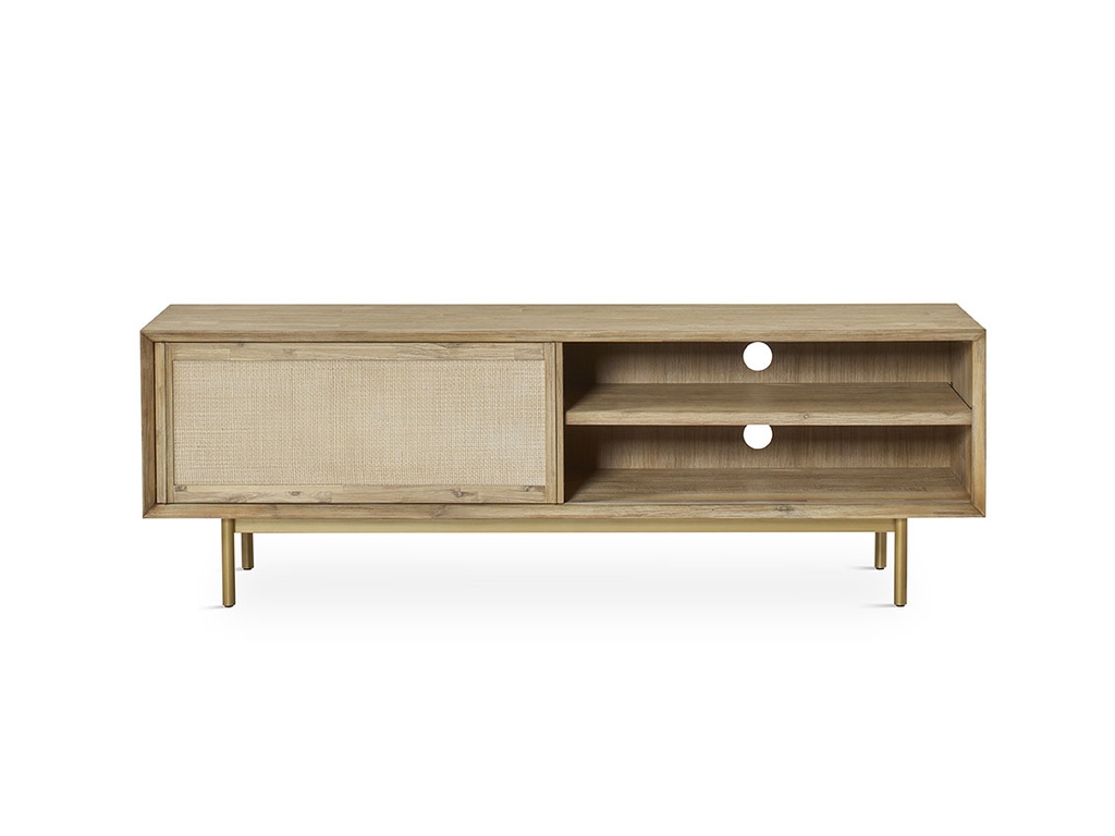 • Material principal: madera maciza de alta calidad, estructura y frontal enrejillado. • Patas metálicas que garantizan estabilidad y añaden un toque contemporáneo. • 1 puerta corredera que oculta un compartimento de almacenaje cerrado. • Zona abierta con baldas para colocar equipos de audio, vídeo y decoración. • Orificios pasacables en la parte trasera para una mejor gestión de cables. • Acabado de inspiración natural que realza la veta y textura de la madera maciza. • Medidas: ancho 165 cm, fondo 45 cm y alto 55 cm.