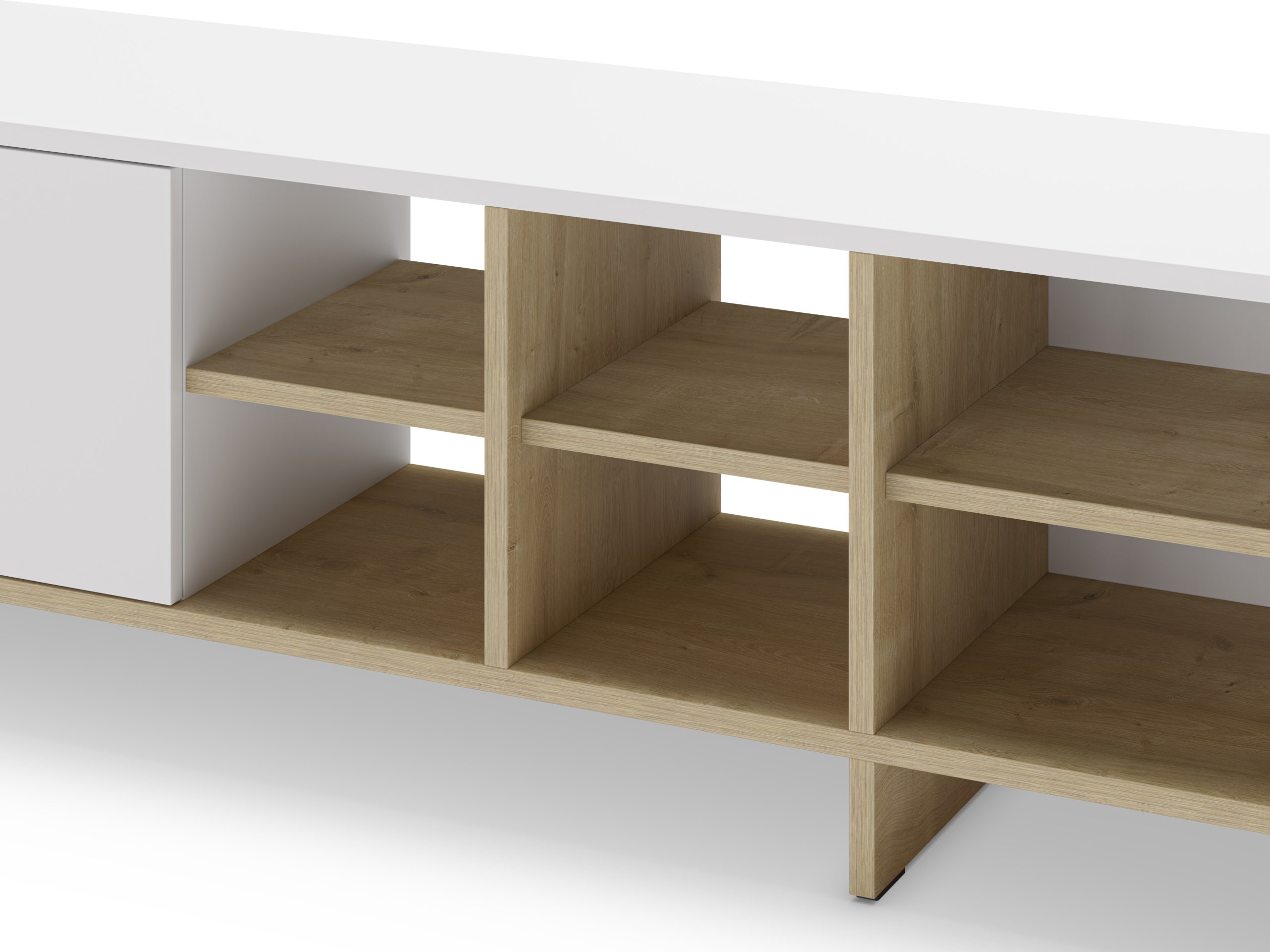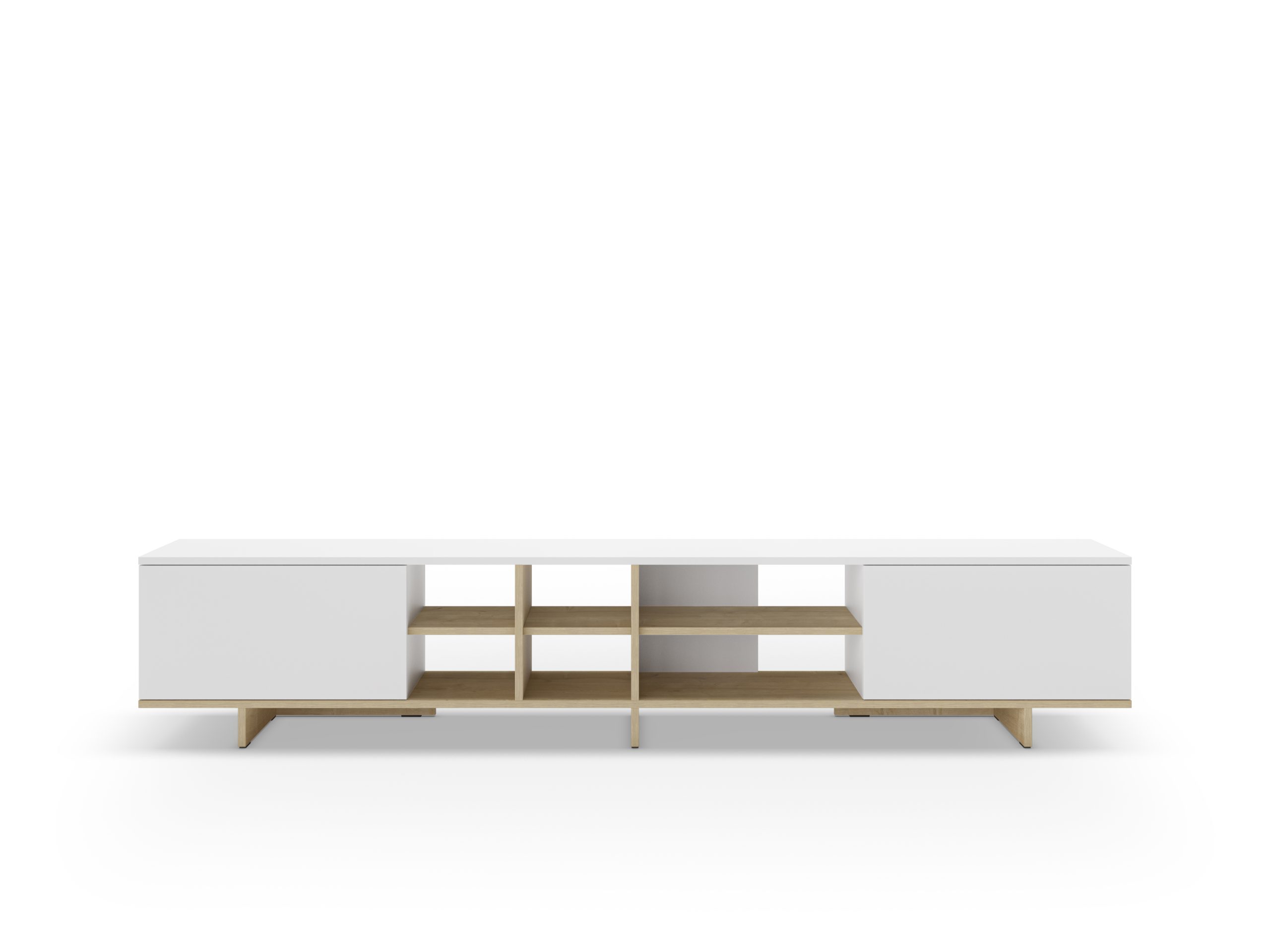 Mueble de TV de líneas rectas y diseño minimalista, con estructura baja y amplia superficie superior. Dispone de dos módulos cerrados laterales y baldas centrales abiertas para equipos y decoración, aportando orden y estilo al salón.