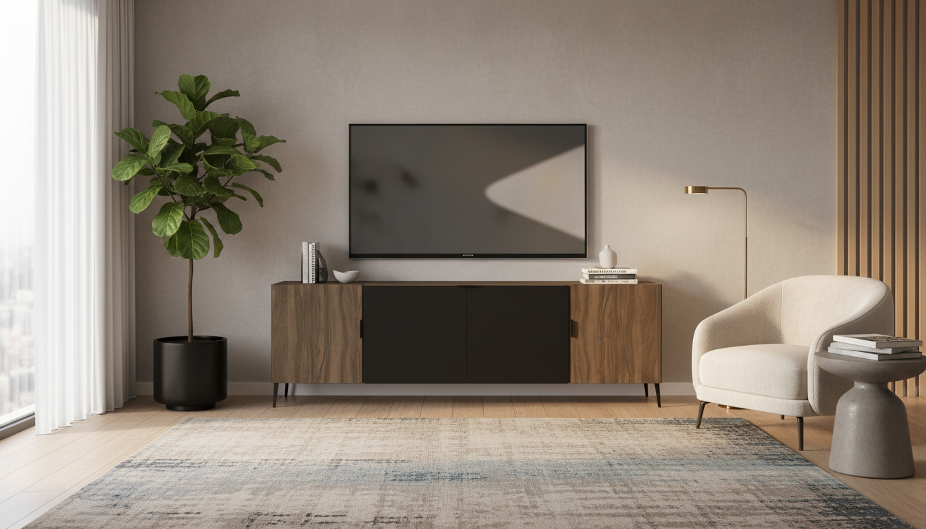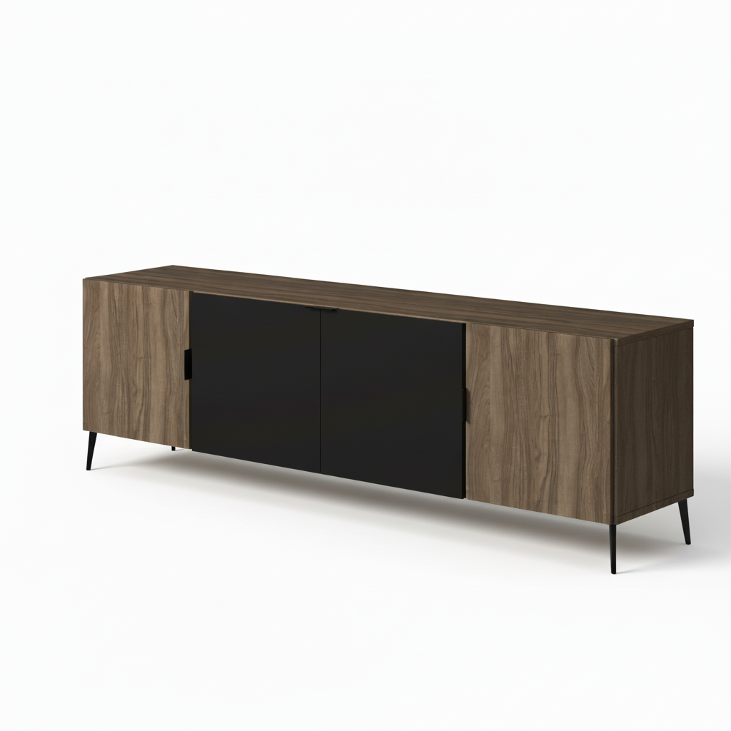 Mueble TV moderno en madera nogal con puertas negras y patas metálicas. Diseño elegante y funcional para TVs grandes, con amplio almacenamiento oculto.
