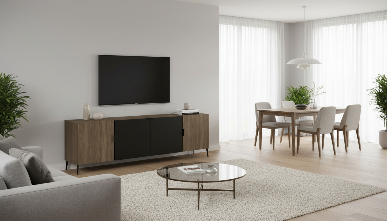 Este mueble TV combina un diseño moderno y elegante con estructura en madera de nogal oscuro y puertas frontales en negro mate, ideal para salones contemporáneos. Sus patas delgadas de metal negro aportan ligereza y estabilidad, elevando la base para una mejor ventilación del televisor. Ofrece amplio espacio de almacenamiento con estantes interiores y cajones ocultos, perfecto para consolas, reproductores y accesorios multimedia. Las medidas exactas son 180 cm de ancho, 45 cm de alto y 40 cm de fondo, adaptándose a TVs de hasta 75 pulgadas. Su acabado resistente protege contra arañazos y humedad diaria, facilitando su integración en cualquier decoración minimalista o industrial. Con un estilo nórdico refinado, realza el espacio audiovisual sin sobrecargarlo visualmente.