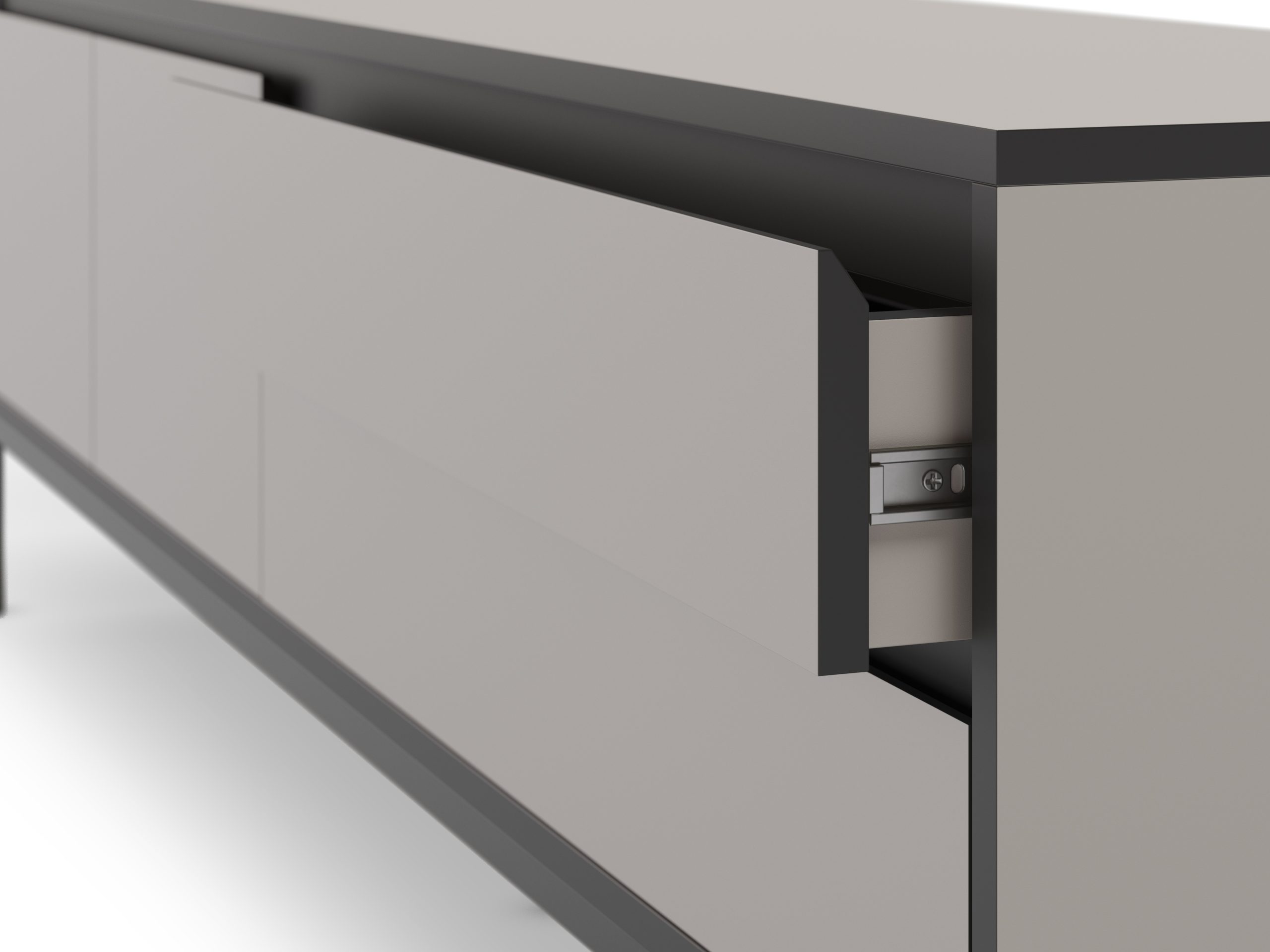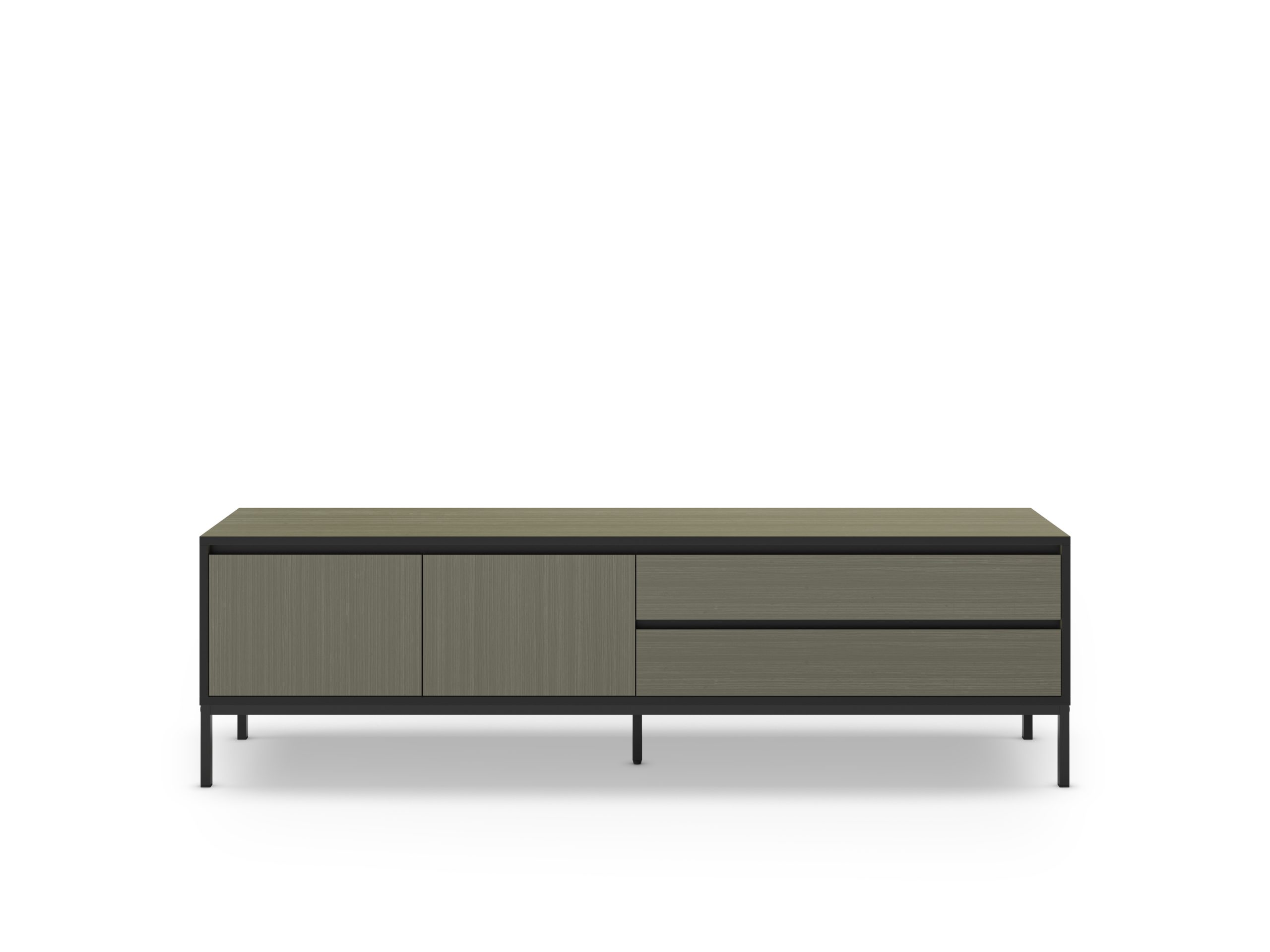 Mueble de TV de diseño minimalista, con estructura metálica elevada sobre patas finas y frontales lisos. Ofrece una puerta y dos amplios cajones para organizar dispositivos, cables y accesorios, manteniendo el salón ordenado y actual.