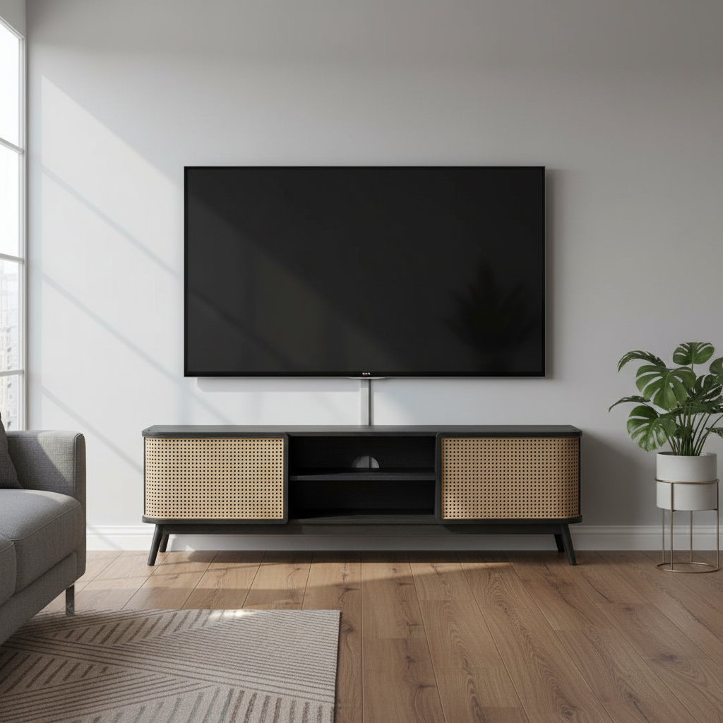 El Mueble TV Manila destaca por su diseño elegante y natural, combinando estructura de madera maciza con puertas laterales tejidas en ratán que aportan un toque cálido y bohemio al salón. Sus patas elevadas de madera ofrecen estabilidad y ligereza visual, mientras que el compartimento central abierto facilita la colocación de televisores y dispositivos electrónicos, con espacio adicional detrás para gestión de cables. Las puertas laterales ocultan estanterías interiores para un almacenamiento ordenado de mandos, reproductores o accesorios, integrándose perfectamente en estilos escandinavos, nórdicos o coloniales modernos. Este mueble eleva cualquier estancia con su acabado sobrio y texturas orgánicas, promoviendo un ambiente acogedor y funcional sin sobrecargar el espacio. Su construcción robusta asegura durabilidad a largo plazo, ideal para hogares con luz natural abundante.