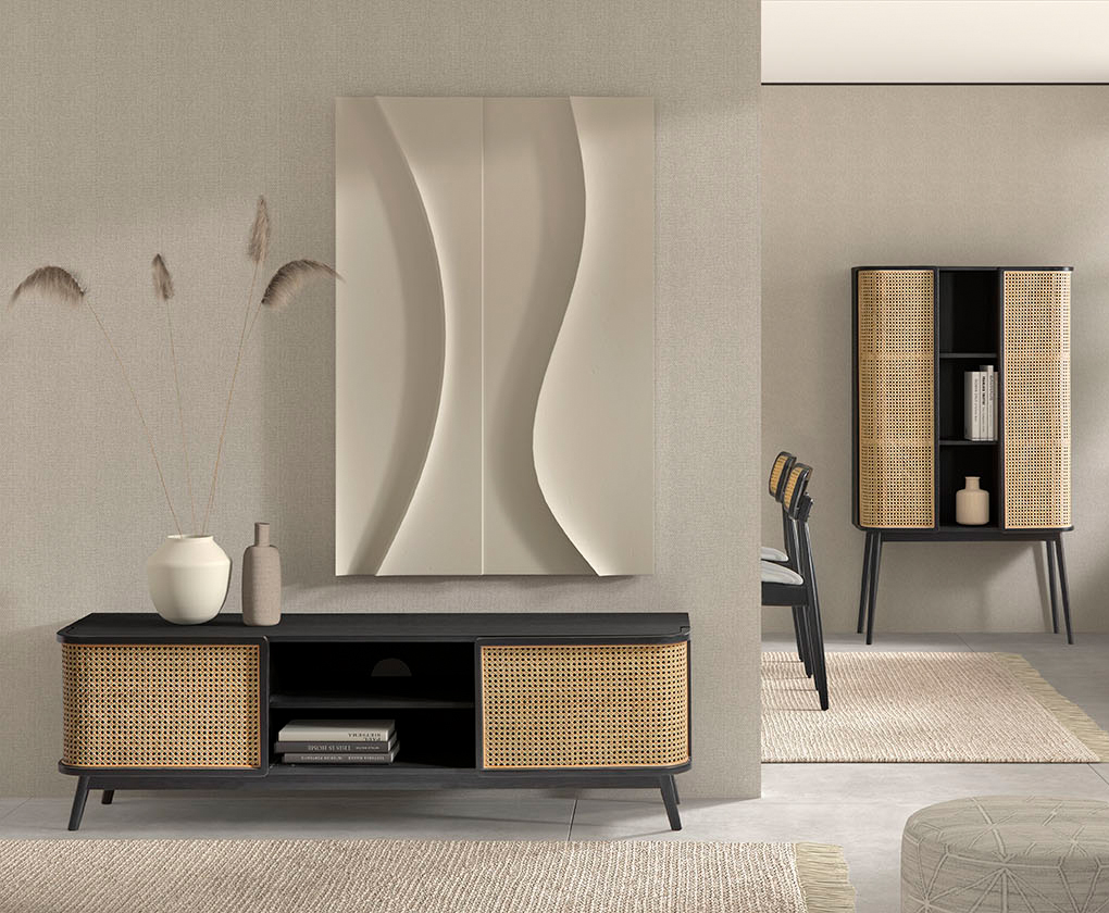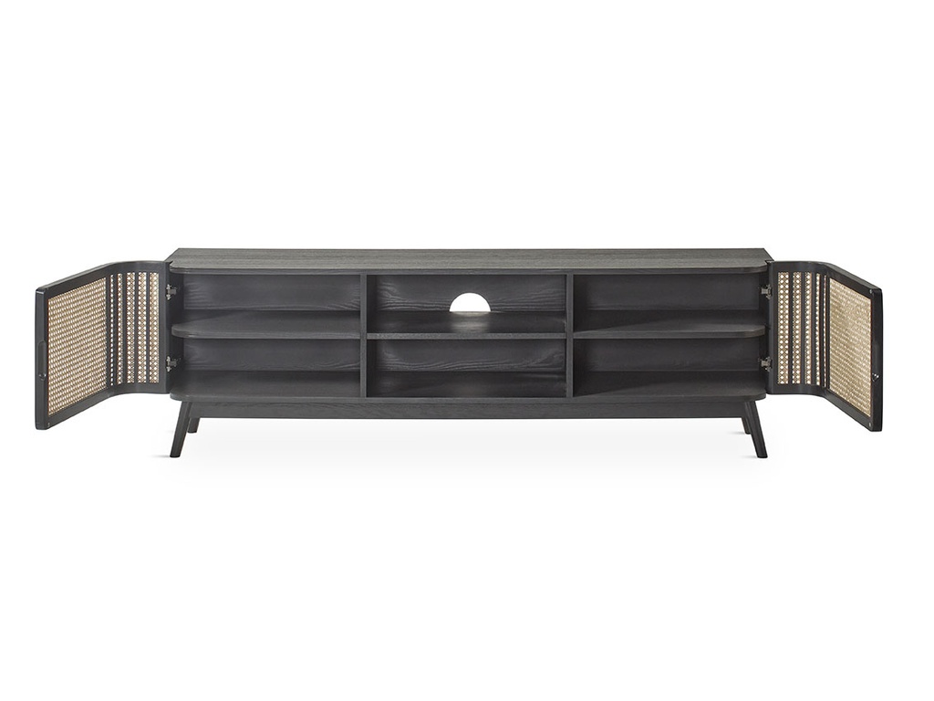 Mueble TV Manila de madera maciza con patas elevadas y puertas de ratán natural. Diseño funcional con zona central para TV y almacenamiento oculto, perfecto para salones modernos.