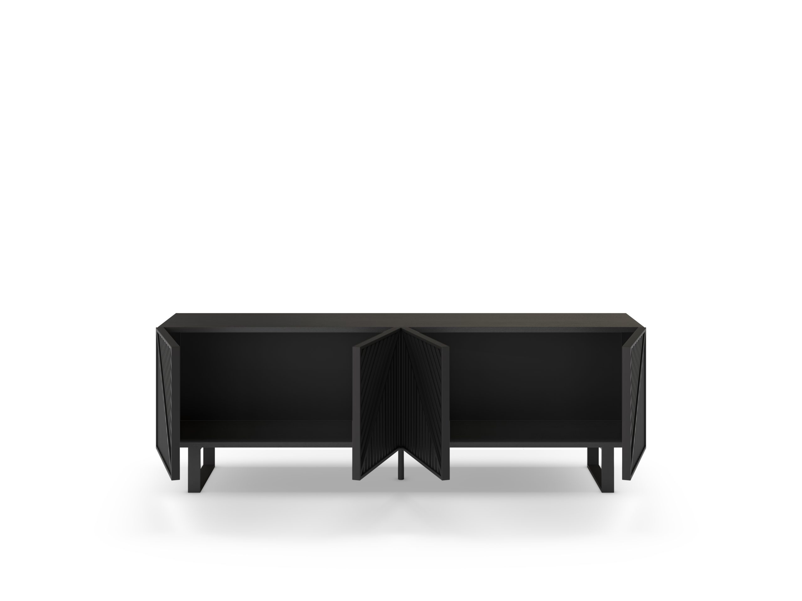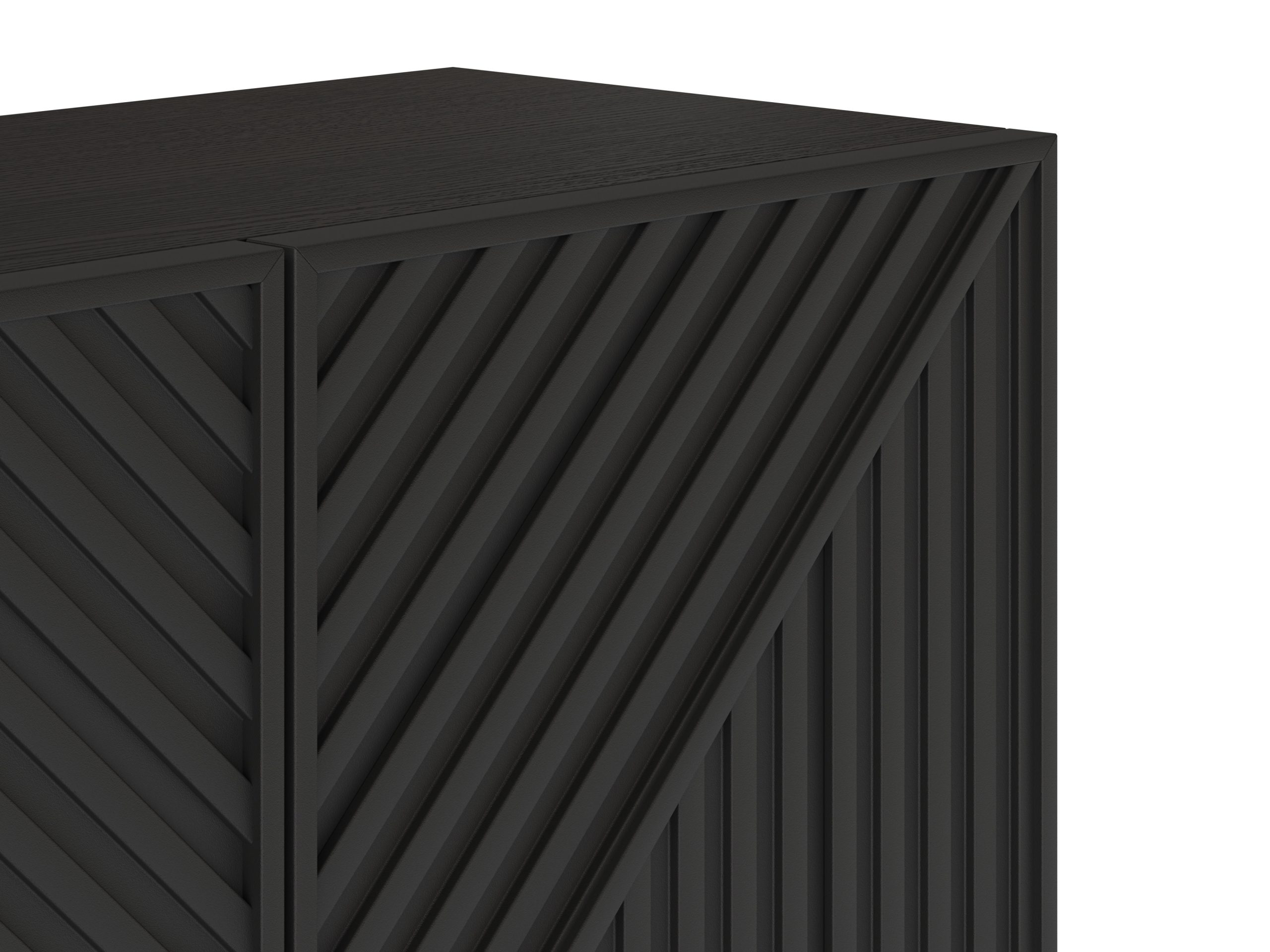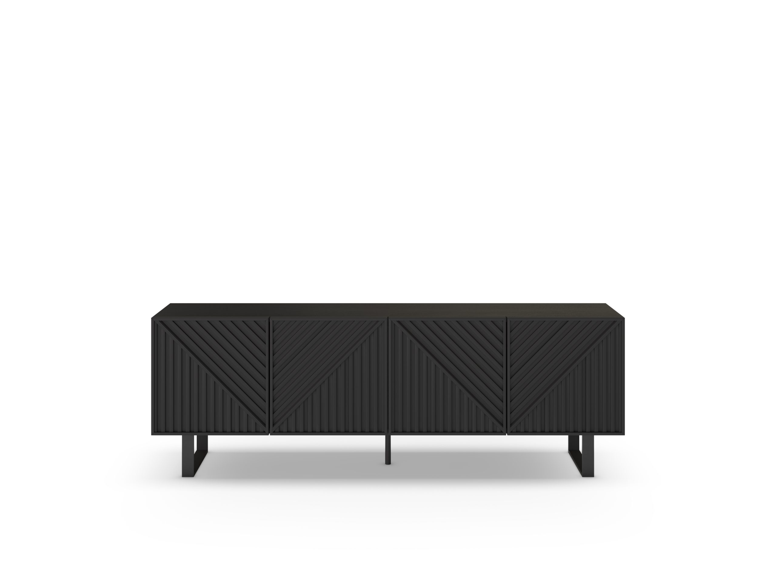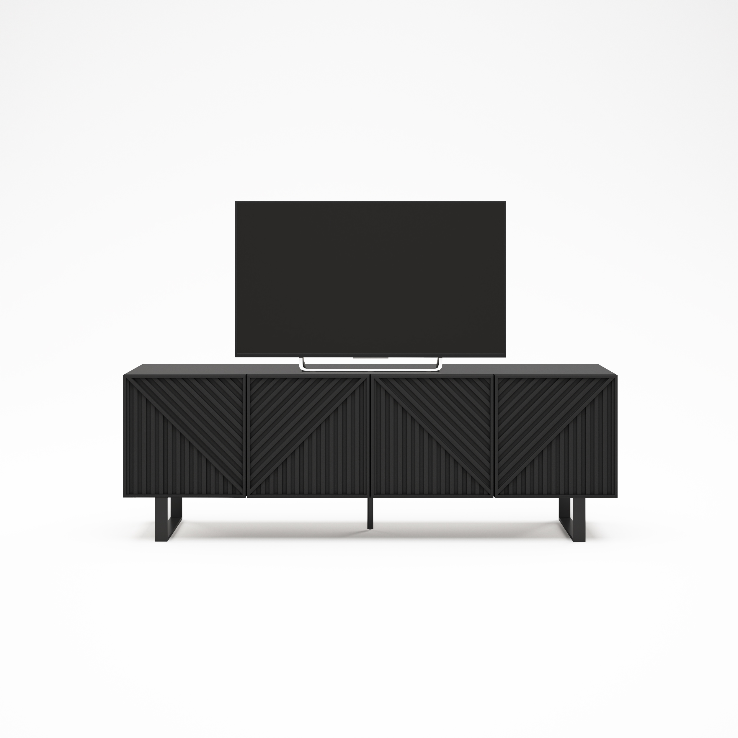 Mueble de TV de líneas modernas con puertas frontales estriadas en patrón geométrico, que aporta carácter y relieve al salón. Ofrece amplio espacio de almacenaje interior y una base elevada que facilita la limpieza y la ventilación de equipos electrónicos.
