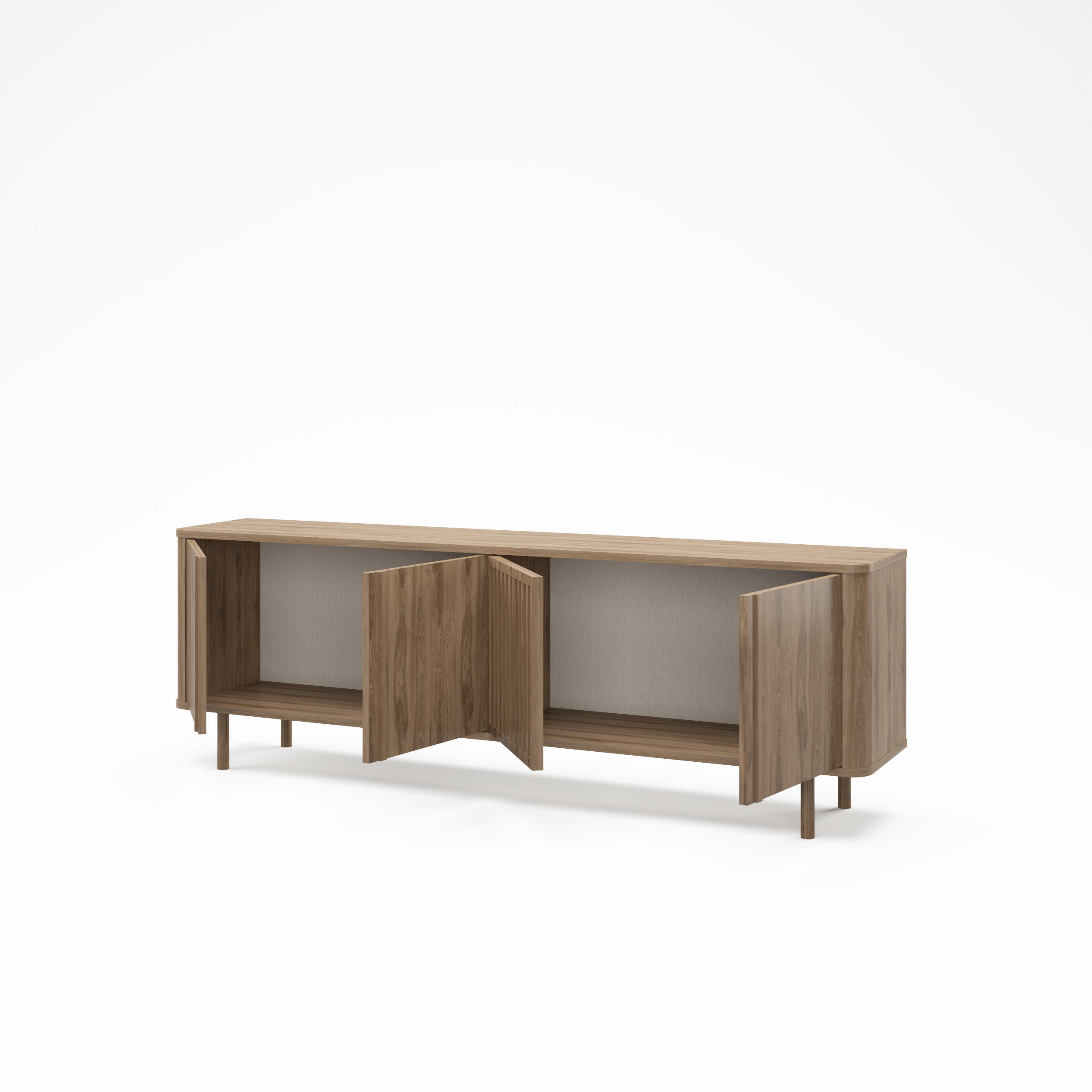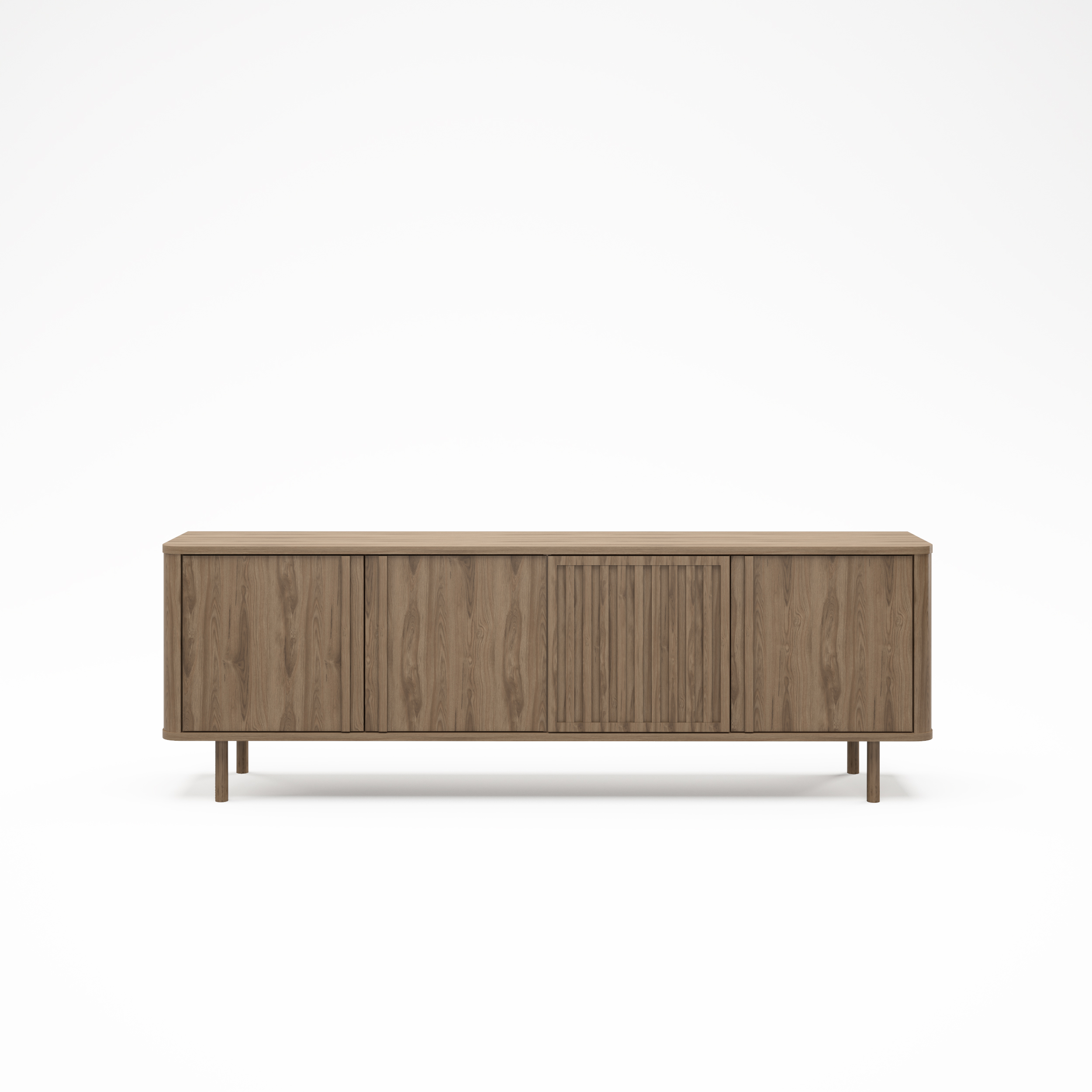 Mueble de TV de líneas rectas y diseño minimalista, con puertas lisas y panel central acanalado que aporta textura. Ofrece amplio espacio de almacenaje interior y se eleva sobre patas estilizadas, ideal para salones contemporáneos.
