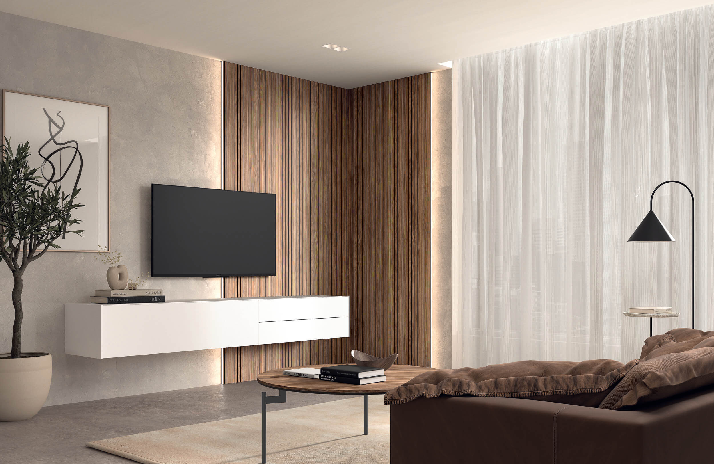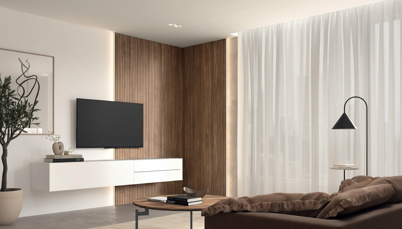 Este panel alistonado transforma la estancia en un ambiente sofisticado y acogedor, integrando la televisión y aportando continuidad visual. Su composición en tonos madera y blanco suaviza la decoración, mejora la percepción del espacio y encaja muy bien en interiores modernos, minimalistas o naturales. La solución resulta decorativa, funcional y fácil de integrar en salones con mobiliario neutro.