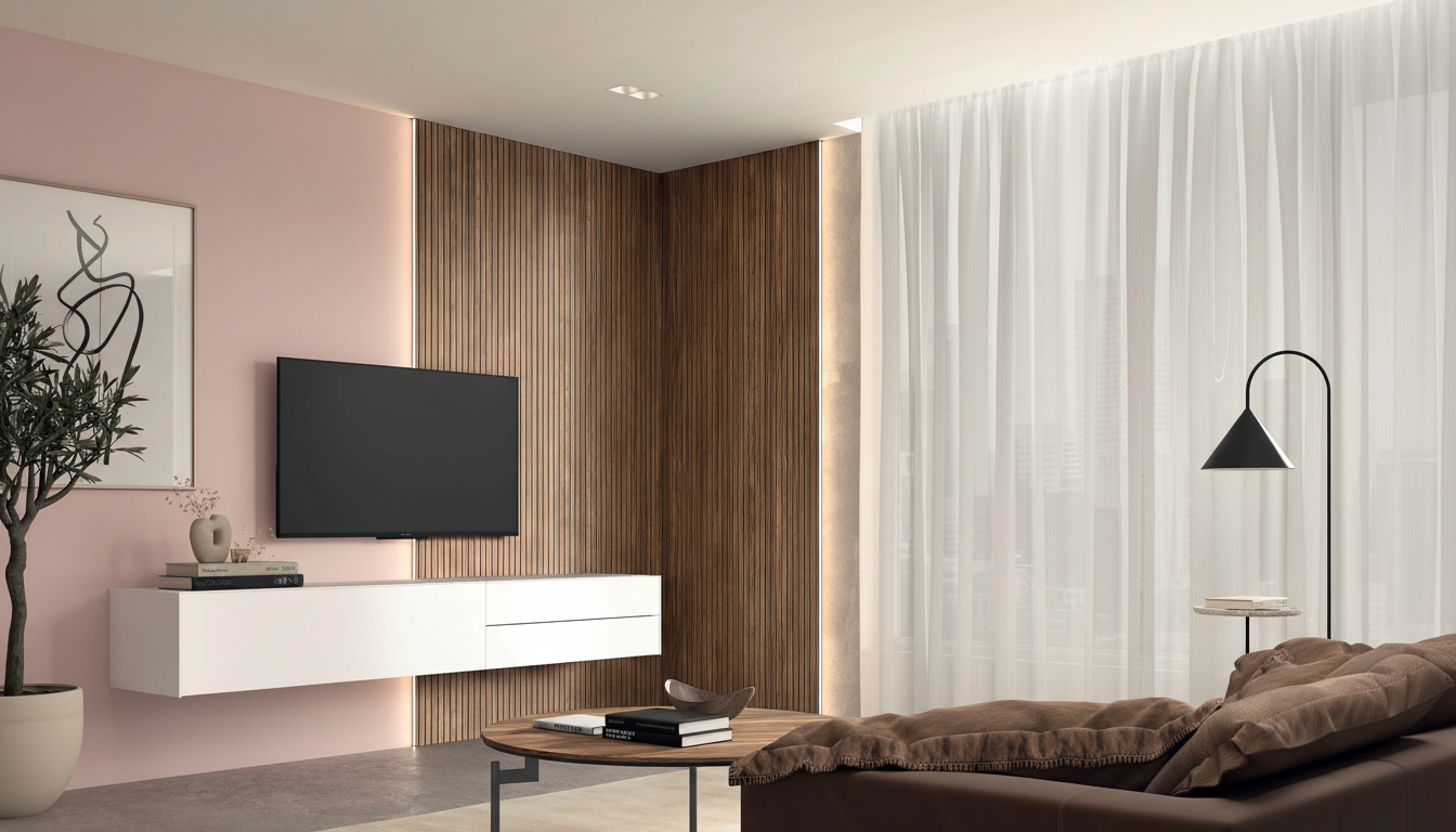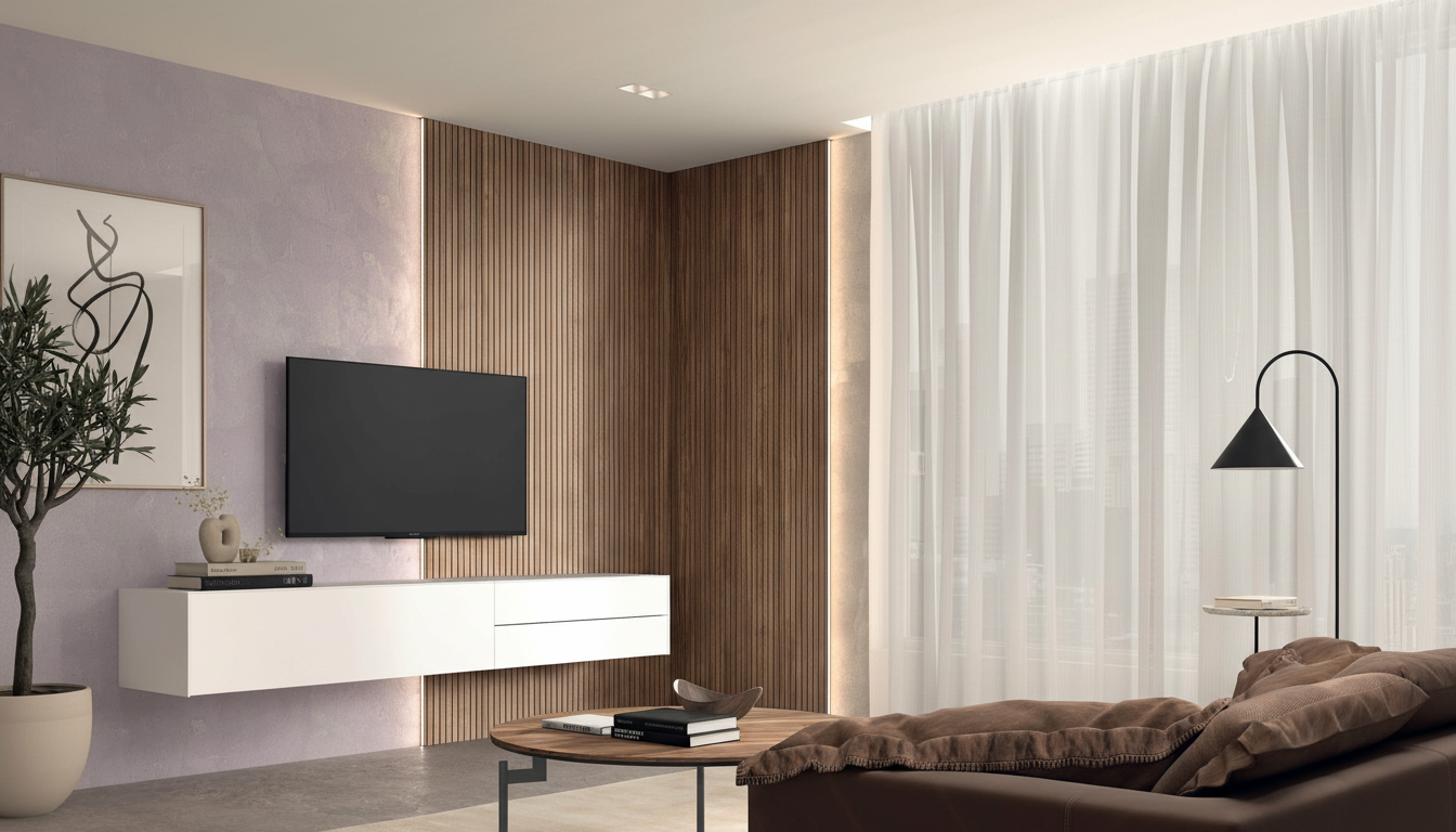 Panel alistonado decorativo en Nogal tierra y Blanco seda, pensado para vestir la pared con un acabado elegante, cálido y actual. Aporta textura, equilibrio visual y un look premium sin necesidad de grandes reformas.