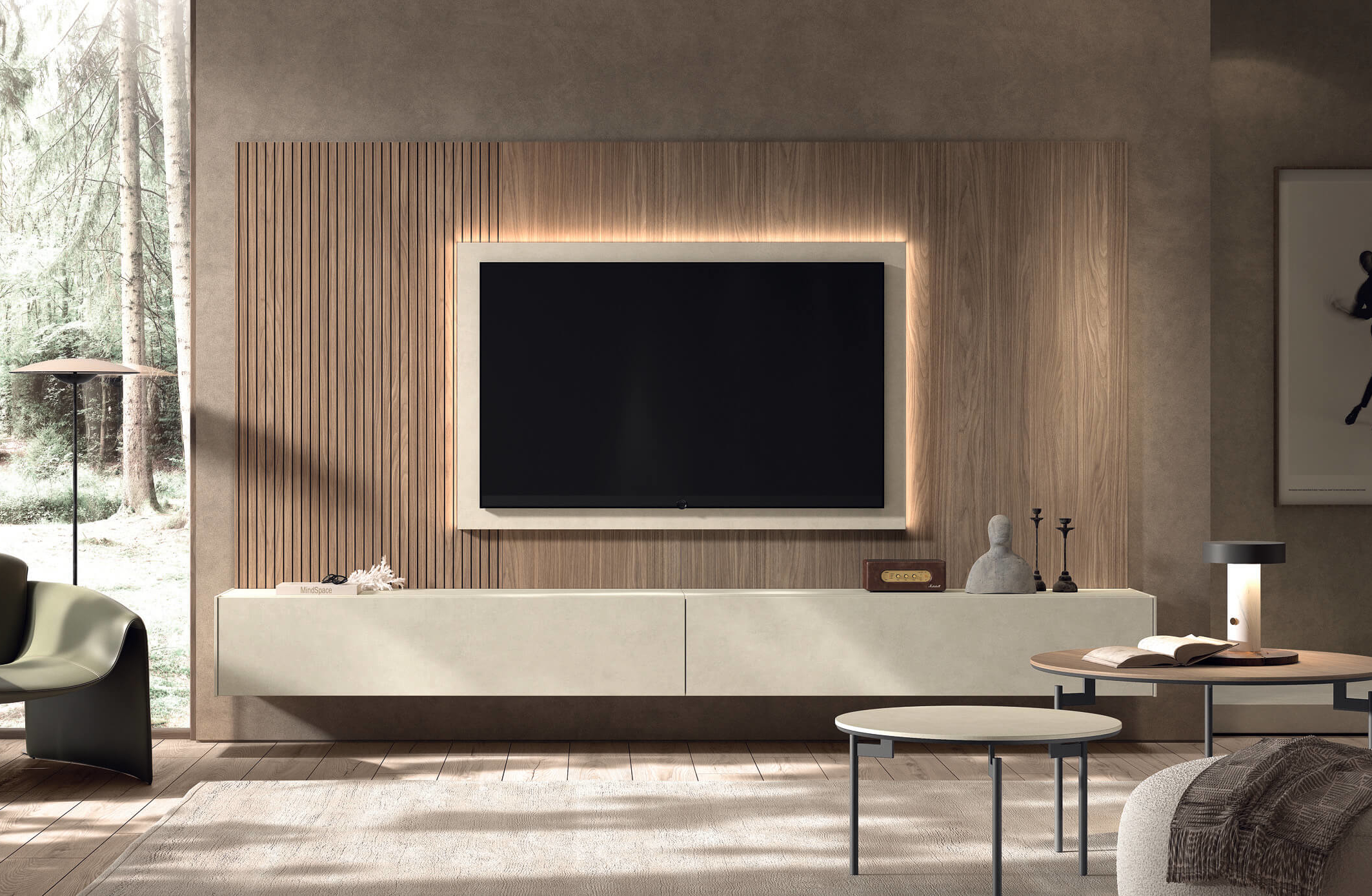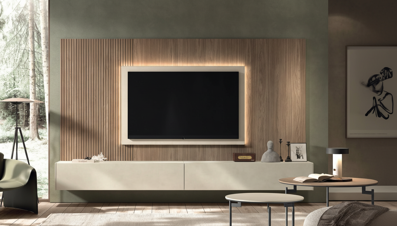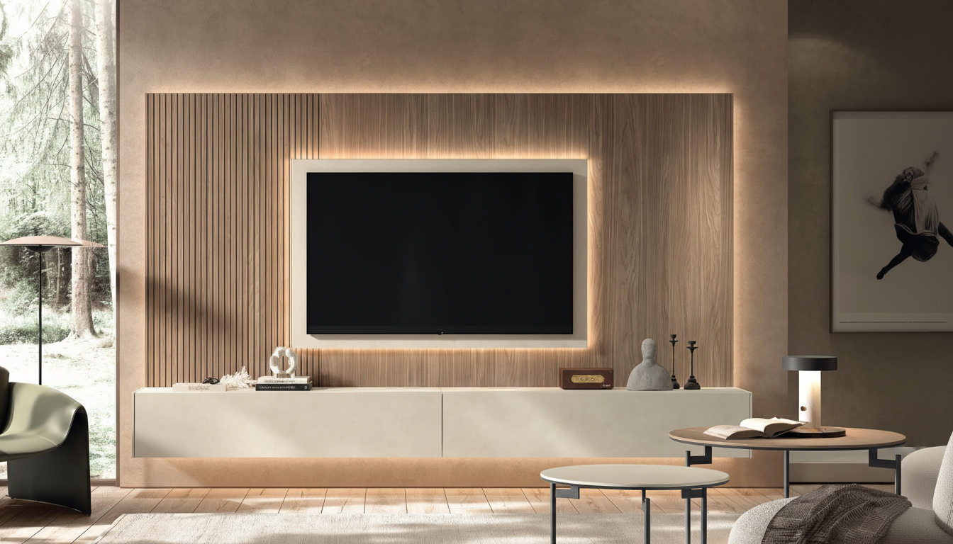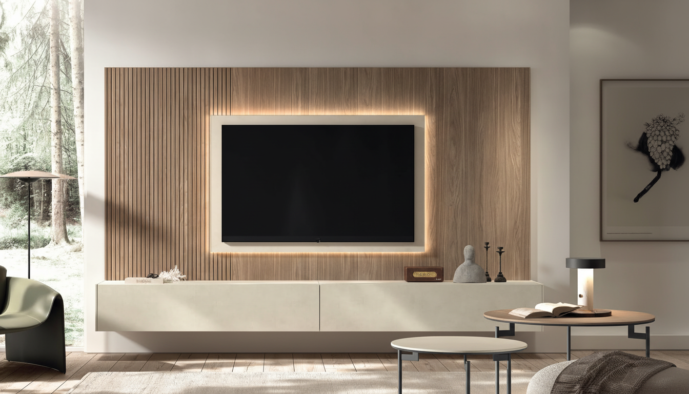 Panel alistonado decorativo de pared para salón, diseñado como fondo de televisión, que combina lamas verticales en nogal tierra con una zona lisa en acabado caliza claro para lograr un ambiente moderno y cálido. Su composición aporta textura, sensación de profundidad y una iluminación perimetral muy agradable alrededor de la pantalla, ideal para salones actuales que buscan integrar la TV como un elemento más de la decoración. Es perfecto para crear una pared protagonista, ocultar pequeñas imperfecciones y ordenar visualmente la zona audiovisual del hogar.