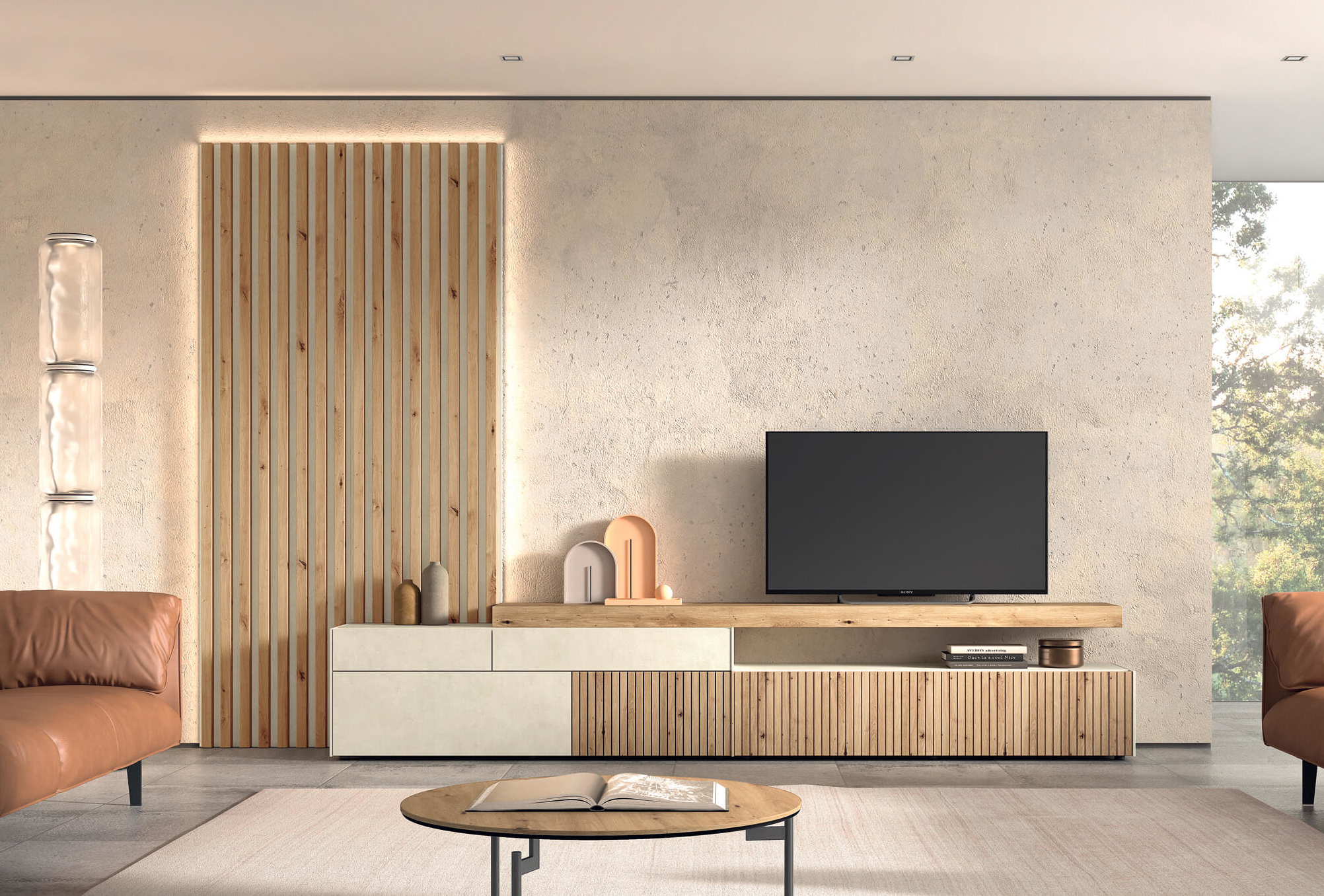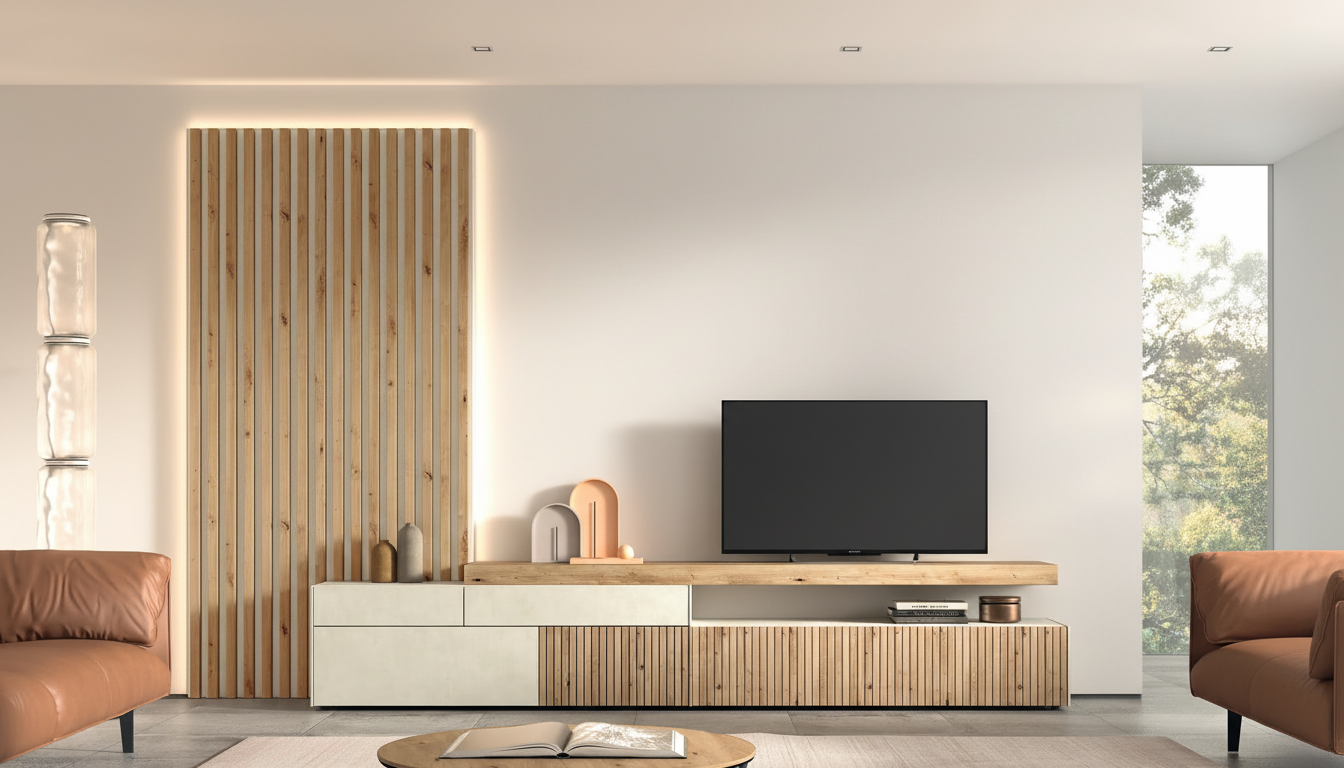 Revestimiento de listones de roble artesano sobre caliza claro con módulos funcionales e iluminación integrada, para paredes elegantes y acogedoras.