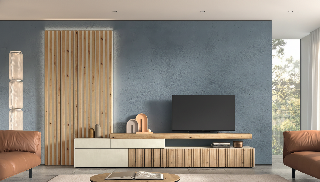 El Panel Alistonado es un revestimiento decorativo premium para paredes y techos, compuesto por listones verticales de roble artesano sobre base de caliza claro, que crea un efecto de profundidad y calidez natural. Con anchura total de 362 cm y altura de 240 cm, integra módulos blancos con cajones y estantes, iluminados por LED sutiles, ideal para salones modernos o espacios residenciales en Galicia. Su diseño lineal genera juegos de luces y sombras dinámicos, mejorando la acústica y el aislamiento térmico, mientras combina la rusticidad de la madera con la elegancia minimalista de la piedra. Fácil de instalar mediante machihembrado o adhesivos, resiste humedad sin deformarse y aporta un toque sofisticado y sostenible, perfecto para ocultar imperfecciones murales. Este panel eleva cualquier interior con su textura táctil y versatilidad, fusionando materiales nobles en una pieza a medida de alta durabilidad.