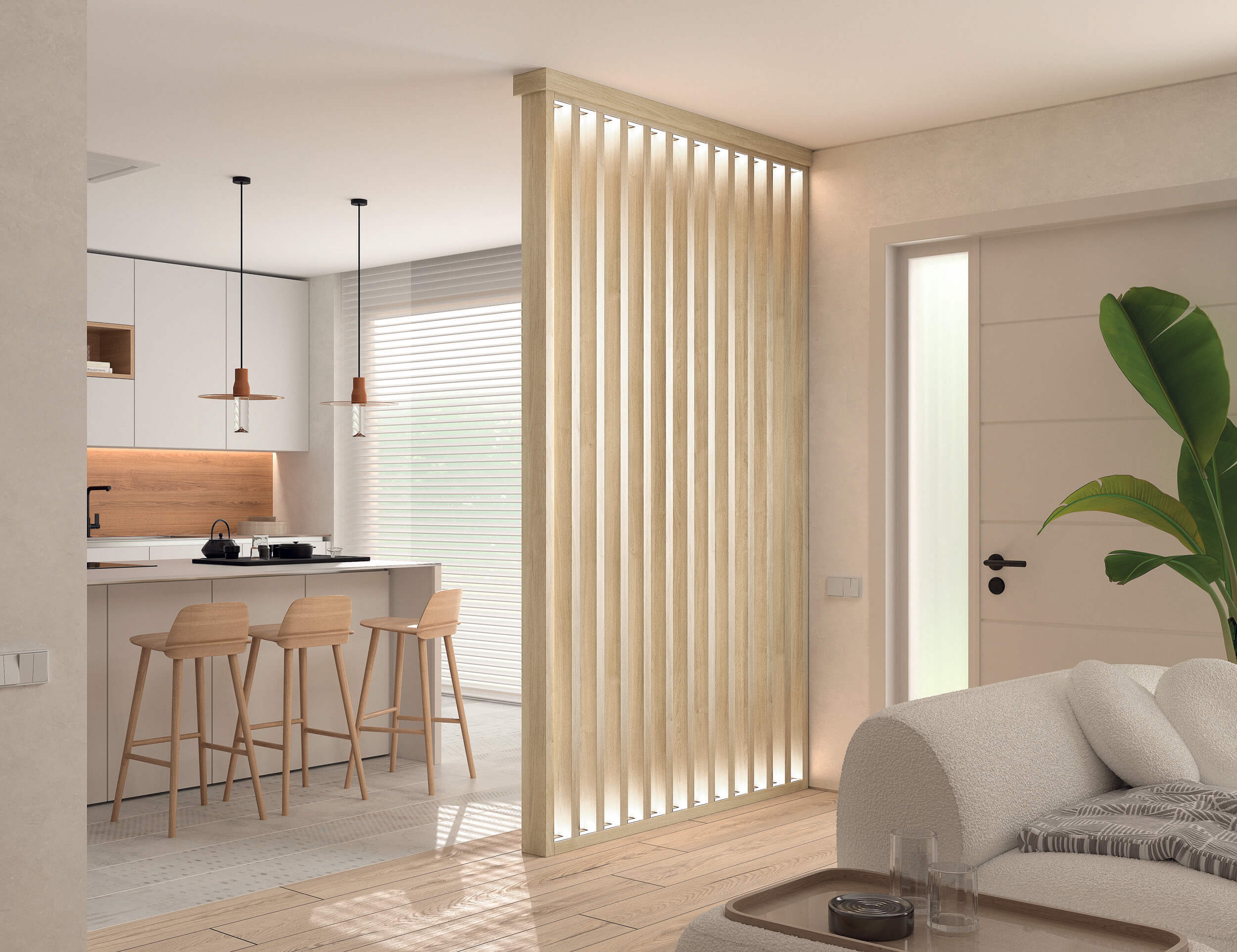 Separador en un ambiente de salón y cocina. Un espacio muy luminoso donde el roble claro aporta serenidad en las dos estancias.