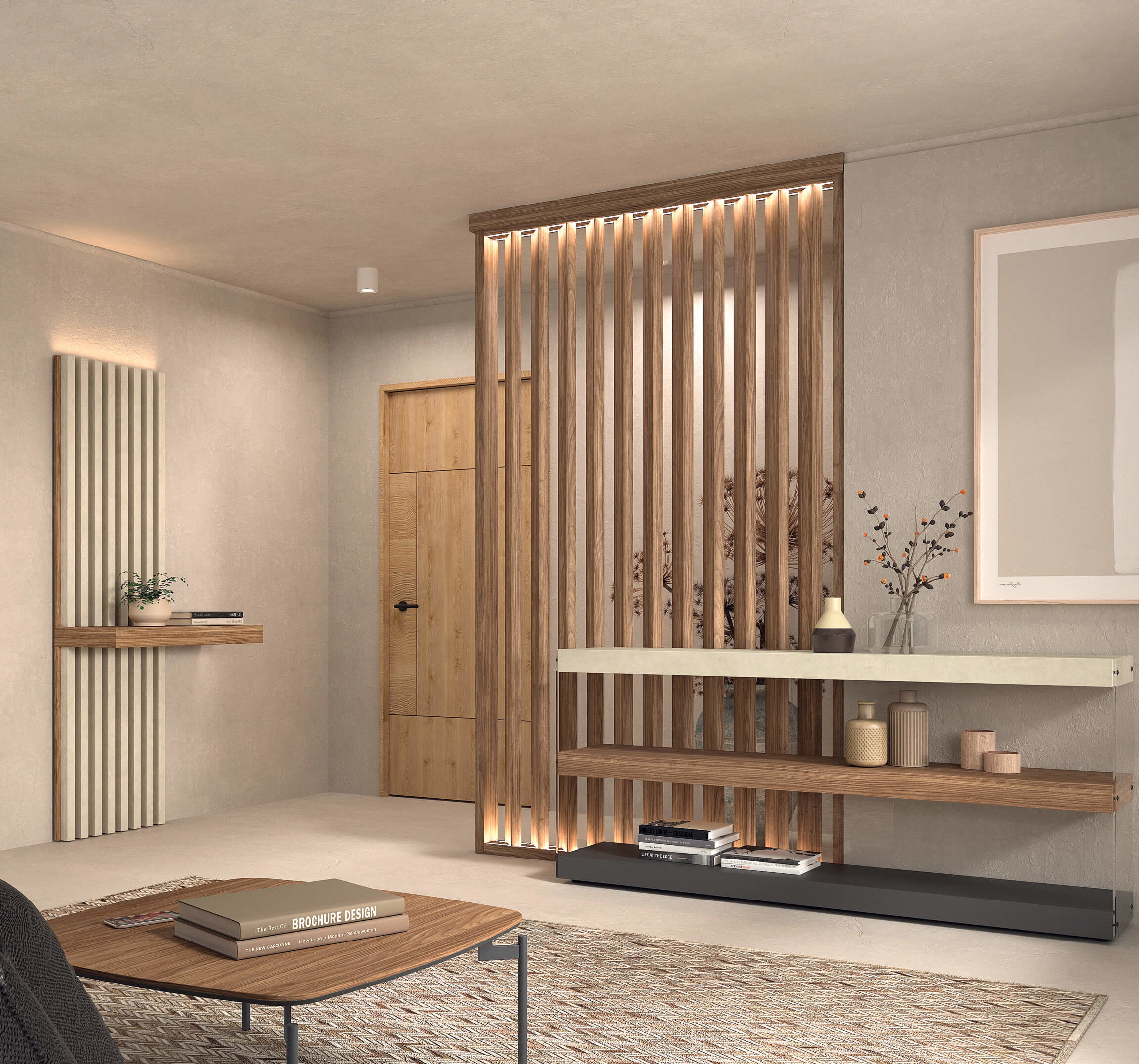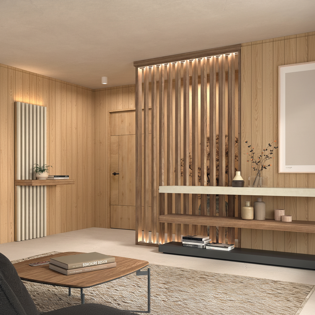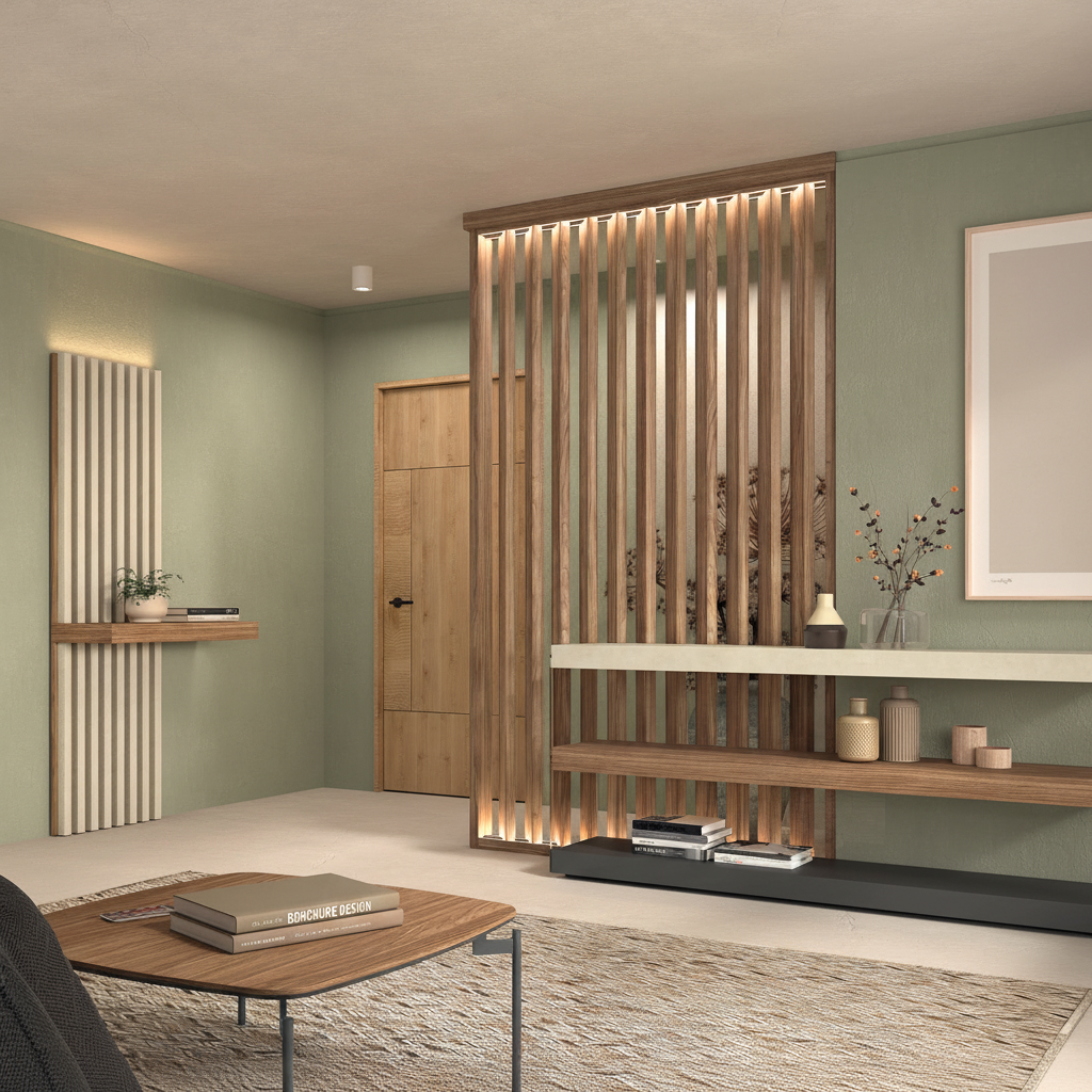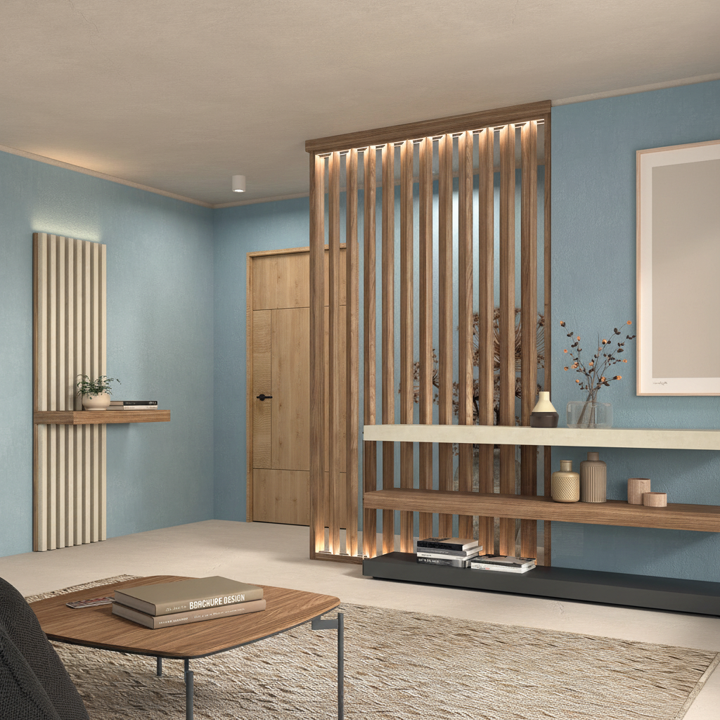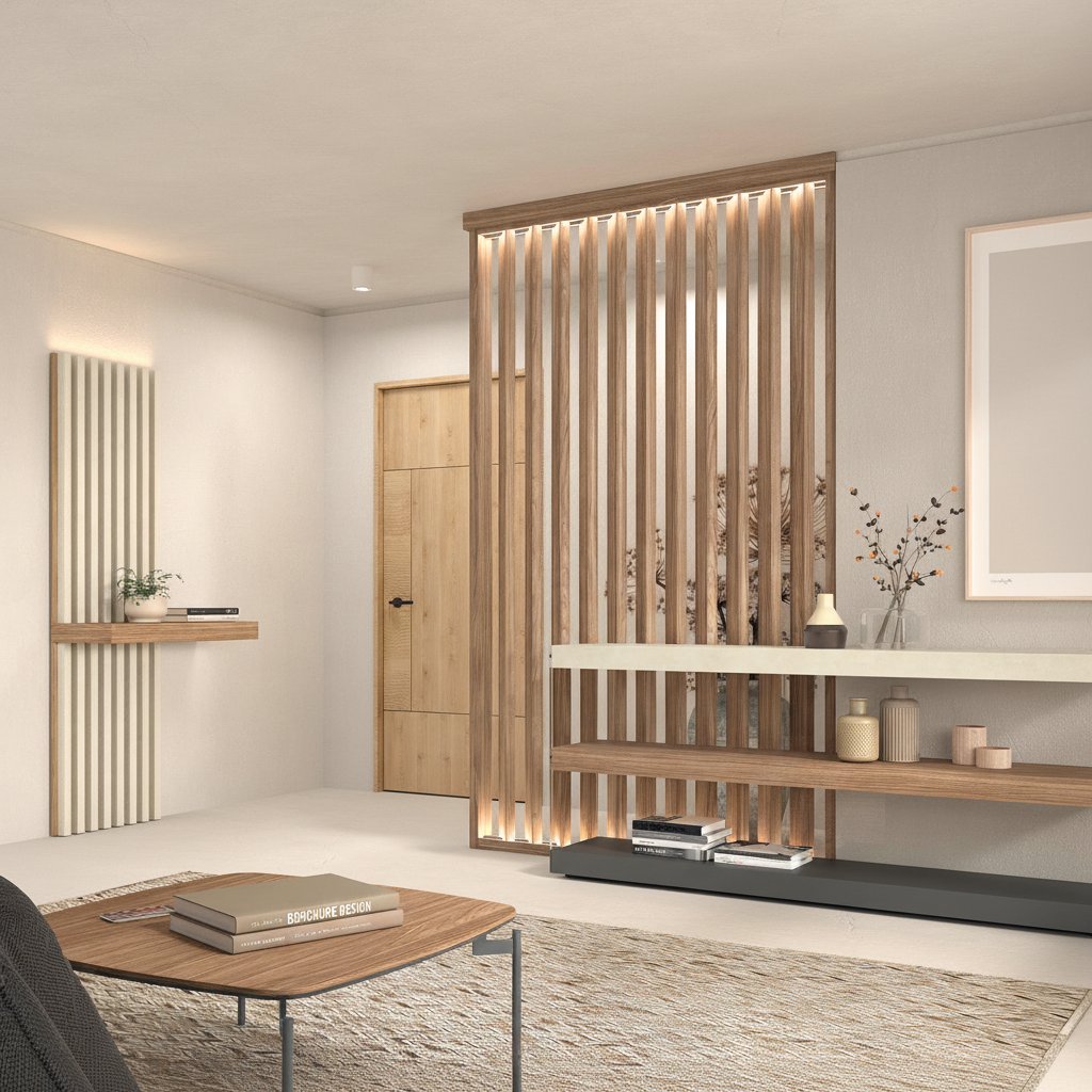 Separador de ambientes con panel alistonado a techo en nogal tierra, combinado con detalles en caliza claro y base en gris pizarra. Aporta calidez, ligereza visual y un estilo moderno ideal para salones y recibidores actuales.