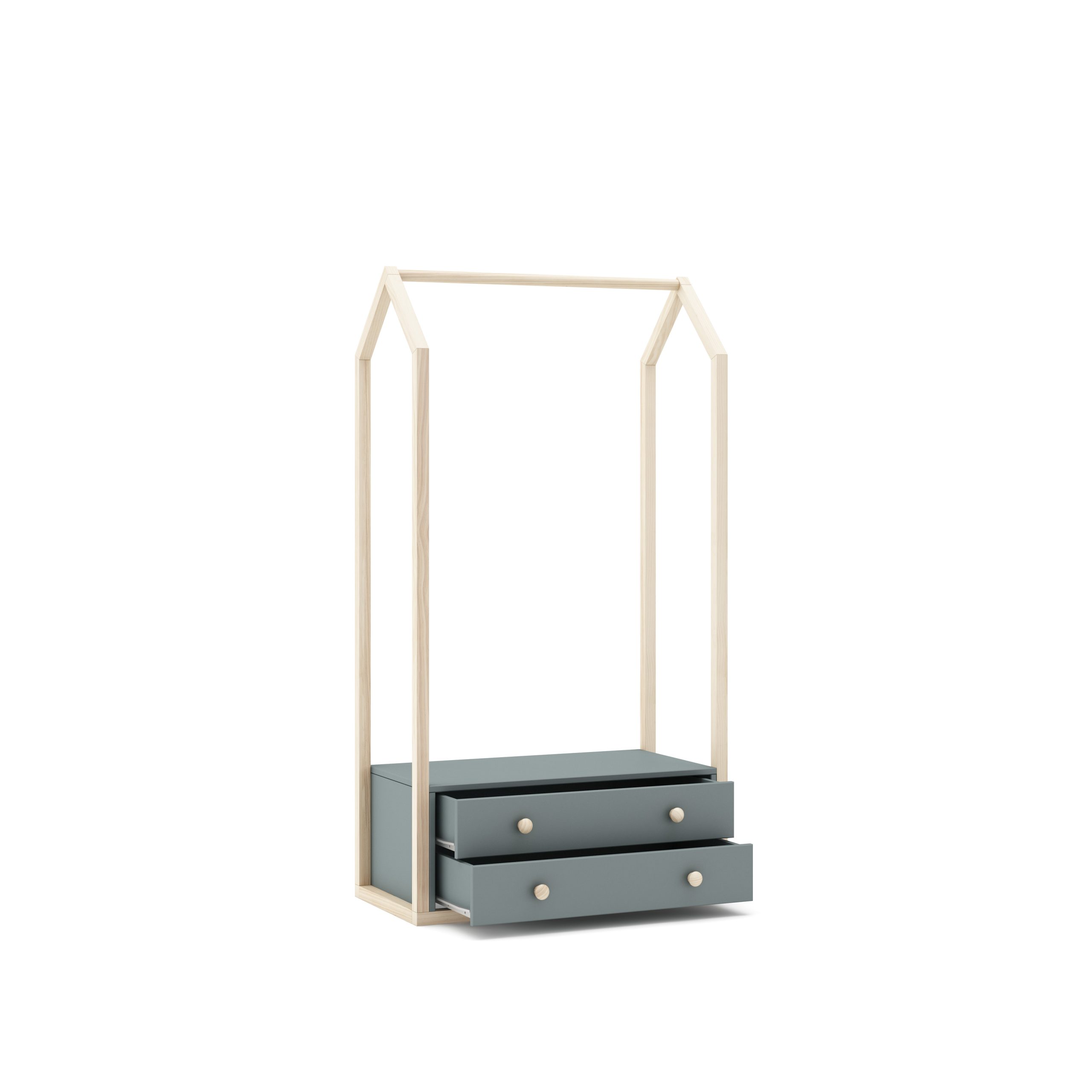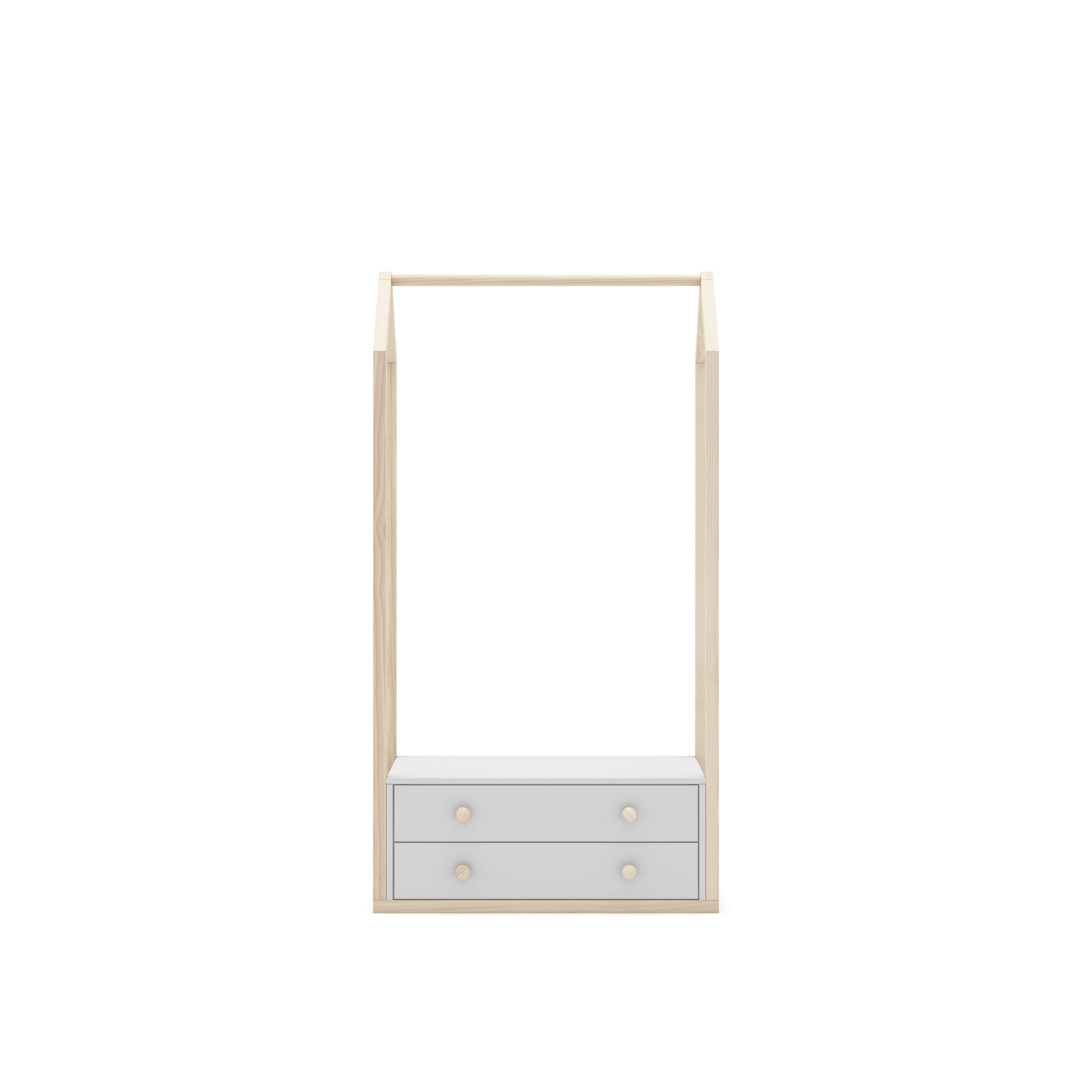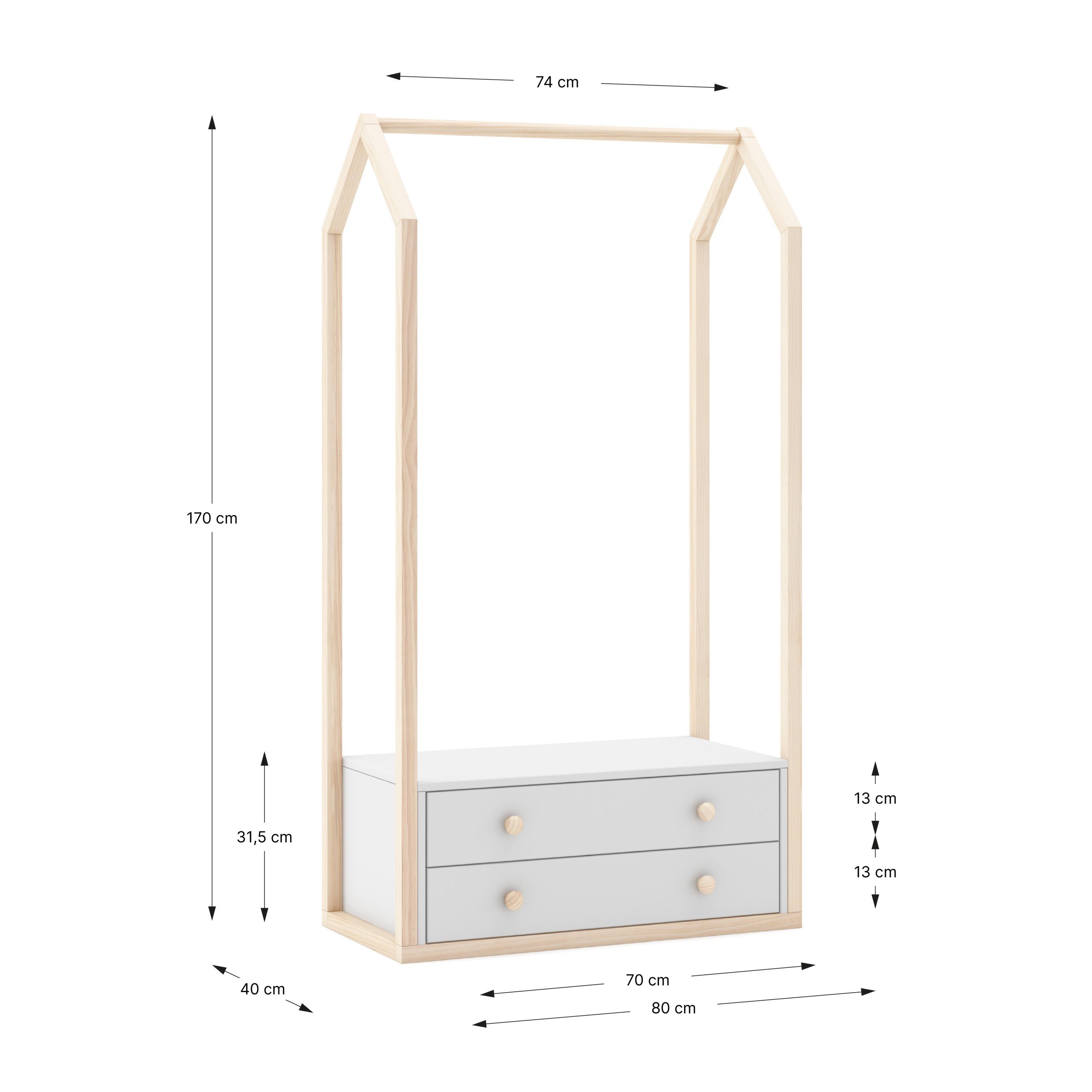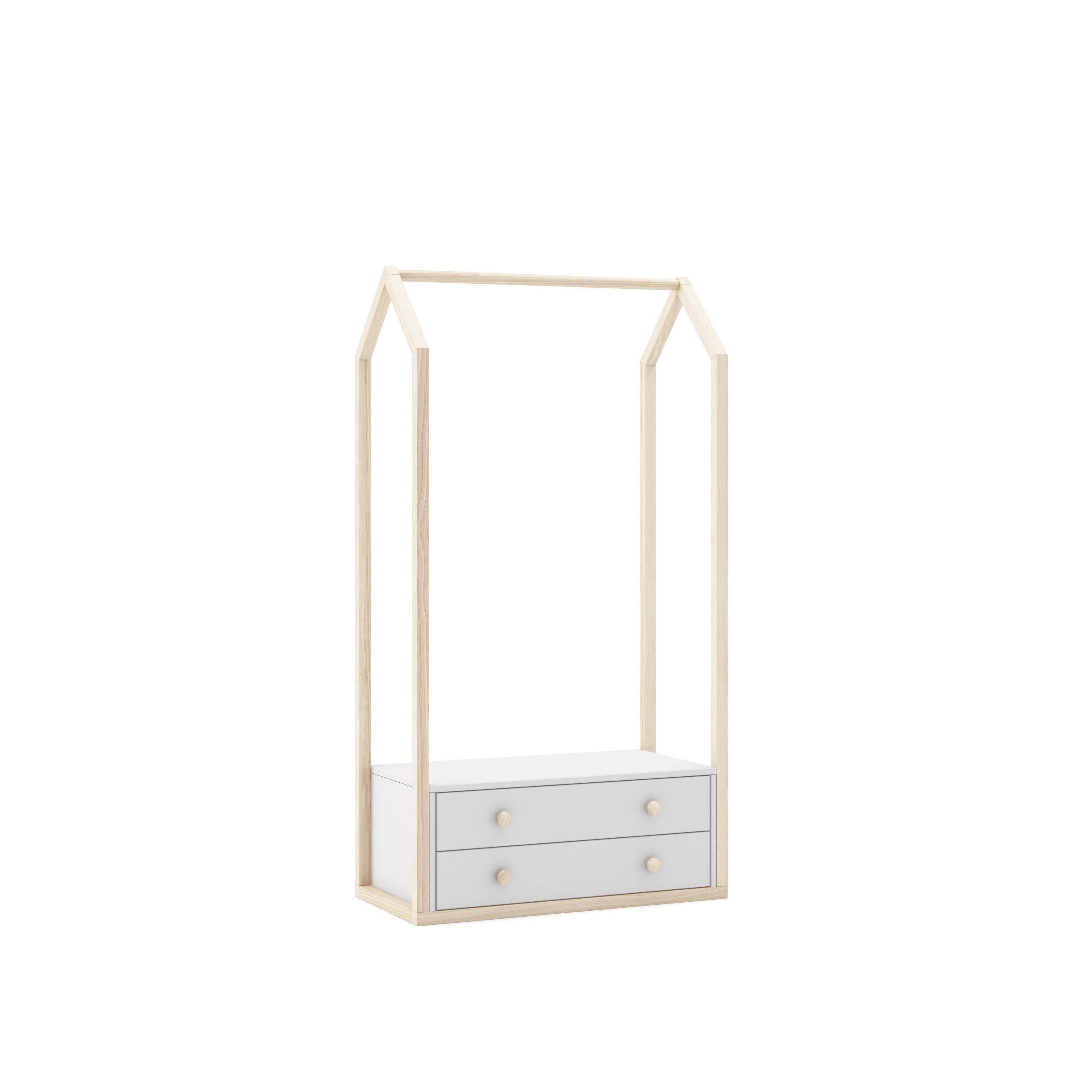 Estructura alta con barra para colgar y dos cajones en la base. Fabricado en pino y DM para resistencia y naturalidad.