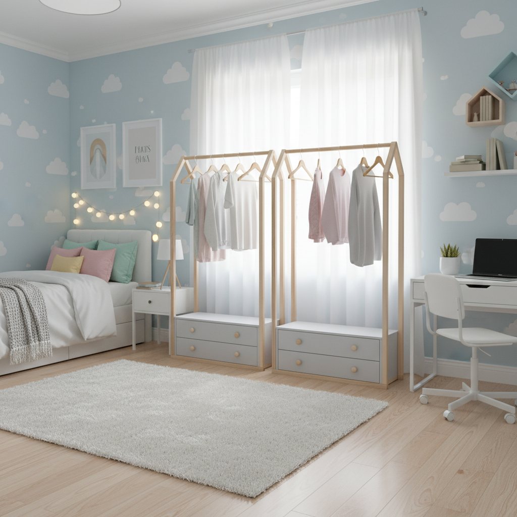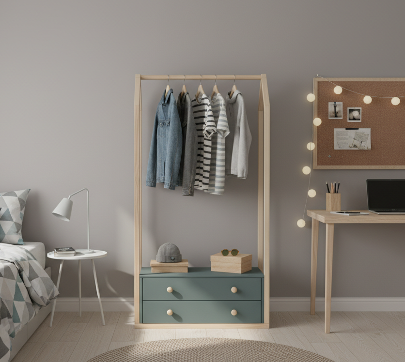Ofrece almacenamiento versátil con barra para prendas largas y cajones para accesorios, optimizando espacio en zonas pequeñas. Su diseño nórdico es estético y funcional.