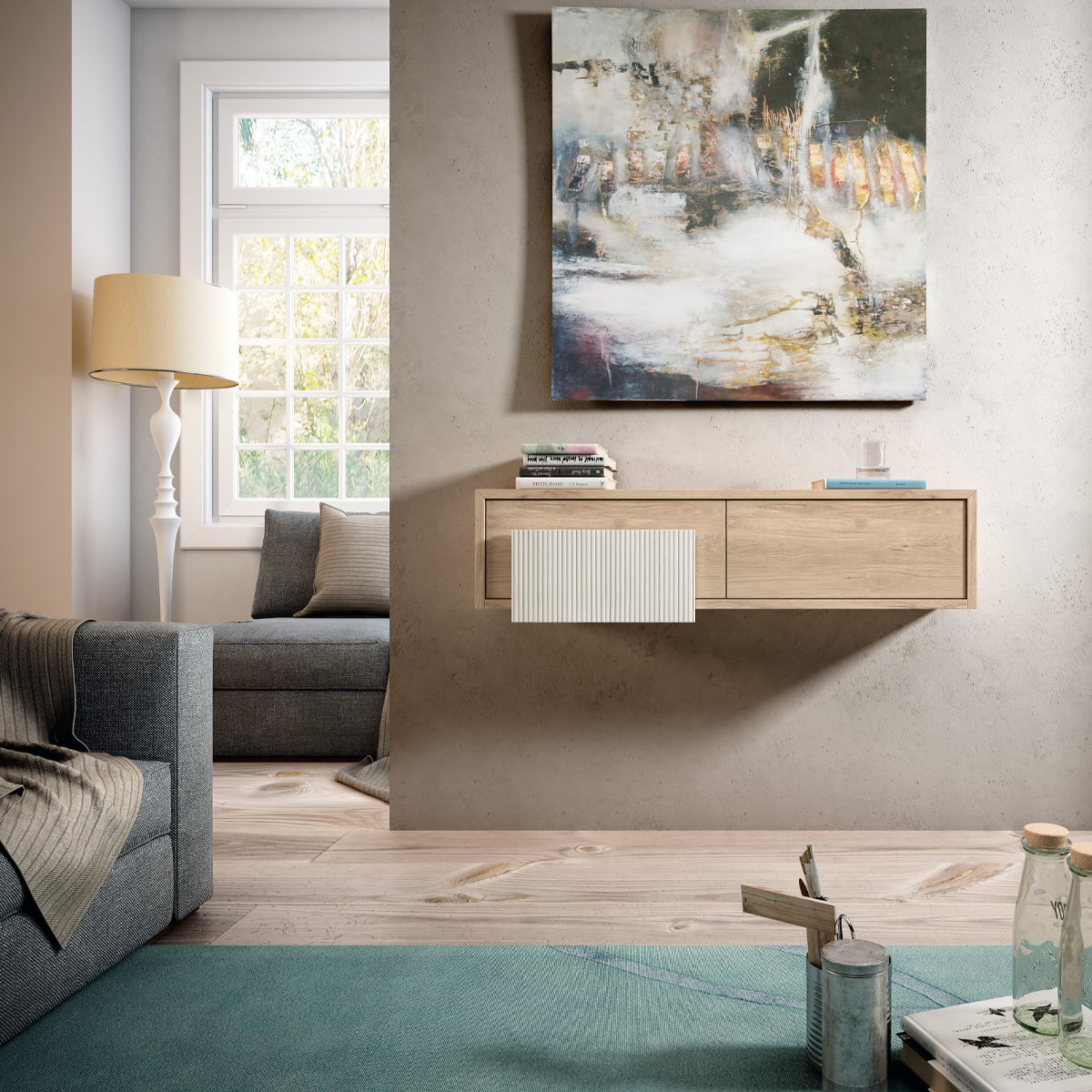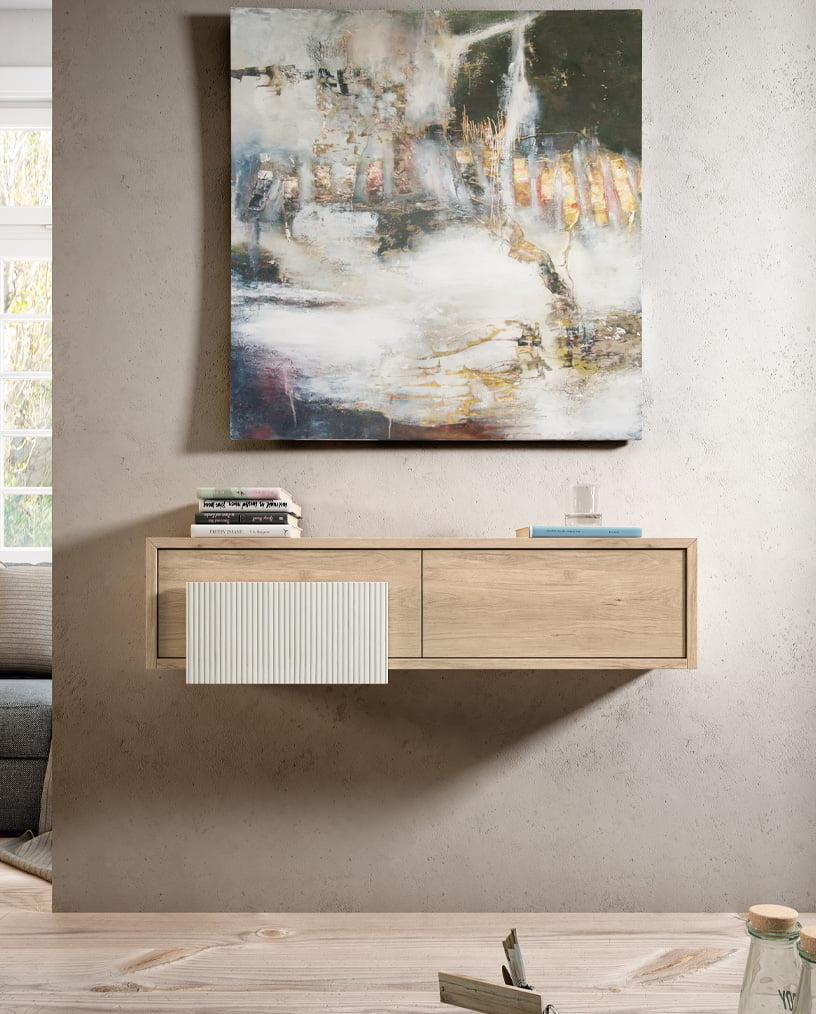 Este recibidor presenta un diseño moderno y minimalista, ideal para hogares contemporáneos. Se caracteriza por sus líneas limpias y estructura suspendida, lo que aporta ligereza visual y aprovecha el espacio en la entrada. Incorpora un elemento decorativo en madera con relieve que añade un toque de sofisticación y contraste, integrando funcionalidad y estilo. Su superficie amplia permite decorar con objetos personales como jarrones, cuadros o bandejas, ofreciendo, además, espacio de almacenamiento cerrado para mantener el orden. Es una pieza versátil que puede adaptarse fácilmente a distintos estilos decorativos y proporciona una bienvenida elegante y práctica al hogar.