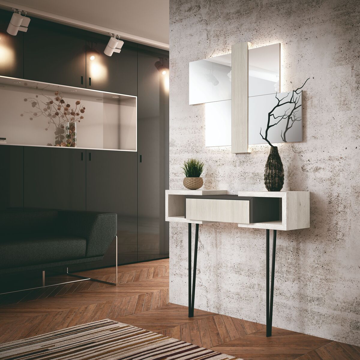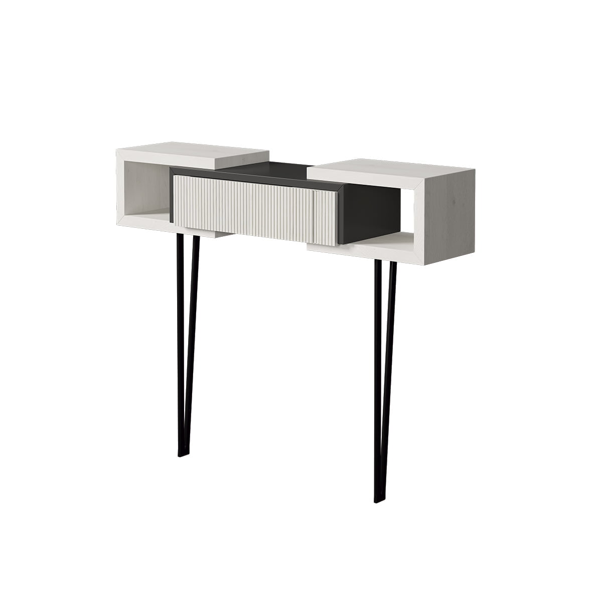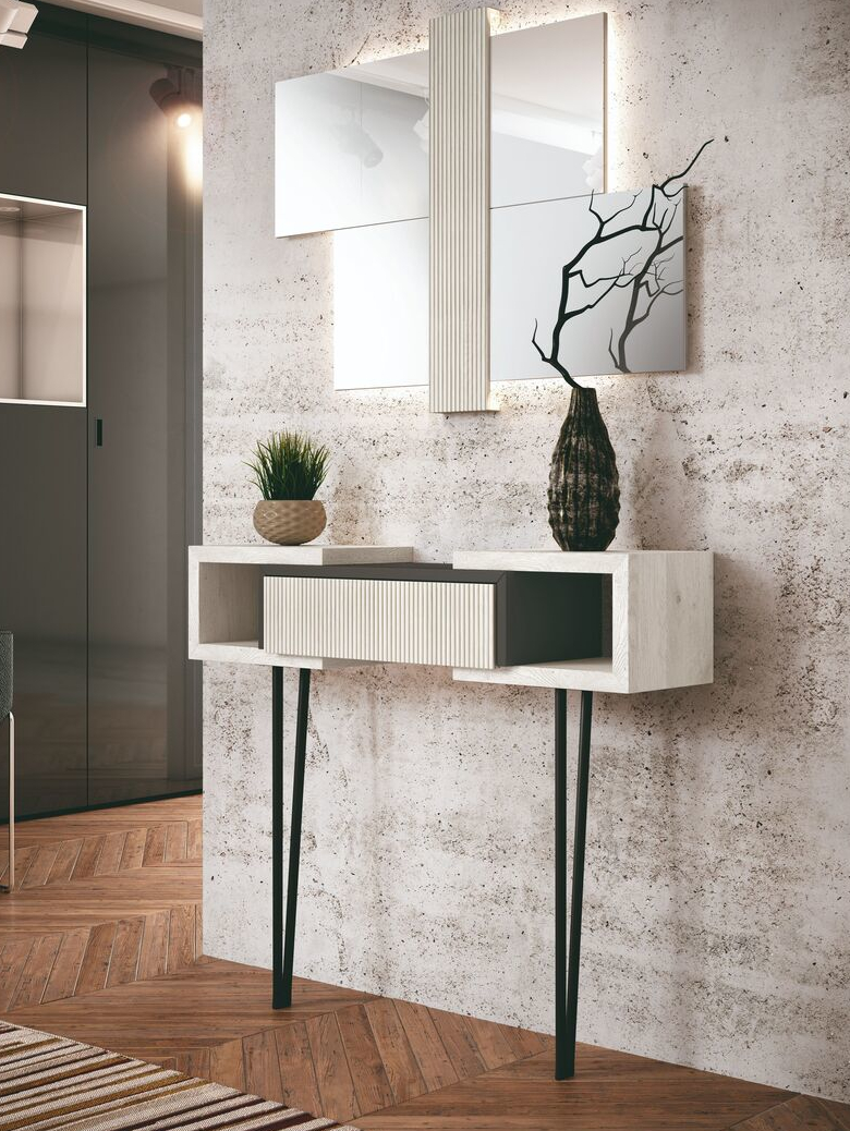 Recibidor de diseño moderno, compuesto por líneas rectas y una estructura elegante. Dispone de dos huecos abiertos laterales y un cajón central con acabado texturizado, sostenido por patas metálicas, ideal para entradas actuales.