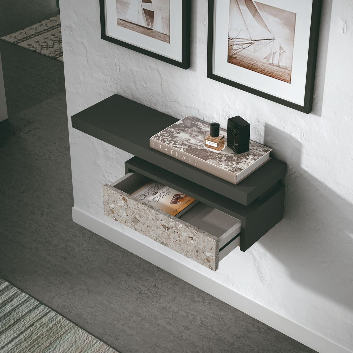 Recibidor de diseño moderno y líneas rectas, ideal para espacios contemporáneos. Incorpora una superficie superior para dejar objetos y un cajón inferior para almacenaje, contribuyendo a mantener la entrada ordenada y funcional.