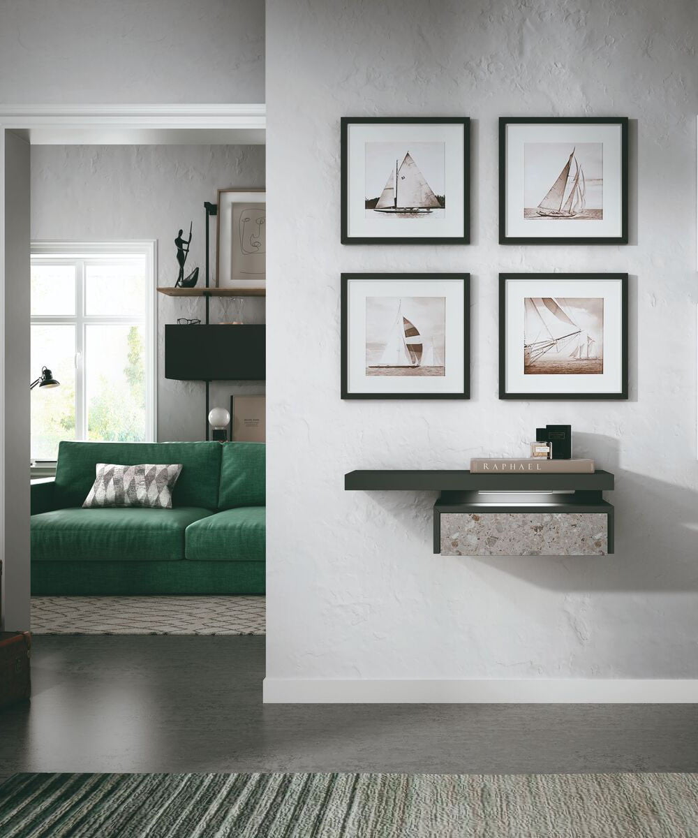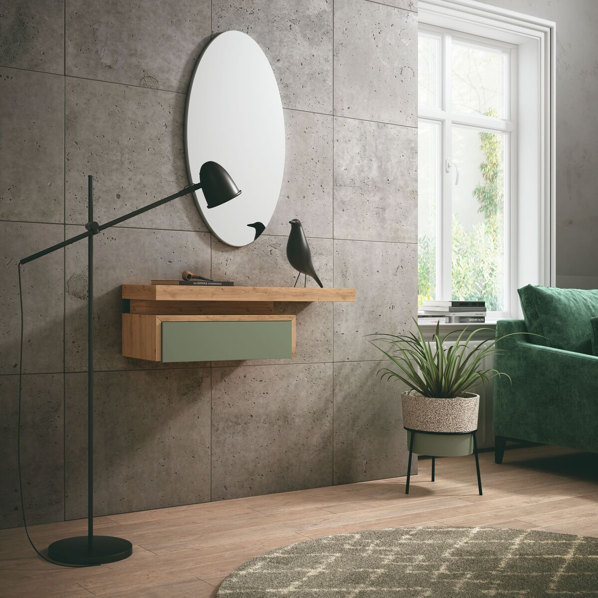Este recibidor destaca por su diseño moderno y minimalista, perfecto para entradas de estilo contemporáneo. Está formado por dos elementos principales: un módulo con cajón de líneas rectas y una superficie superior que sobresale, ideal para dejar objetos al llegar a casa. El conjunto transmite orden y funcionalidad, permitiendo almacenar pequeños accesorios y mantener el espacio despejado. Su estructura suspendida aporta ligereza visual, favoreciendo la sensación de amplitud. Los acabados en madera y el frente en acabado liso crean un ambiente acogedor y sofisticado. Este recibidor es una opción elegante y práctica para cualquier hogar.