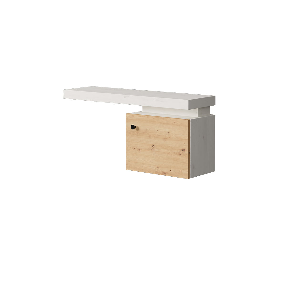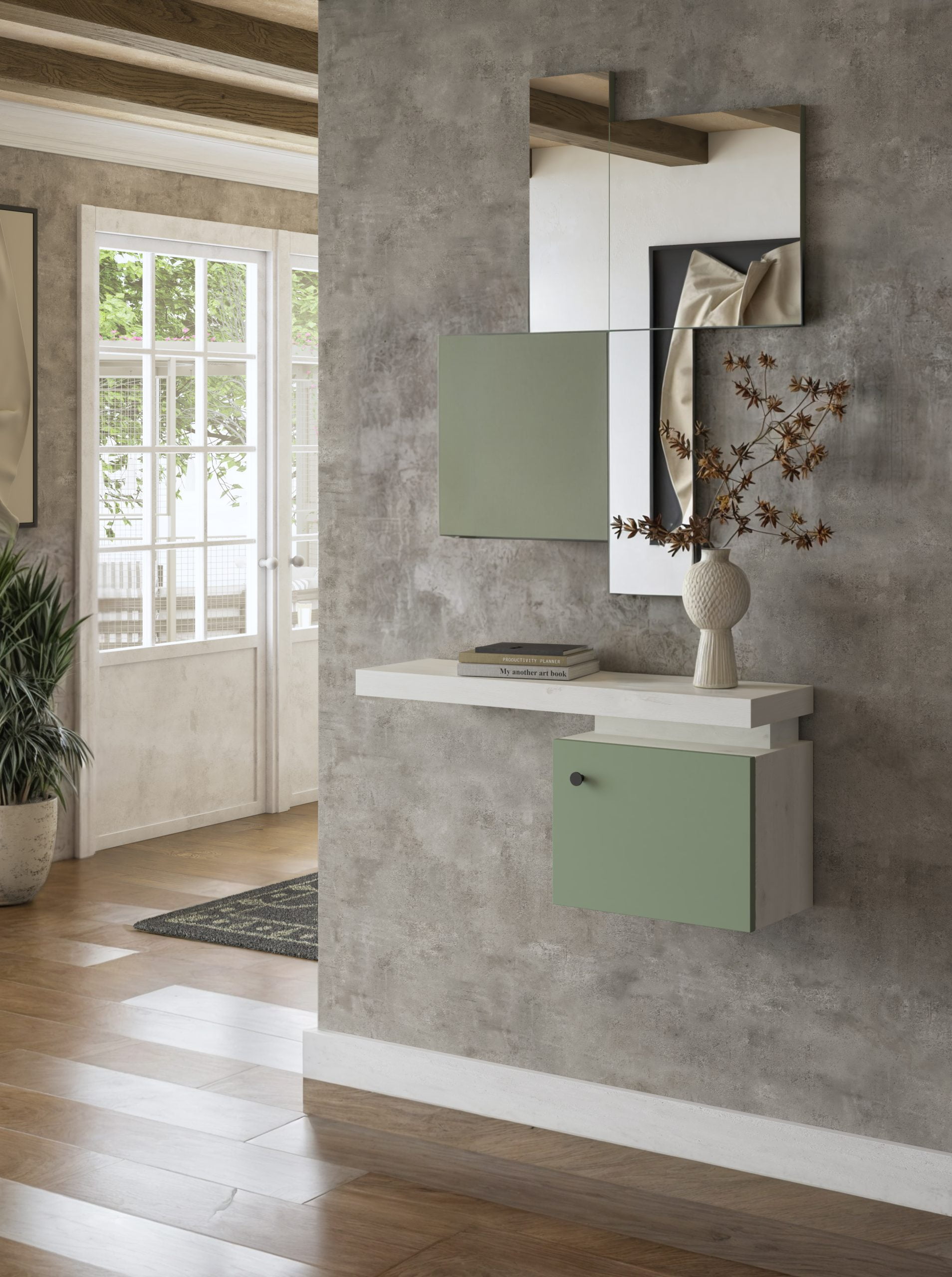 Recibidor de diseño moderno y líneas rectas, ideal para espacios pequeños. Incluye una práctica superficie para dejar objetos y un módulo cerrado para almacenamiento. Su estilo minimalista aporta funcionalidad y elegancia al hogar.