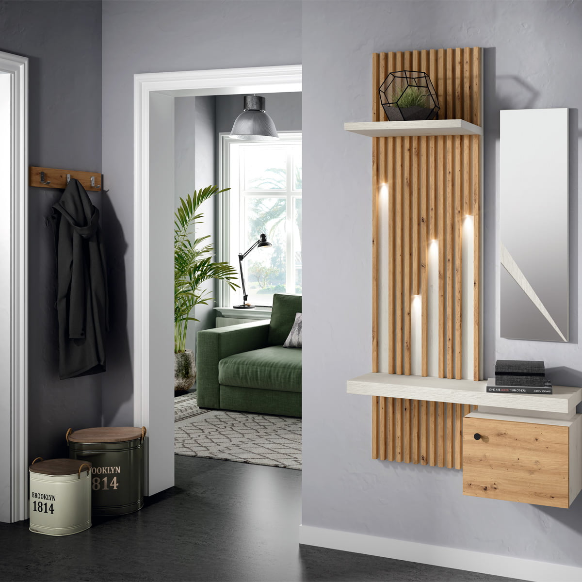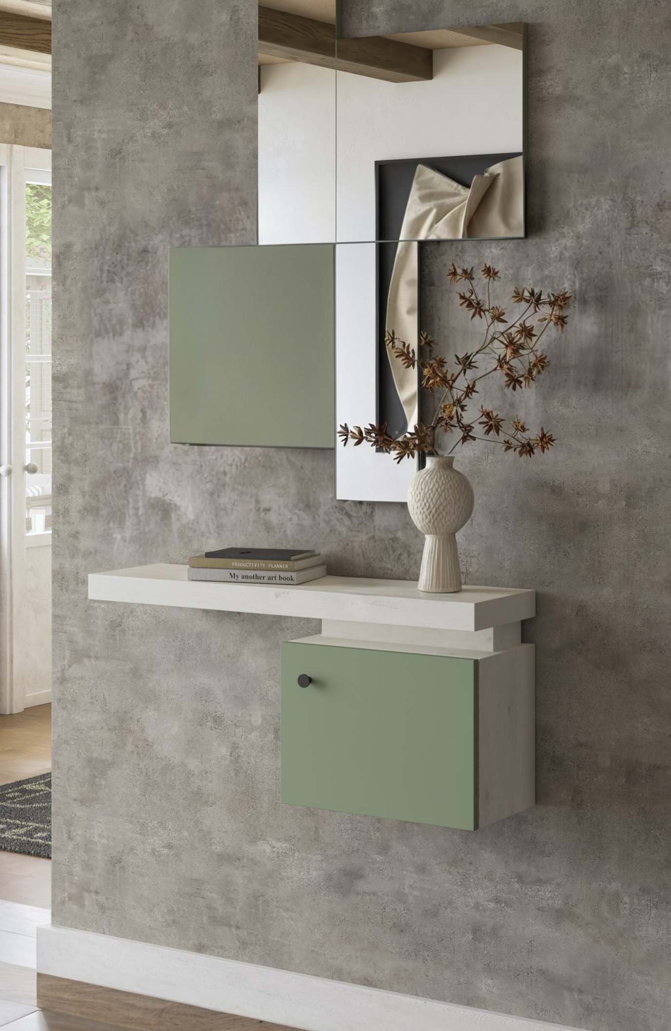 Este recibidor destaca por su diseño moderno y minimalista, ideal para crear una entrada acogedora y funcional en cualquier hogar. La estructura suspendida aporta ligereza visual y permite optimizar el espacio, siendo perfecta para recibidores estrechos o espacios reducidos. Incorpora una práctica superficie para dejar objetos cotidianos, como llaves o correspondencia, y un armario con puerta, ideal para guardar accesorios o pequeños elementos del día a día. La combinación de acabados en líneas rectas y materiales naturales facilita su integración en diferentes estilos decorativos, aportando un toque elegante y actual a la entrada de la vivienda.