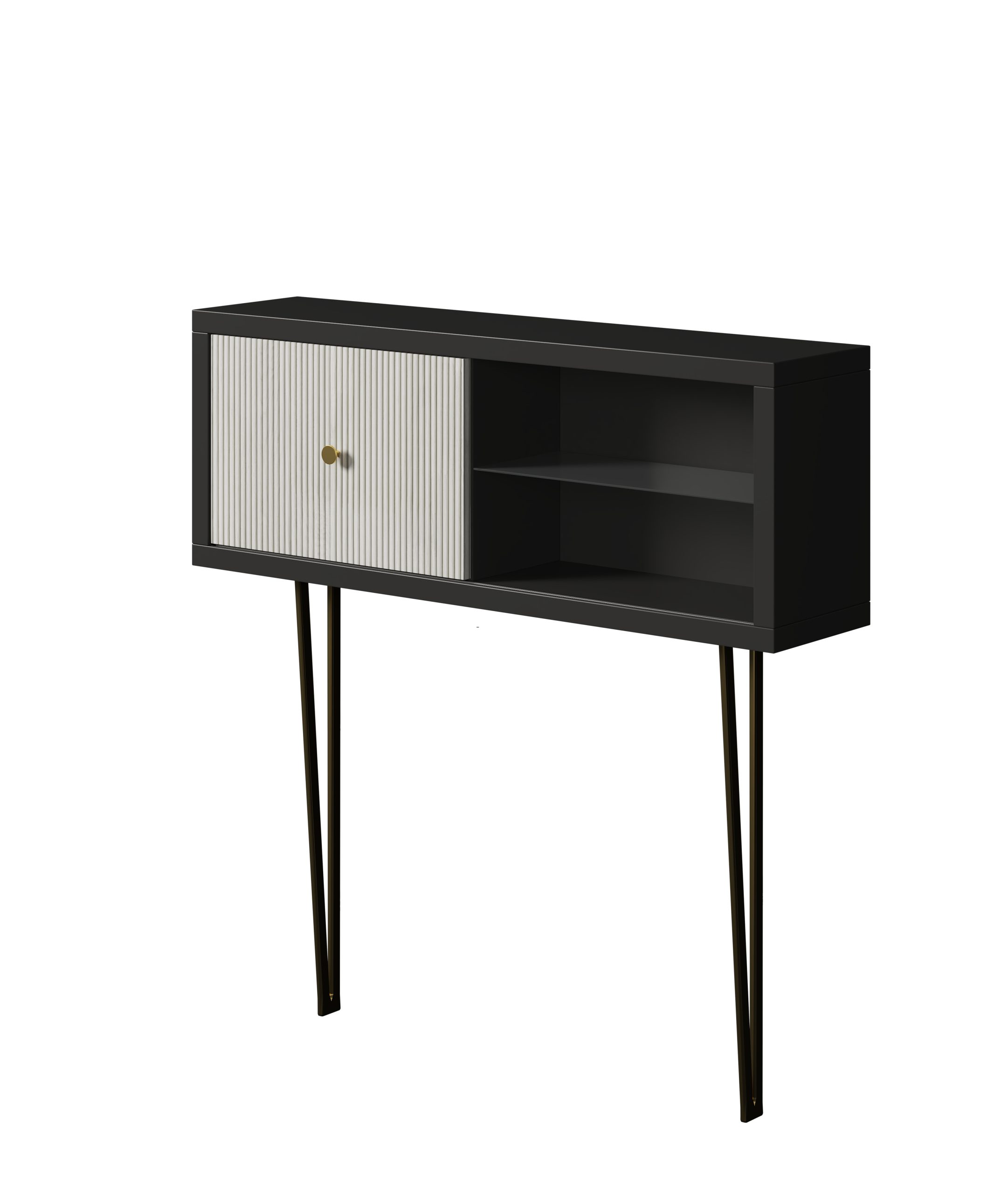 Recibidor de diseño moderno con líneas simples y patas metálicas estilizadas. Incorpora una puerta con detalle acanalado y estante abierto, ideal para mantener el orden en la entrada y aportar un toque elegante a cualquier hogar.