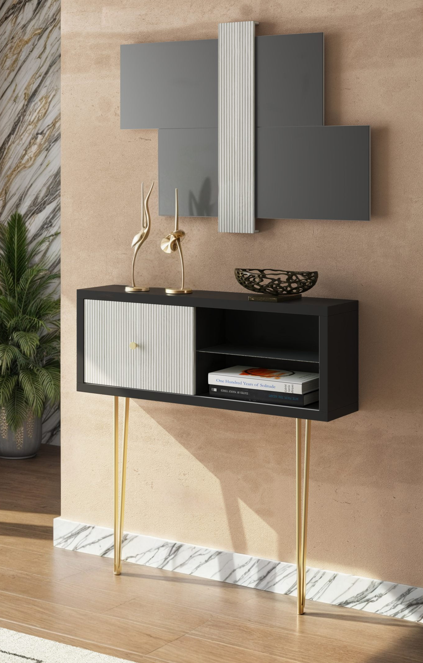 Este recibidor destaca por su diseño moderno y funcional, adaptándose perfectamente a ambientes contemporáneos. Su estructura cuenta con una puerta frontal decorada con delicadas líneas verticales y un tirador metálico que aporta un toque elegante. Dispone de espacio de almacenamiento abierto dividido por una balda, ideal para organizar objetos decorativos, llaves o correspondencia. Las patas metálicas y estilizadas ofrecen estabilidad y realzan su estética sofisticada. Es una pieza versátil que mejora la entrada del hogar, creando una atmósfera acogedora y ordenada, además de facilitar la organización diaria gracias a sus compartimentos accesibles y prácticos.