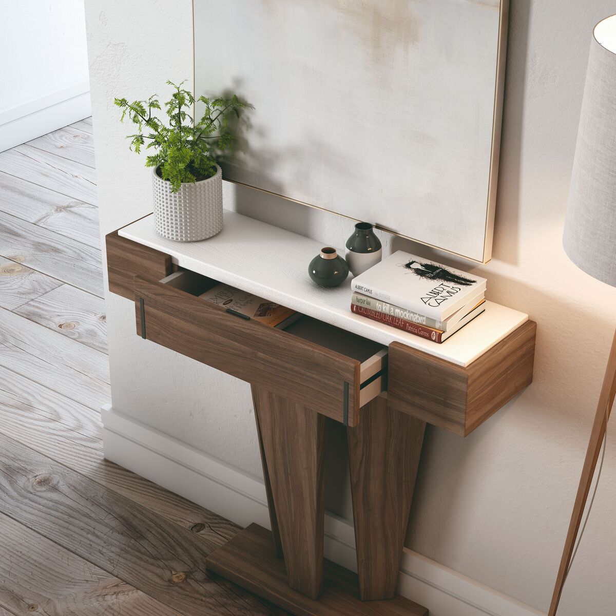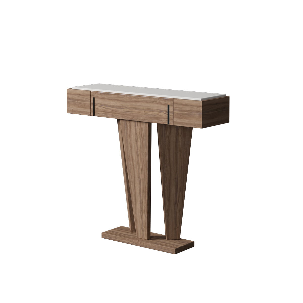 Recibidor de líneas geométricas y diseño contemporáneo, formado por una encimera alargada con cajones discretos y una original base en forma de triángulo doble. Ideal para espacios reducidos, aporta elegancia y personalidad nada más entrar en casa.