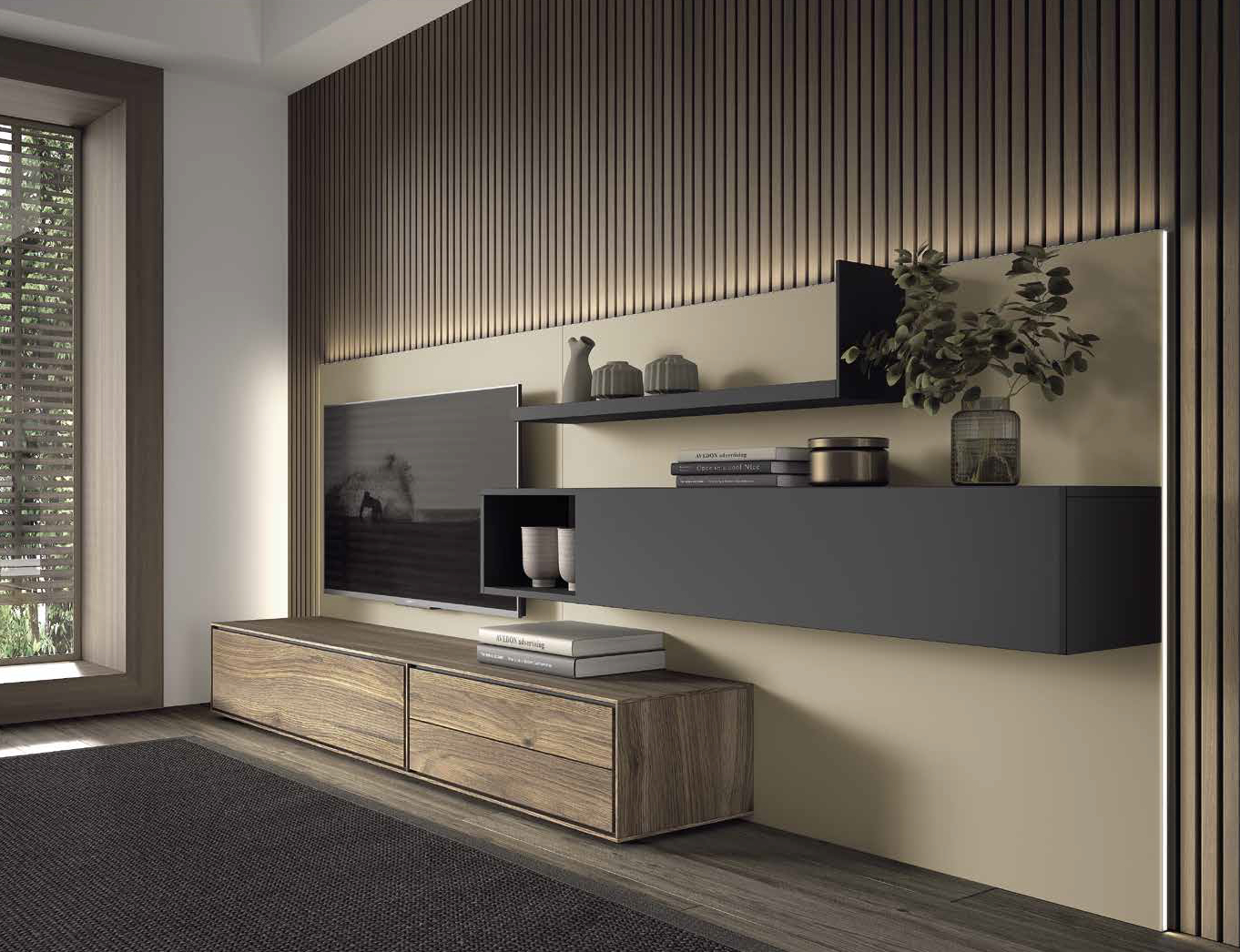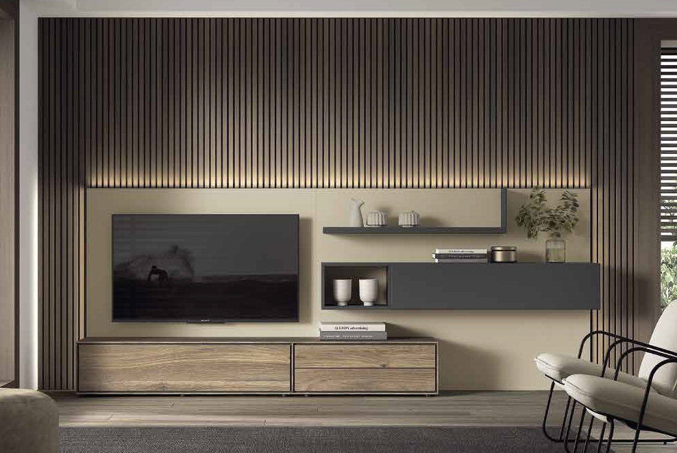 Este conjunto de salón destaca por su diseño contemporáneo y equilibrado, ideal para crear un ambiente elegante y ordenado. El mueble combina un módulo bajo alargado con amplios cajones de almacenaje y una composición superior de módulos colgados y estantes abiertos que aportan ligereza visual. El gran panel de fondo unifica todos los elementos y sirve de soporte para la televisión, mientras que el revestimiento de listones verticales en la pared añade textura y sensación de altura. La iluminación integrada realza las líneas rectas del conjunto y genera una acogedora luz ambiental, perfecta para disfrutar de la zona de estar.
