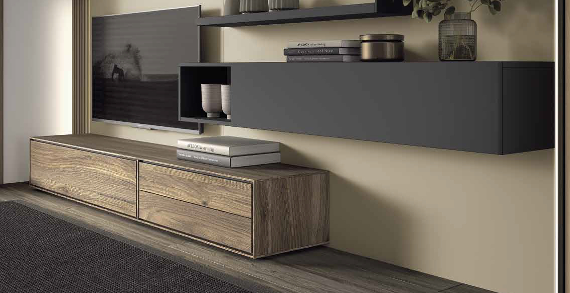 Este mueble combina madera y módulos en color oscuro, creando un diseño moderno y elegante que encaja bien en salones contemporáneos. Además, ofrece una composición amplia con módulo bajo, vitrina abierta y estante superior, ideal para televisión, decoración y almacenaje.