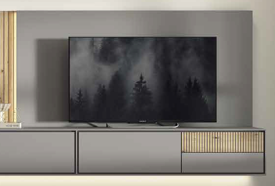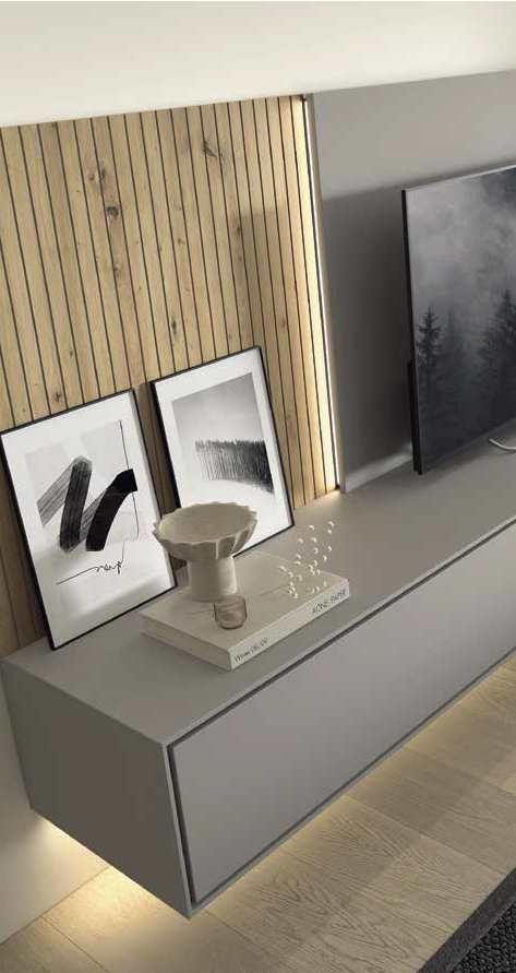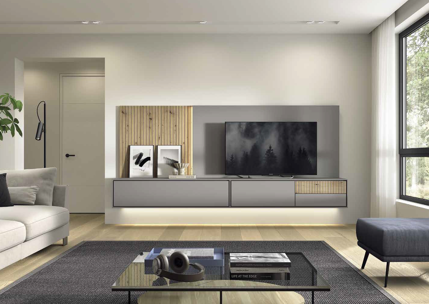 Mueble de salón suspendido, con amplias puertas lisas y módulos combinados con detalle estriado, ideal para integrar televisión y decoración. Aporta gran capacidad de almacenaje y una estética moderna y ligera que realza cualquier estancia.