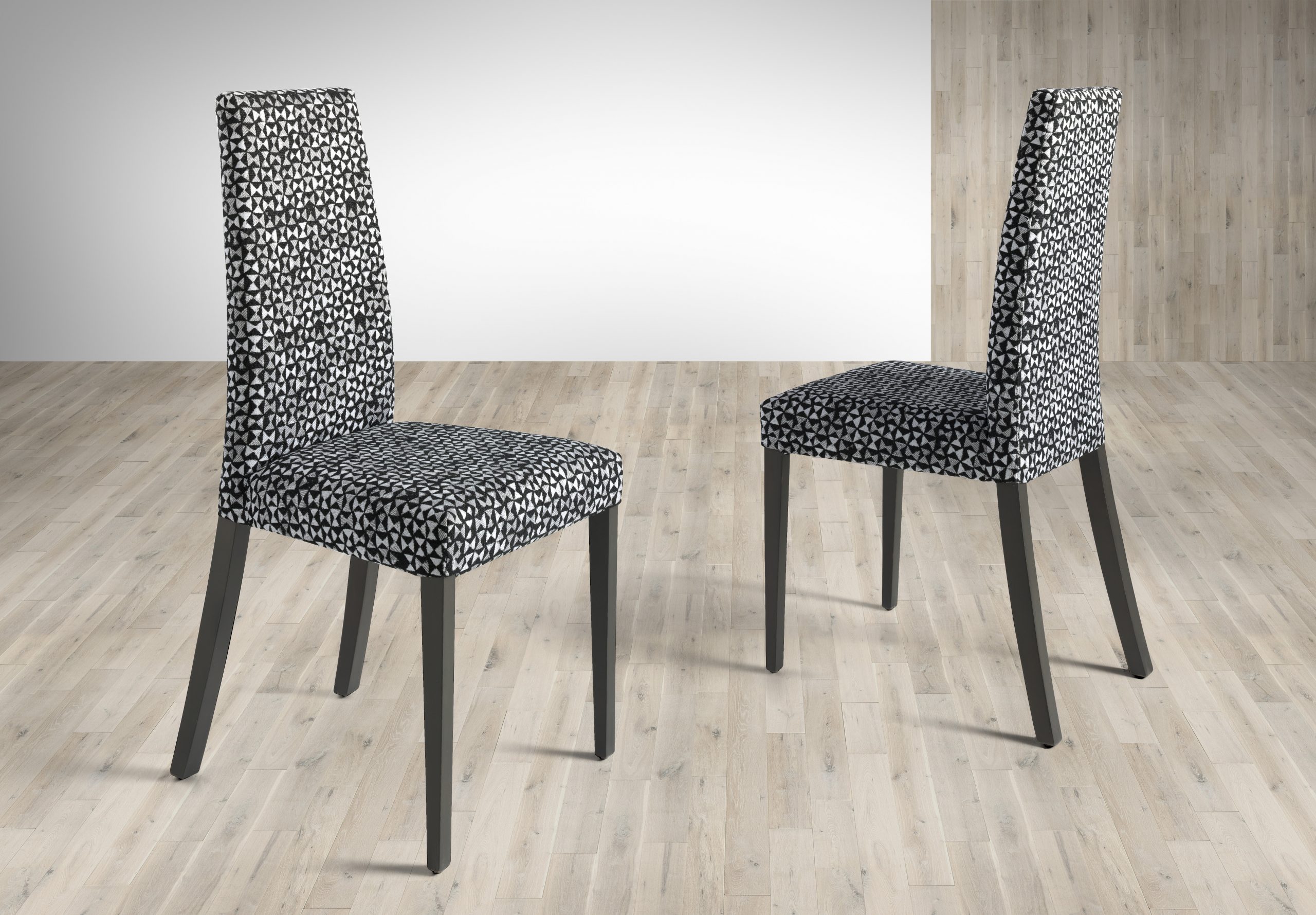 Silla de líneas sencillas y aspecto contemporáneo, ideal para comedores modernos o espacios de trabajo en casa. El respaldo alto y recto ofrece un buen apoyo para la espalda, mientras que el asiento acolchado proporciona una comodidad agradable en usos prolongados. El tapizado muestra un discreto estampado geométrico que aporta dinamismo visual sin resultar recargado. Las patas rectas, ligeramente abiertas en la parte trasera, refuerzan la estabilidad y dan una sensación de ligereza. Es una pieza versátil que combina fácilmente con mesas de distintos estilos, desde las más minimalistas hasta las de aire más clásico.