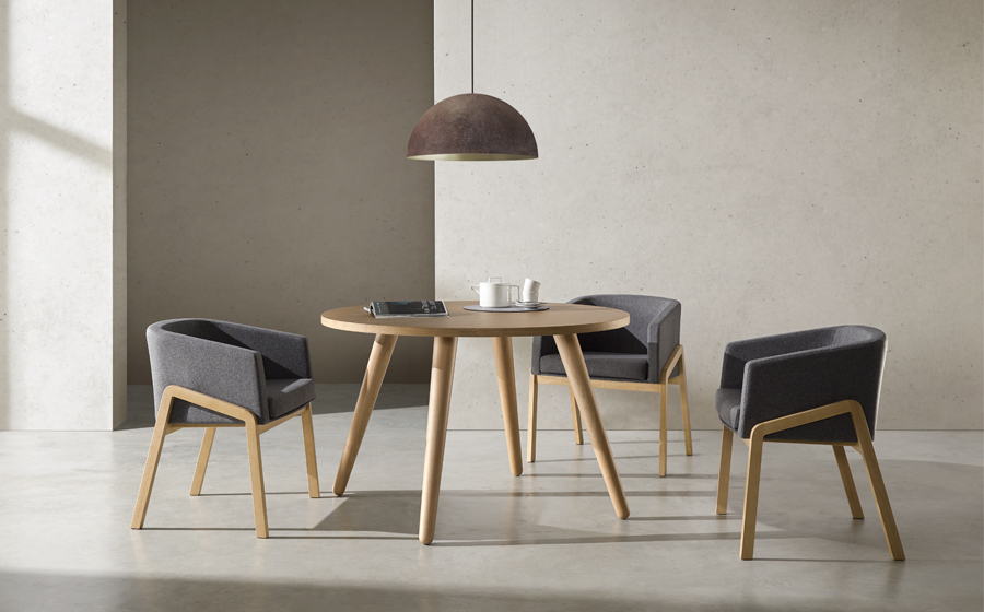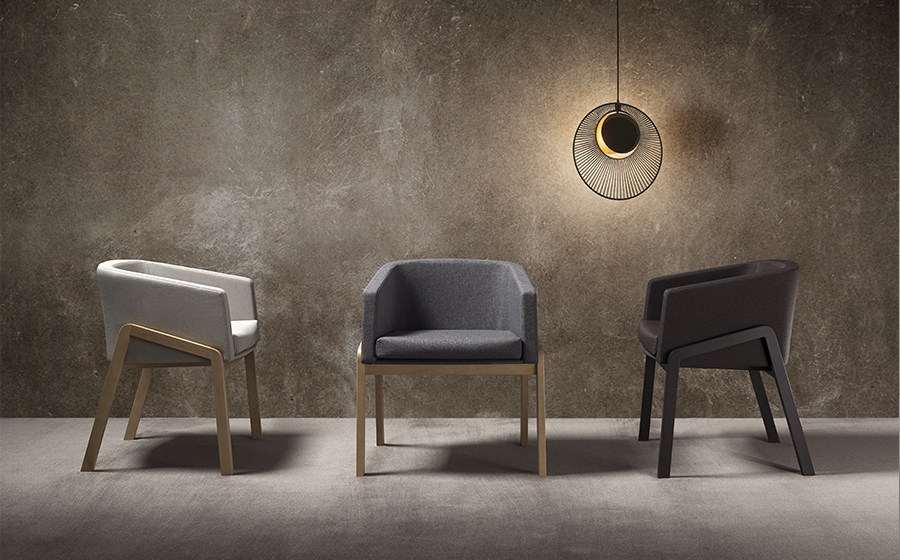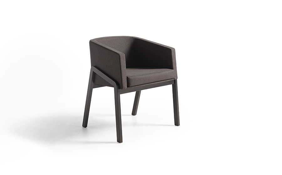 Es un modelo de diseño contemporáneo que destaca por sus líneas limpias y minimalistas, combinando funcionalidad y estética moderna. El armazón está fabricado en madera maciza de haya, lo que le otorga estabilidad y resistencia, mientras que el asiento y respaldo están completamente tapizados en tejido de alta calidad. La estructura presenta un diseño envolvente y ergonómico, con respaldo curvo que se integra suavemente en los reposabrazos, ofreciendo comodidad y apoyo durante largos periodos de uso. Las patas inclinadas proporcionan un soporte sólido y un perfil distintivo, complementando la pieza con un toque sofisticado e innovador en espacios de oficinas, salas de espera o áreas de recepción.