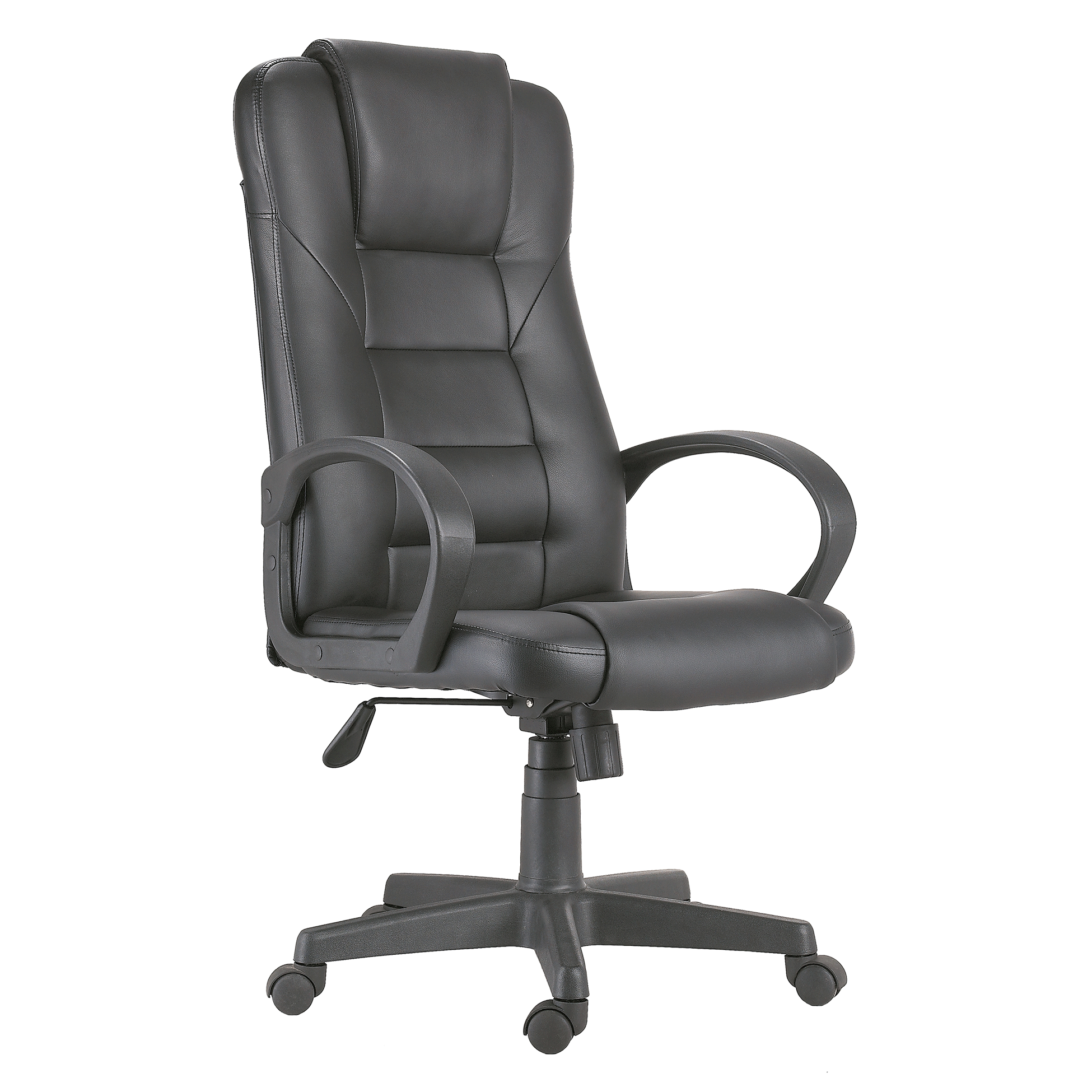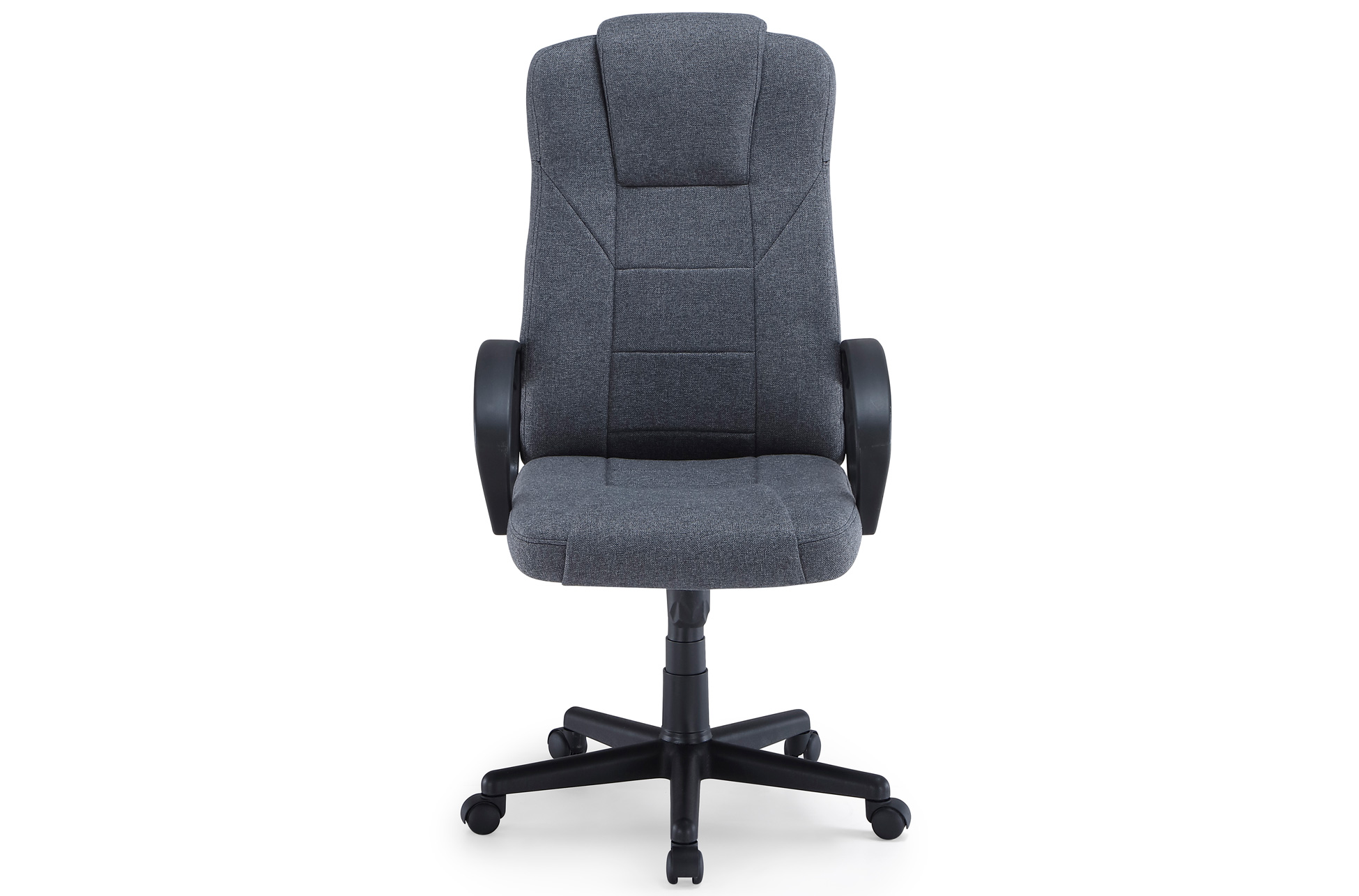 Silla de oficina giratoria con respaldo alto tapizado en tela, reposabrazos fijos y base con ruedas, pensada para trabajar cómodamente durante horas en entornos de oficina o teletrabajo.