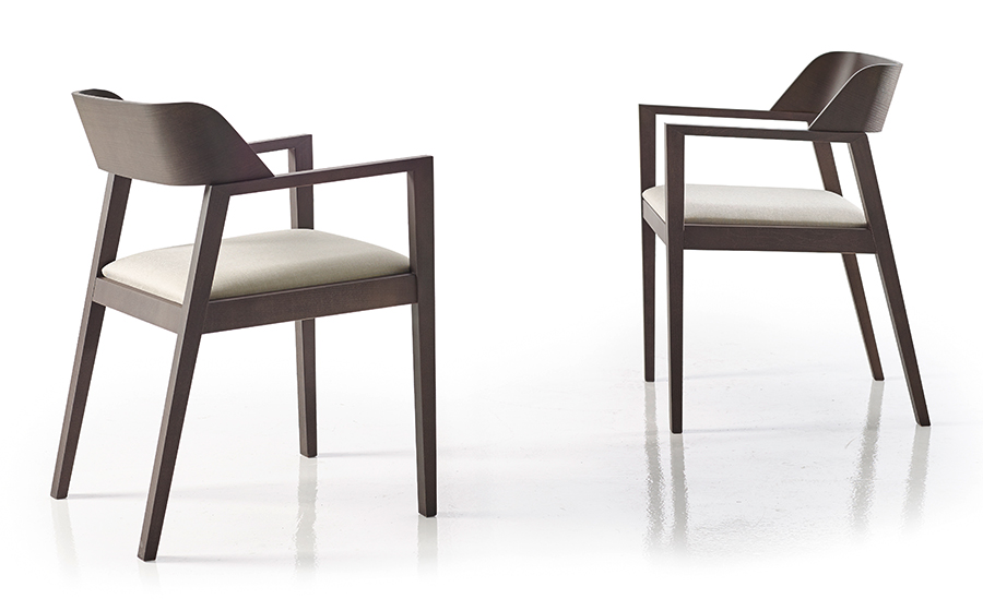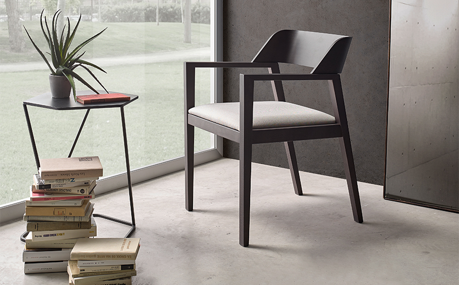 La silla MIDAS presenta un diseño contemporáneo con líneas limpias y estructura angular realizada en madera maciza, lo que aporta robustez y estabilidad. El respaldo curvado está fabricado en una sola pieza de madera moldeada, proporcionando un soporte ergonómico a la zona lumbar. Los reposabrazos forman parte de la estructura principal, integrándose de manera minimalista. El asiento está acolchado y tapizado en un tejido claro, ofreciendo confort y contraste visual con la madera oscura. Este modelo es ideal tanto para espacios contract como residenciales, uniendo estética sofisticada y funcionalidad gracias a su cuidada proporción y acabados de alta calidad.