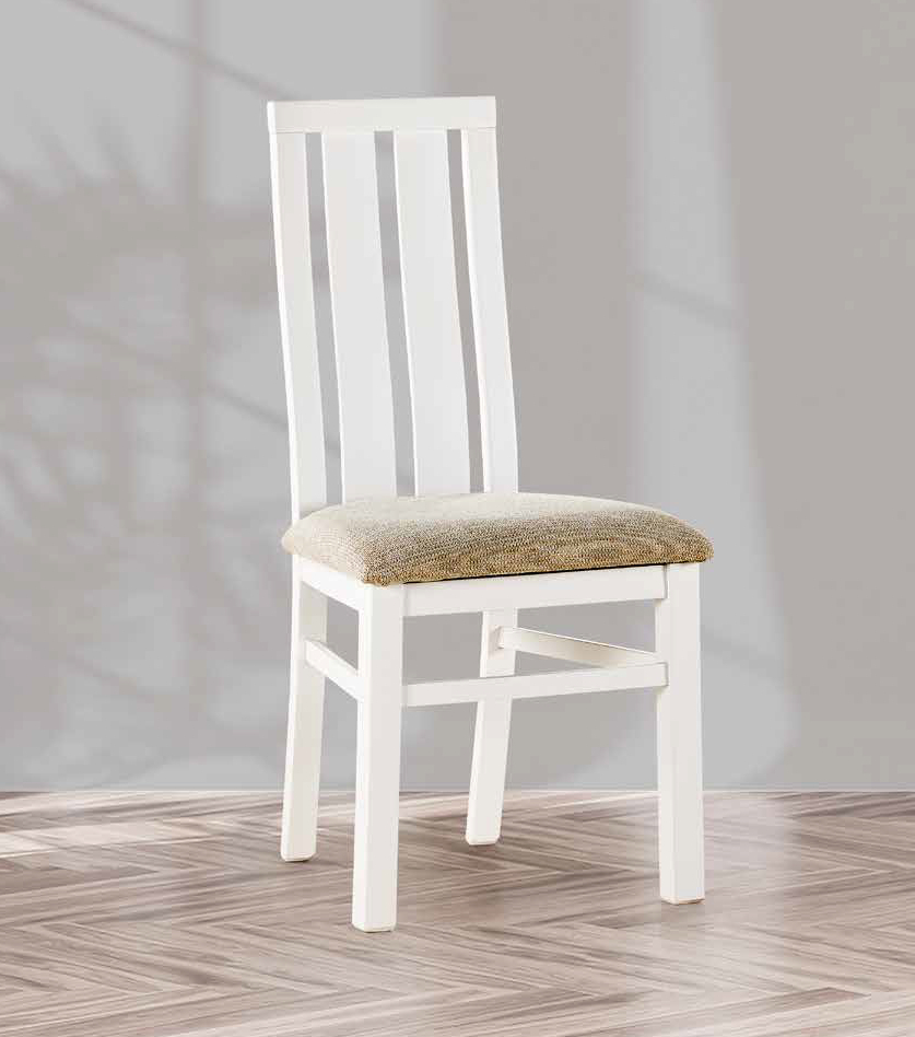La silla 1002, de diseño clásico y elegante es ideal para comedores o cocinas. Está fabricada con una estructura de madera pintada en color blanco, con un respaldo de tres listones verticales y ligeramente curvados, lo que aporta comodidad y un toque moderno. El asiento es acolchado y tapizado en una tela de color beige claro, que combina muy bien con el acabado del marco. Las patas son rectas y robustas, unidas por travesaños para mayor resistencia y estabilidad. Su aspecto neutral permite integrarla en ambientes decorativos variados, aportando luminosidad y sencillez al espacio.