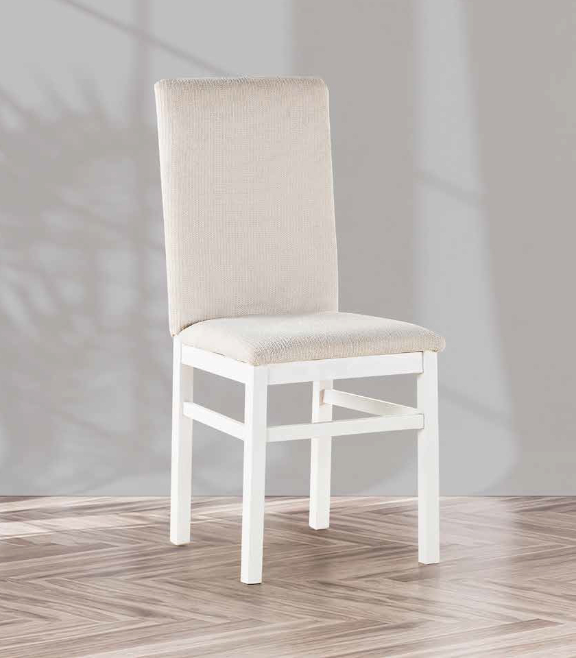 Una silla de líneas modernas con estructura de madera lacada en blanco. El respaldo es alto y recto, proporcionando buen soporte y comodidad. El asiento y el respaldo están tapizados en un tejido beige claro, que aporta elegancia y versatilidad para combinar en diferentes espacios del hogar. Sus patas rectas y el diseño robusto sugieren estabilidad y durabilidad, ideal tanto para comedor como para escritorio. El estilo neutro y la calidad del acabado la convierten en una pieza práctica y decorativa para ambientes contemporáneos, aportando luminosidad gracias a su color claro y diseño sencillo.