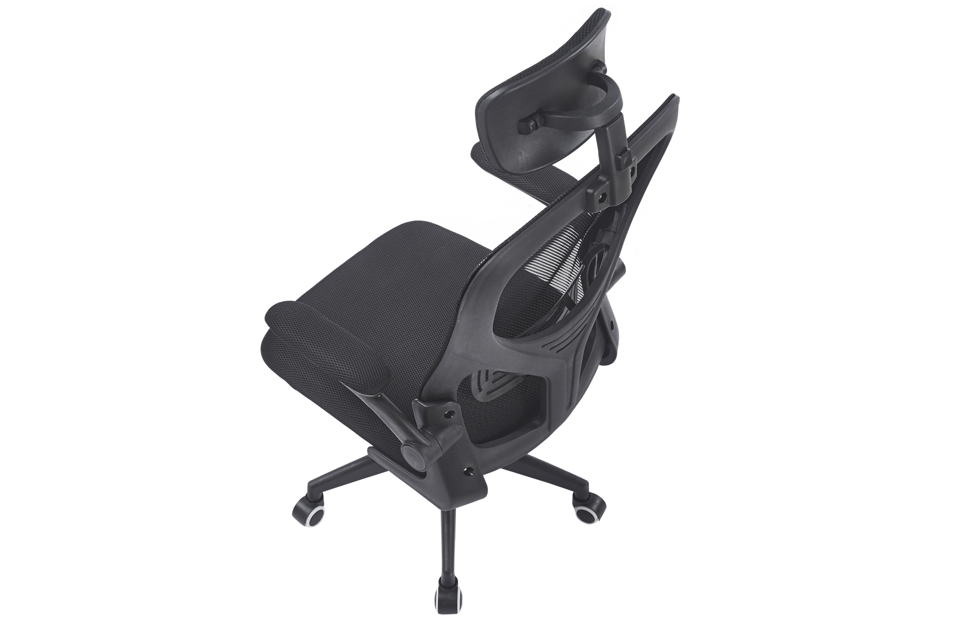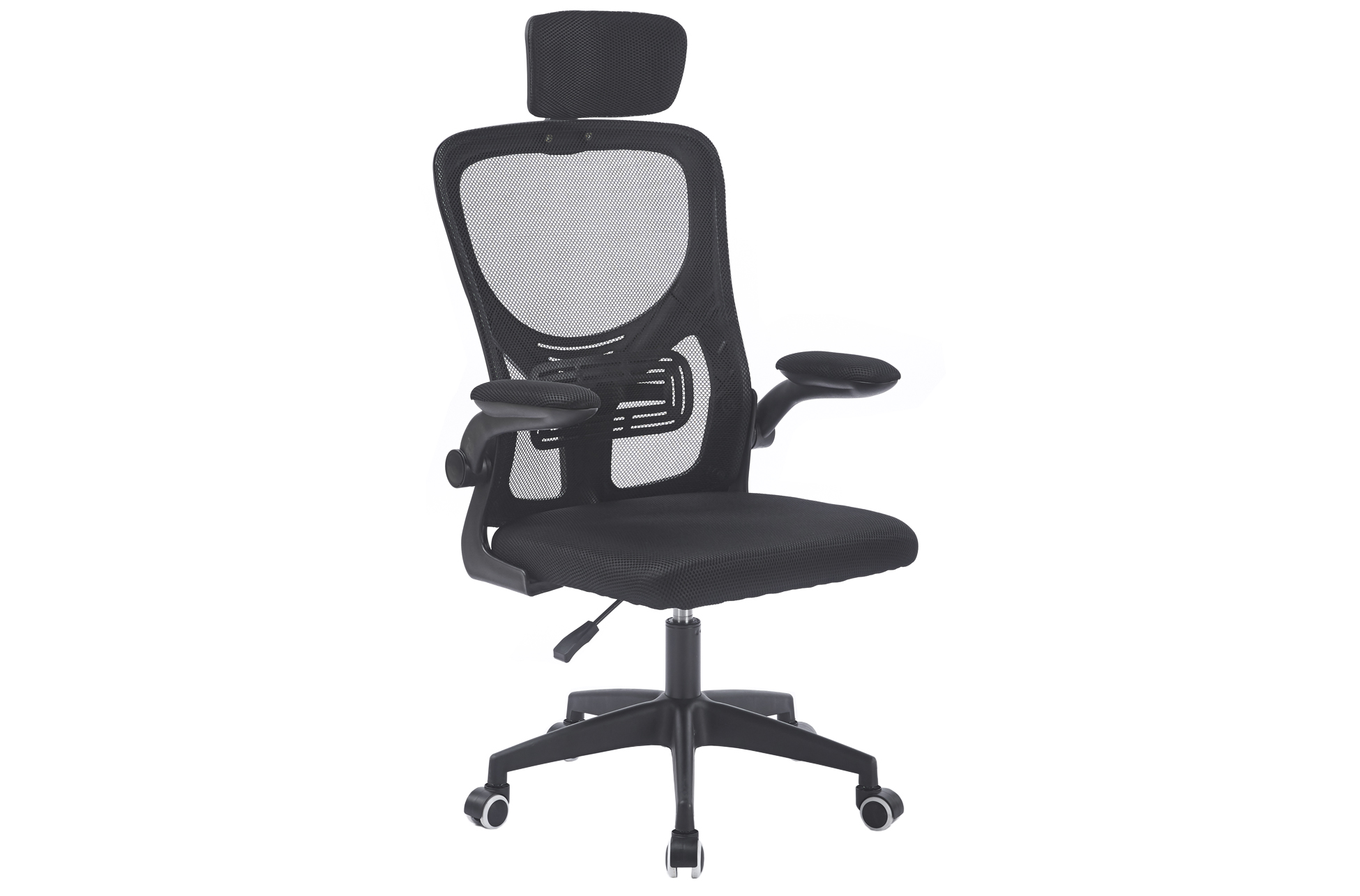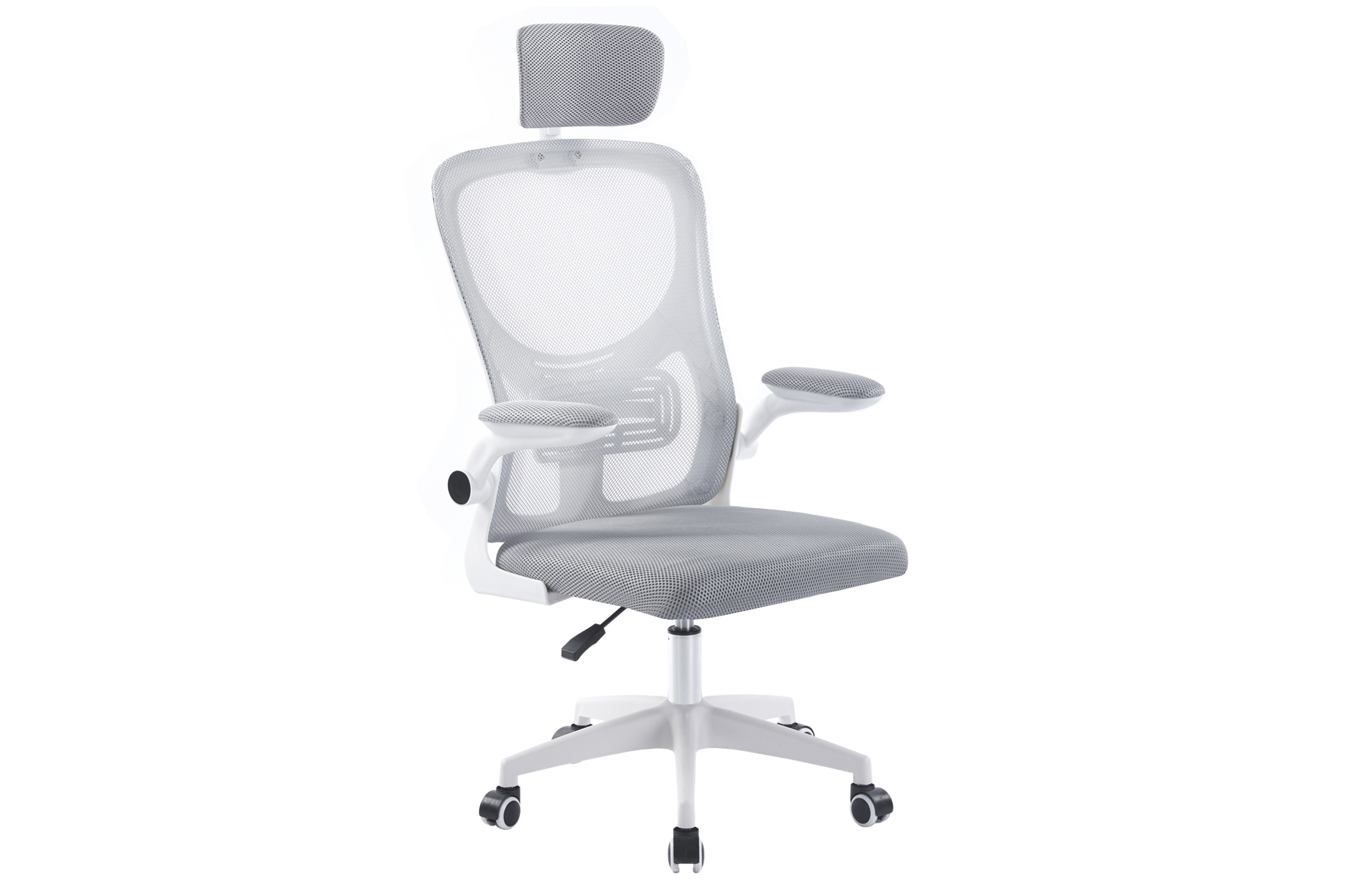 Sillón de oficina ergonómica con respaldo de malla transpirable, cabecero y soporte lumbar regulable, pensada para trabajar muchas horas con una postura cómoda y saludable. El asiento acolchado y los reposabrazos abatibles permiten liberar espacio y adaptar la silla al escritorio con facilidad. Incorpora sistema de inclinación con control de tensión y elevación a gas para ajustar la altura de forma suave y precisa, además de una base giratoria con cinco ruedas que facilitan el movimiento por todo el espacio de trabajo con total estabilidad.