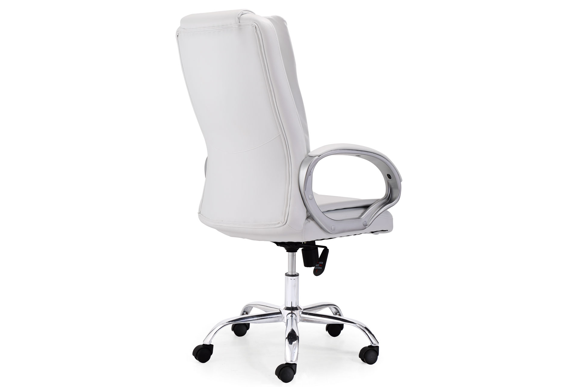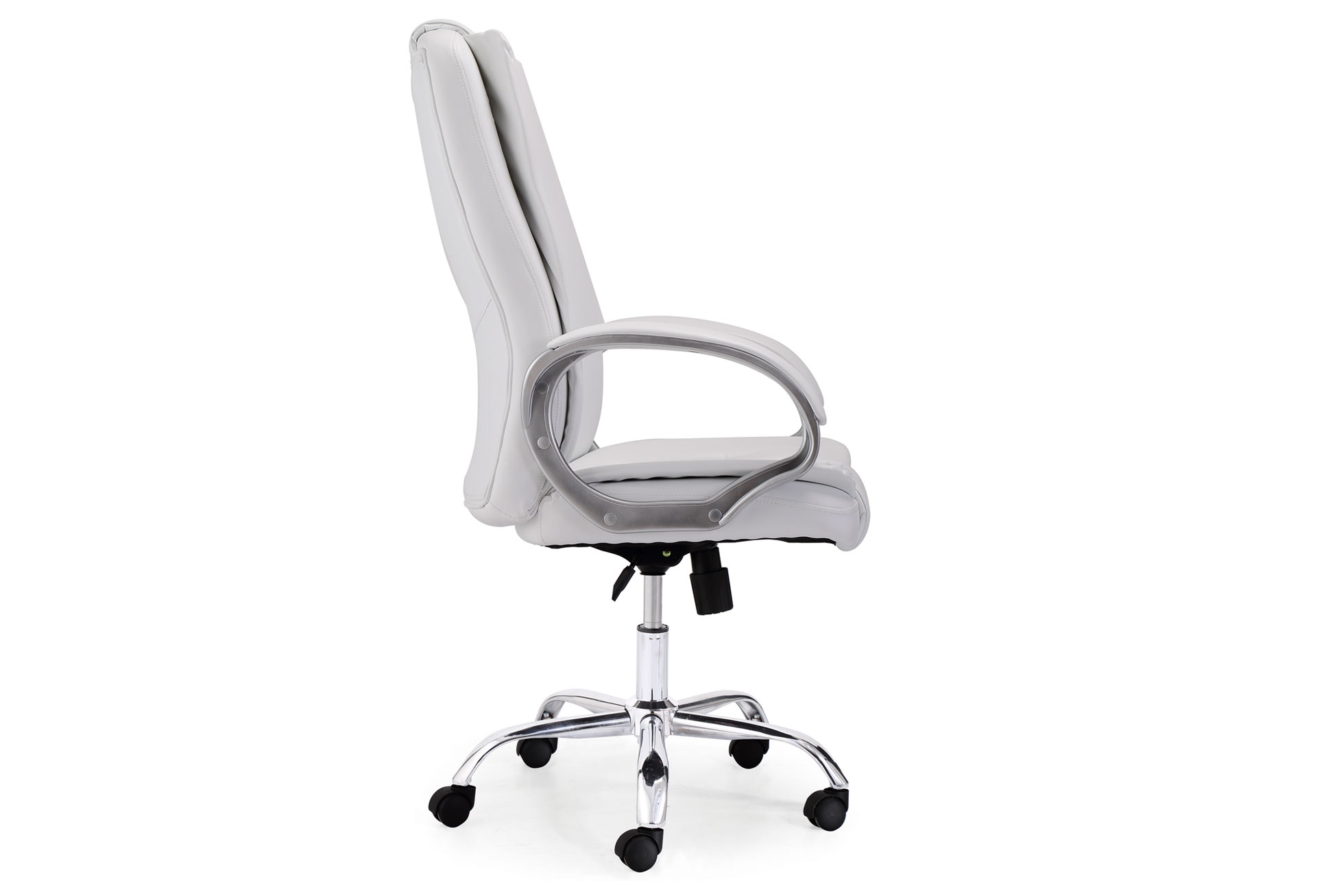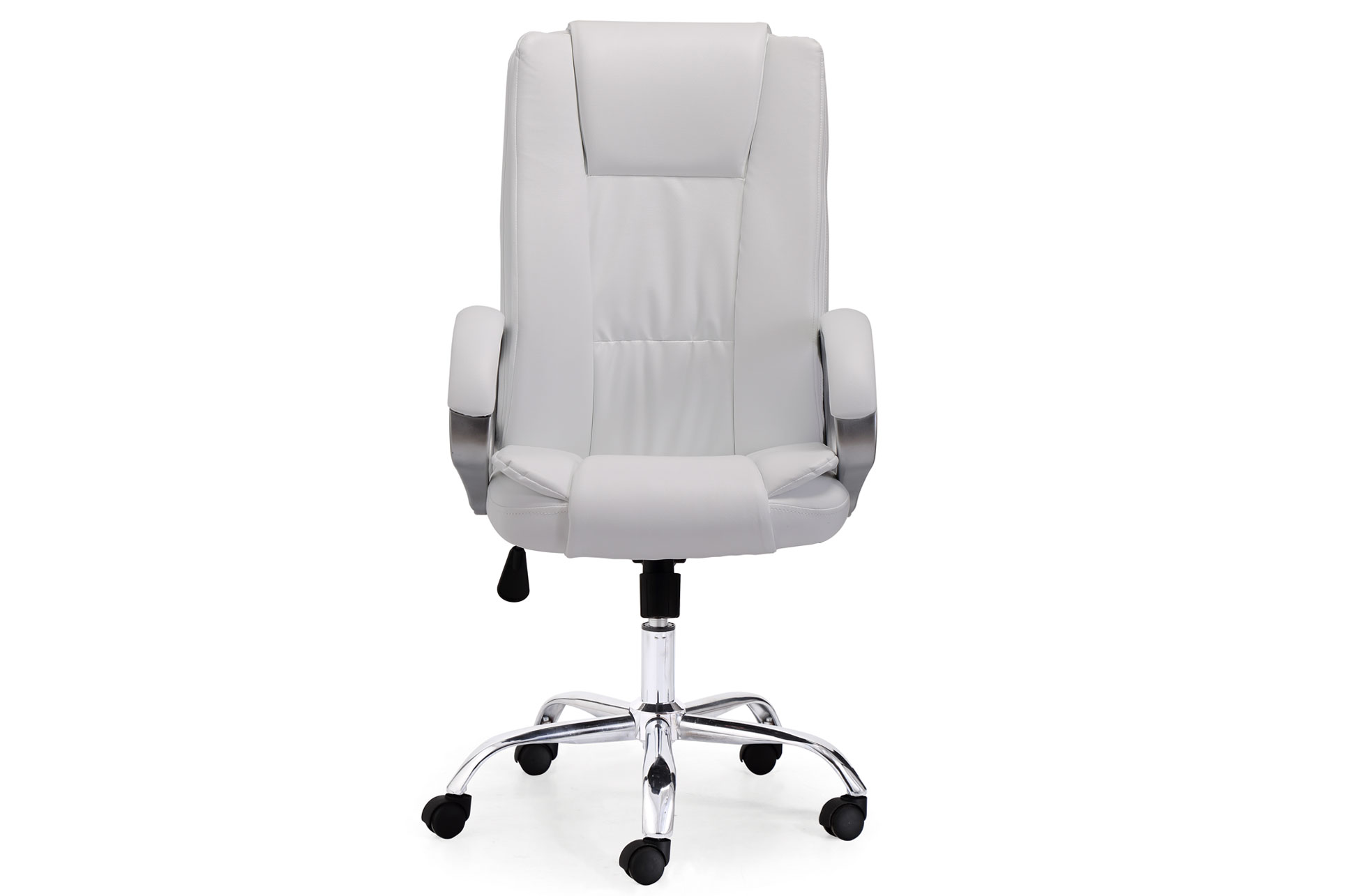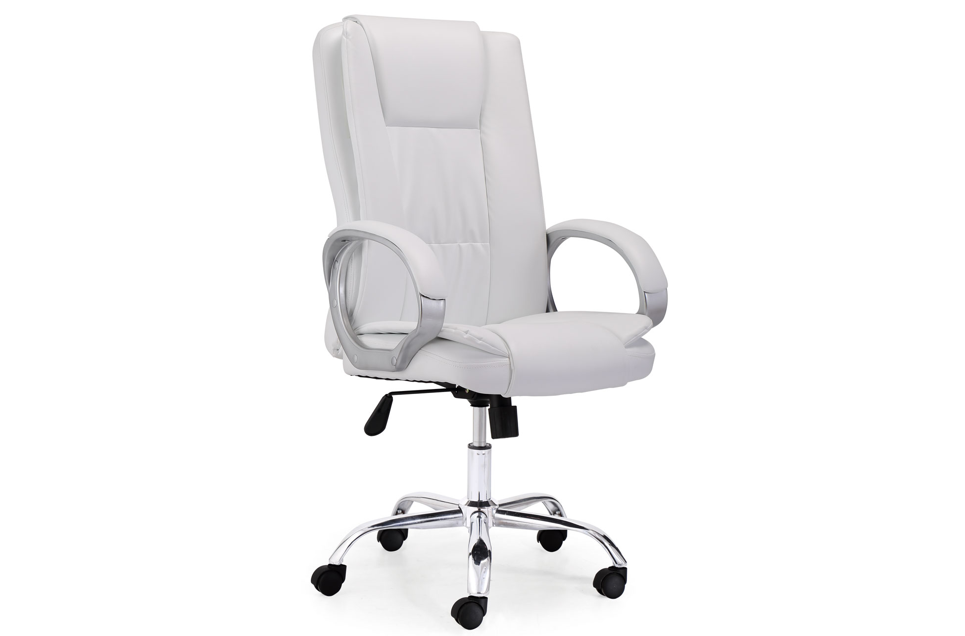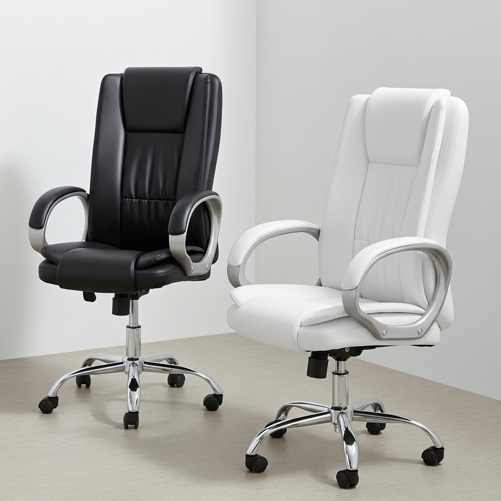 Silla de oficina ejecutiva con respaldo alto, acolchado ergonómico y reposabrazos envolventes. Tapizado sintético de fácil limpieza, base giratoria con ruedas y elevación regulable para un confort diario en el trabajo.