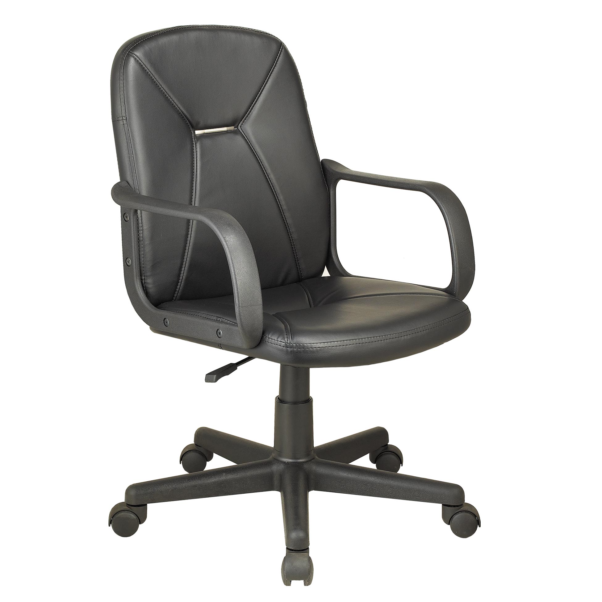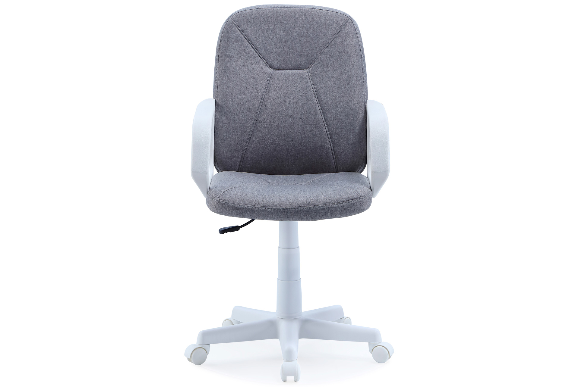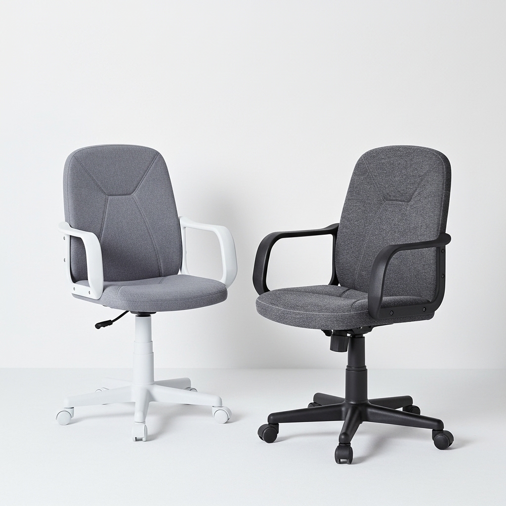 Silla compacta y funcional para oficina o estudio, con asiento acolchado, respaldo ergonómico y reposabrazos fijos que garantizan comodidad diaria. Base giratoria con cinco ruedas y altura regulable para adaptarse a cualquier escritorio.