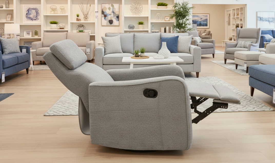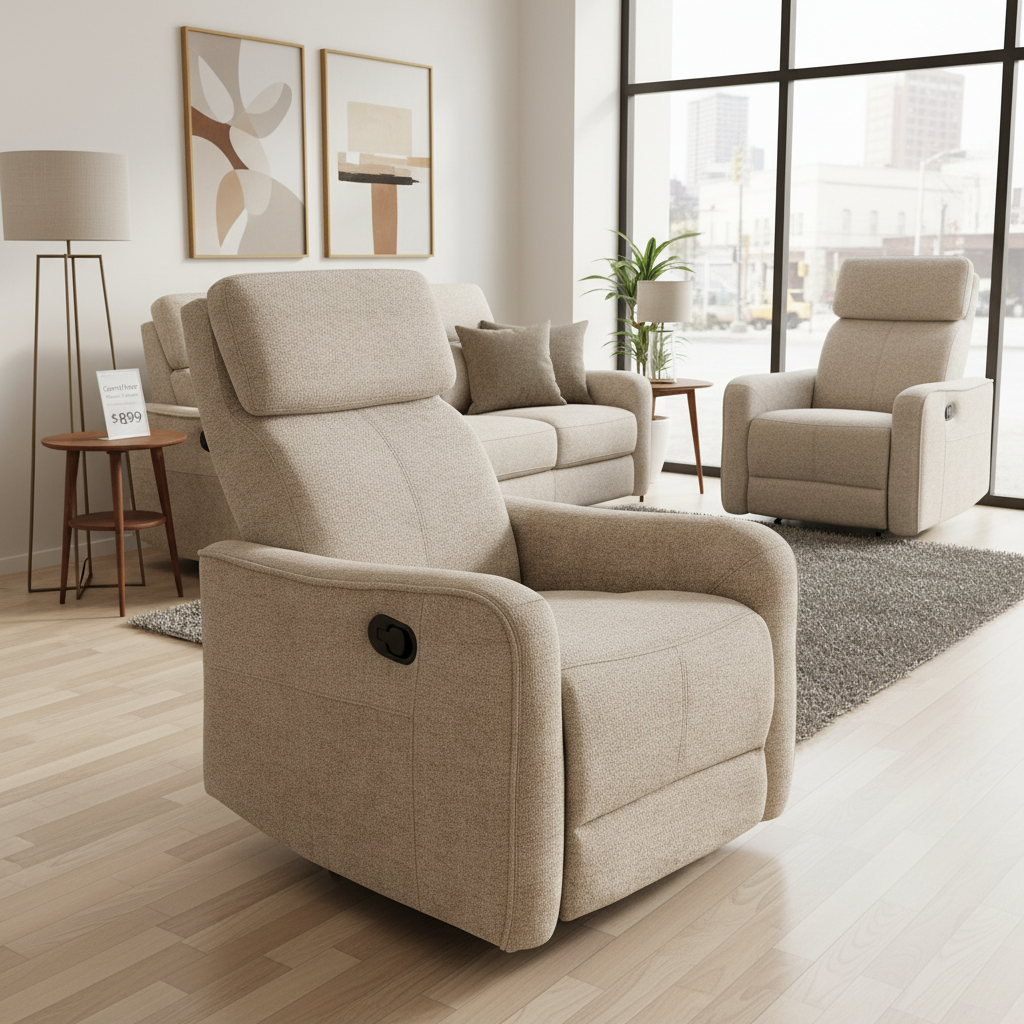 Ofrece reclinación manual, reposapiés integrado y base giratoria, combinando comodidad y funcionalidad en una sola pieza. Su acolchado mullido y tejido resistente garantizan un uso confortable y prolongado en el tiempo.