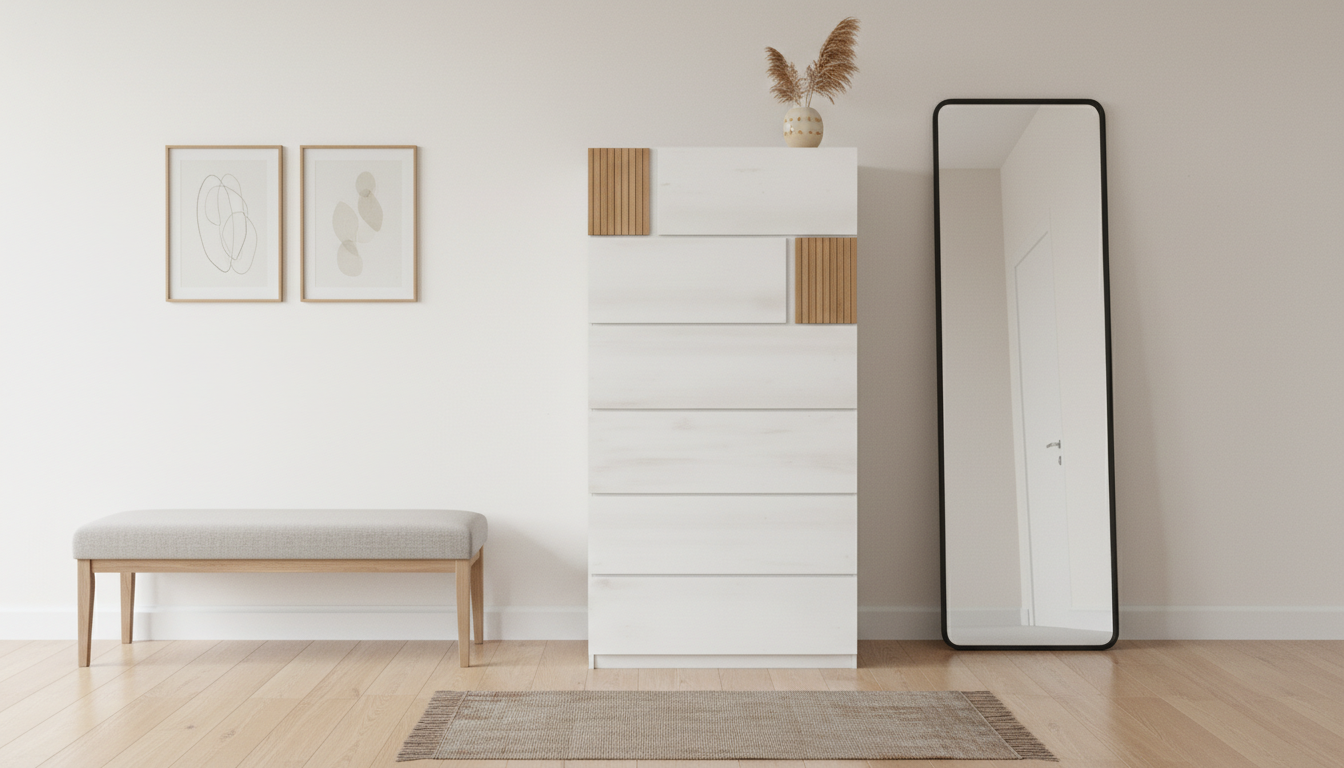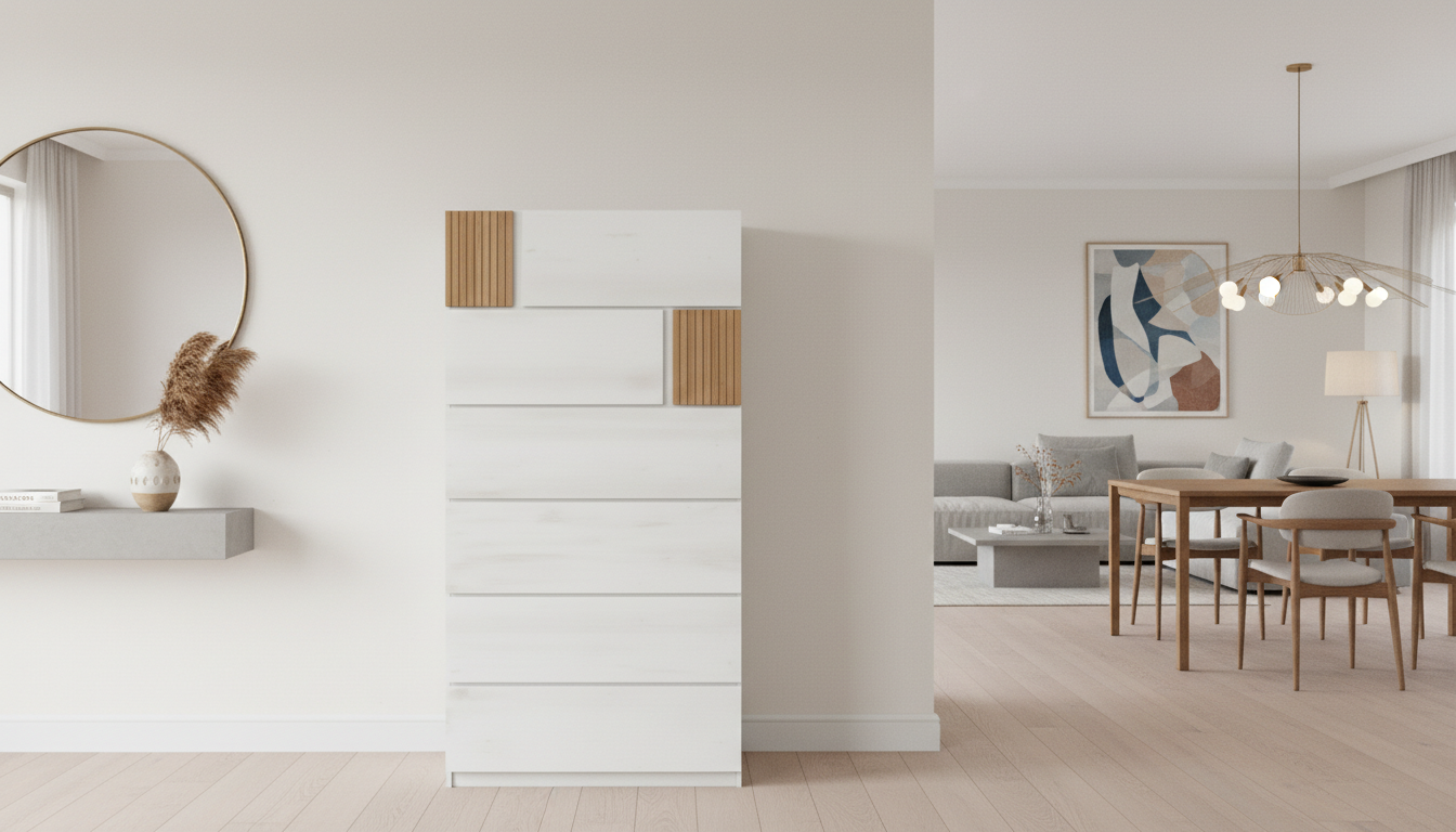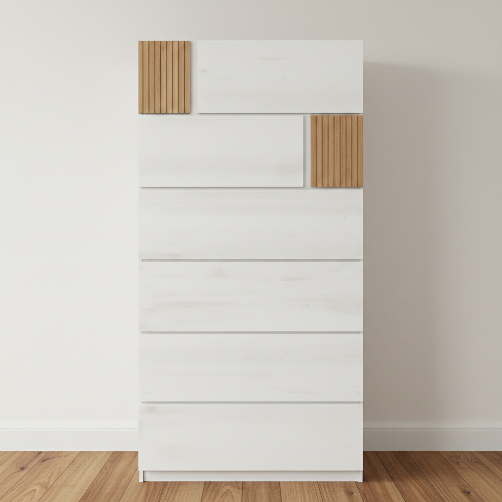 Este sinfonier destaca por su diseño moderno y minimalista, con una estructura principal en blanco lacado que evoca pureza y luminosidad en el dormitorio. Paneles decorativos en madera natural de tono cálido se integran en la parte superior, creando un contraste armónico y elegante que aporta calidez sin sobrecargar el espacio. Cuenta con múltiples cajones amplios y profundos, ideales para organizar ropa, accesorios y objetos personales de forma ordenada y accesible. Su estilo escandinavo lo hace versátil, adaptándose a cualquier decoración contemporánea o nórdica, maximizando el almacenamiento vertical sin invadir el suelo. La combinación de materiales resistentes asegura durabilidad y facilidad de mantenimiento, convirtiéndolo en una pieza funcional y estética para el hogar.