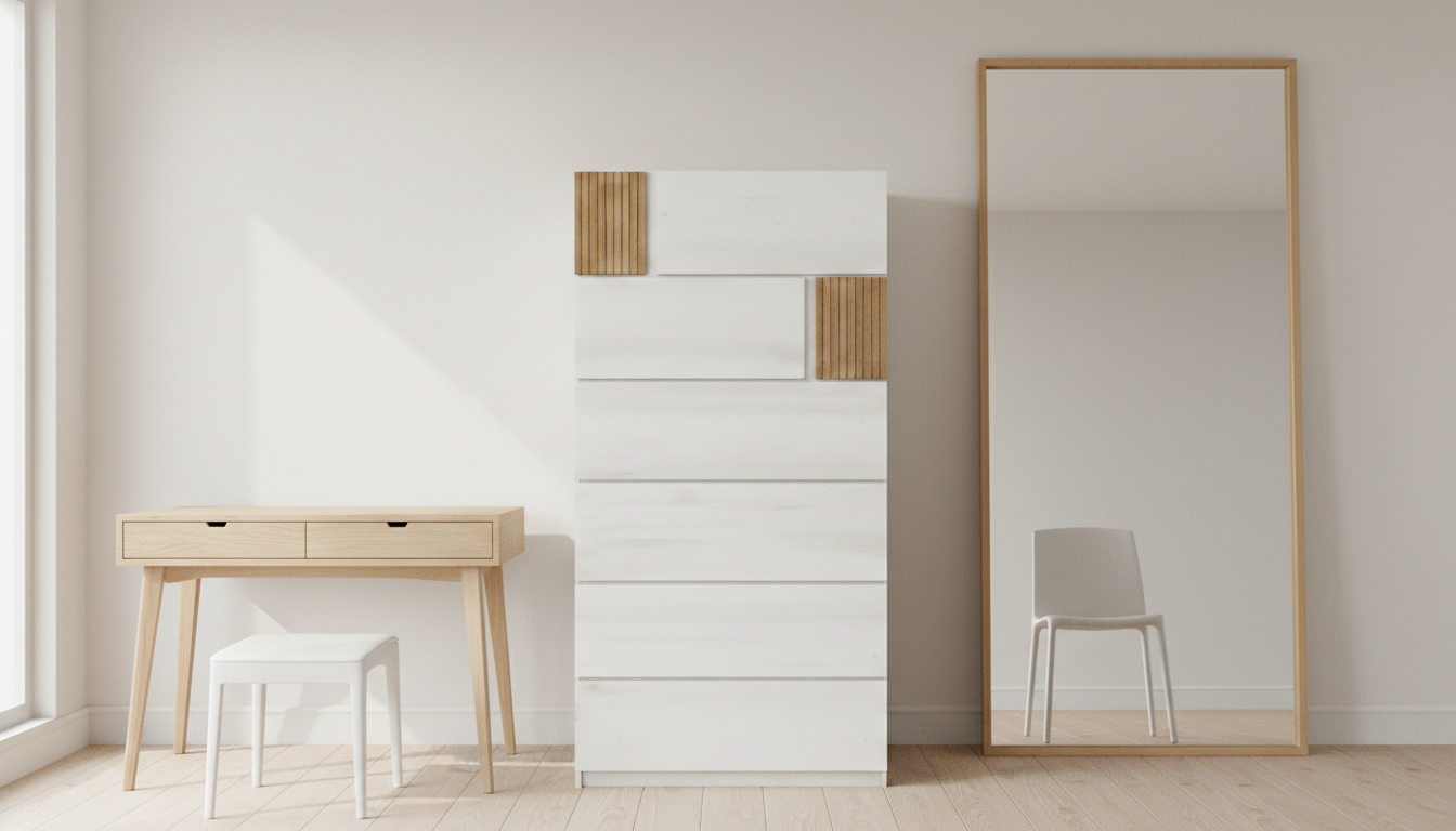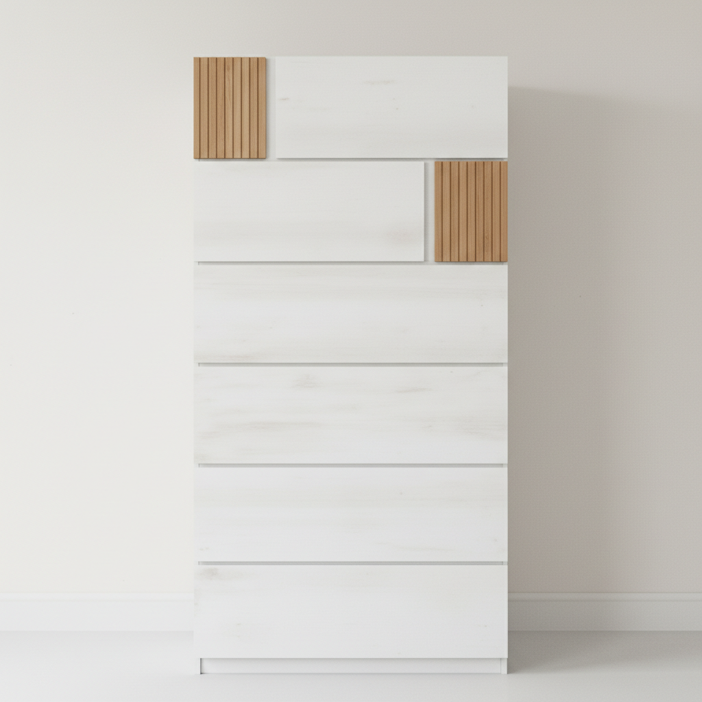 Sinfonier moderno en blanco con paneles de madera natural en la parte superior. Ofrece varios cajones espaciosos para un almacenamiento organizado y un diseño minimalista que ilumina cualquier dormitorio.