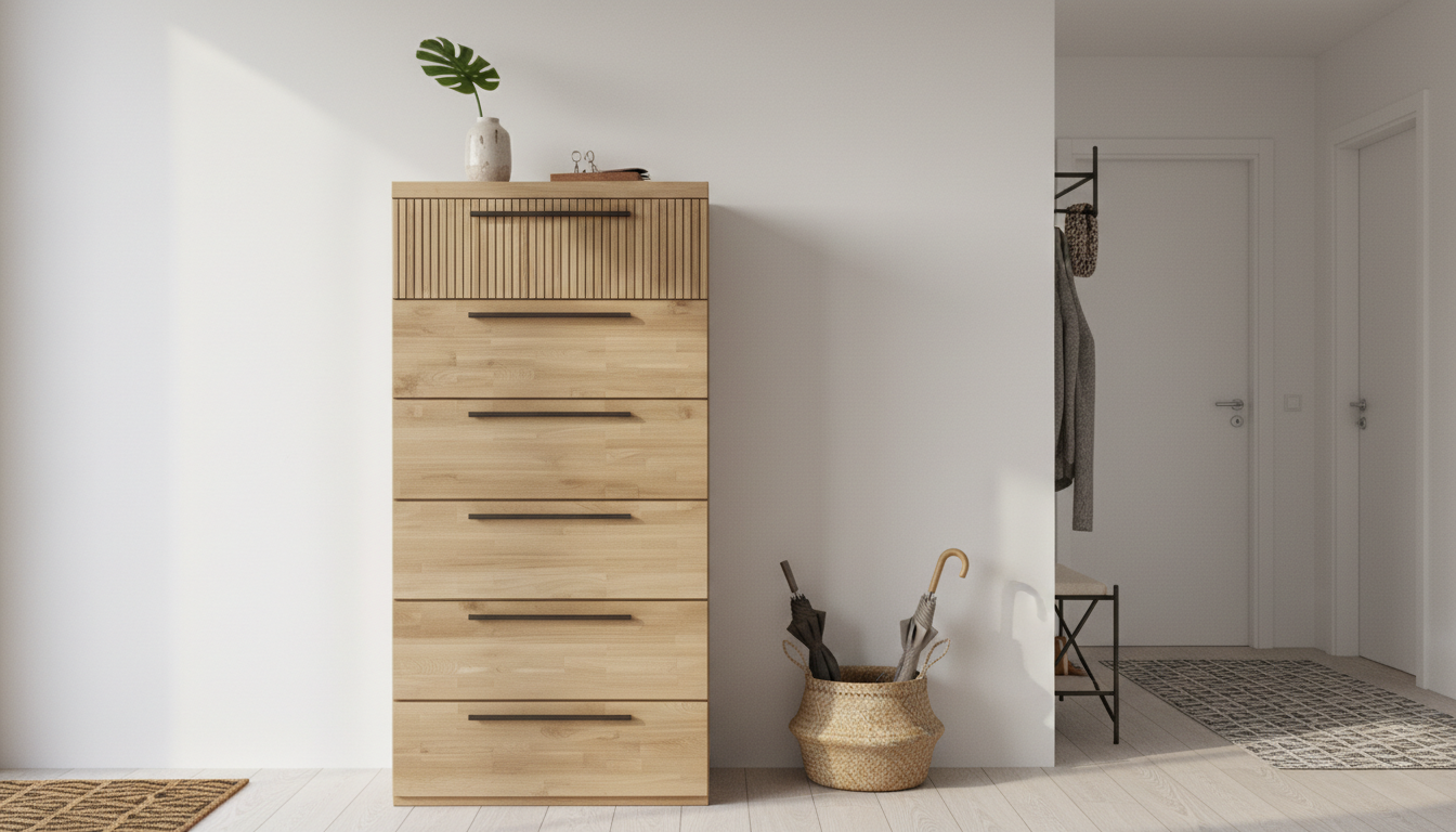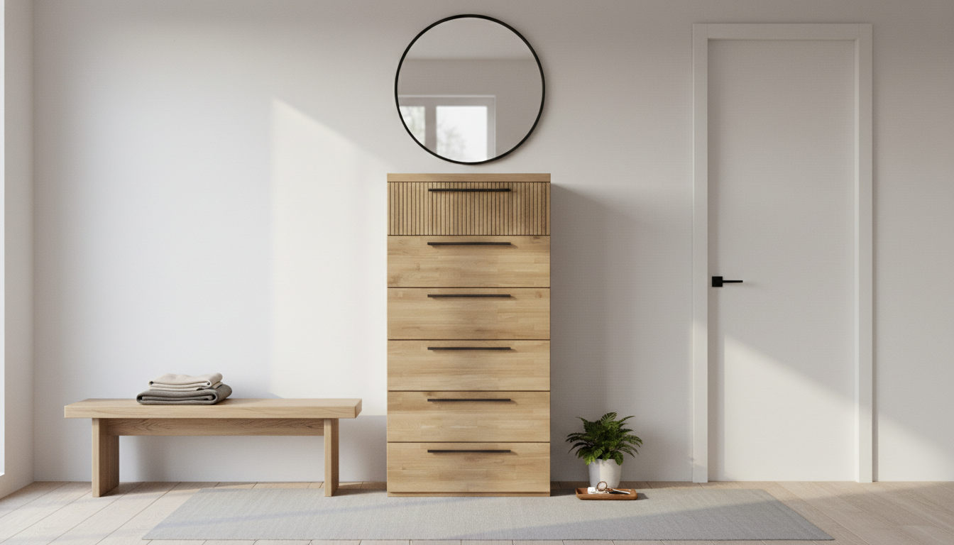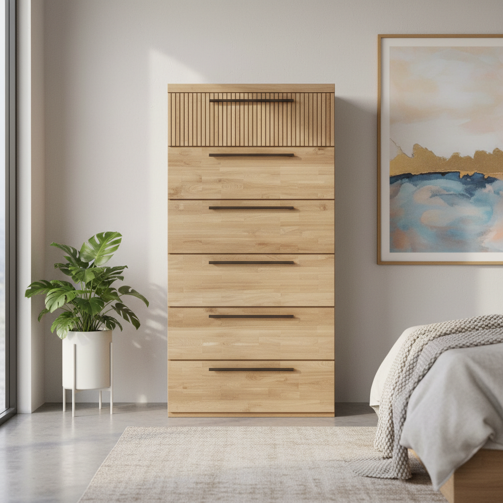 Sinfonier moderno de madera natural con seis cajones y asas metálicas alargadas. Diseño vertical compacto, texturizado en la tapa superior, perfecto para organizar ropa en dormitorios pequeños con estilo escandinavo.