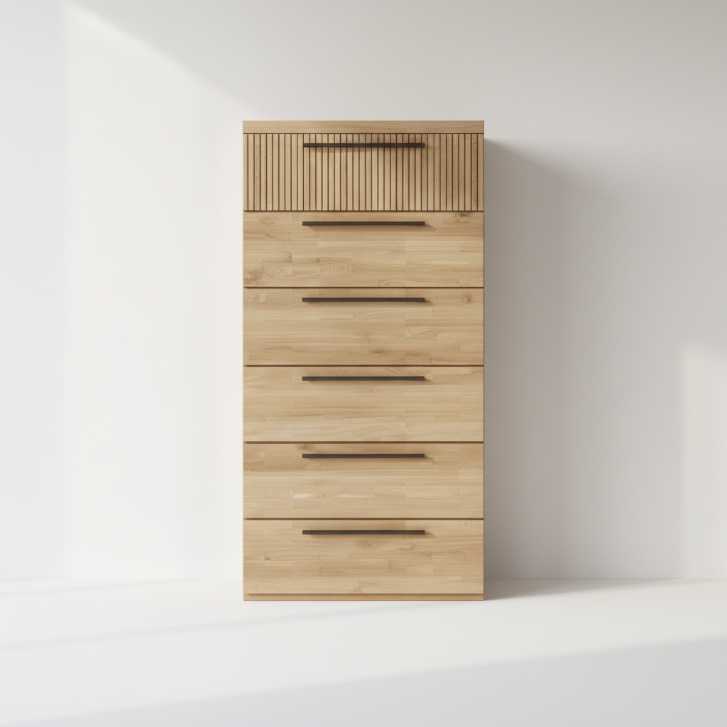 Este sinfonier destaca por su diseño moderno y elegante, con seis cajones apilados verticalmente que ofrecen amplio espacio de almacenamiento para ropa y accesorios en el dormitorio. Fabricado en madera natural de tonos claros, presenta un acabado suave y texturizado en la parte superior con ranuras decorativas, ideal para un estilo escandinavo o minimalista. Sus asas metálicas alargadas aportan un toque contemporáneo y funcional, facilitando el acceso diario. Estructura compacta y elevada que se adapta a rincones estrechos, maximizando el orden sin ocupar mucho espacio. Su apariencia luminosa y natural integra calidez y practicidad en cualquier habitación.