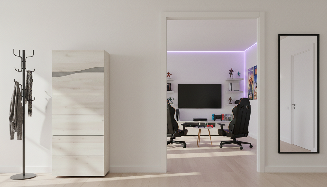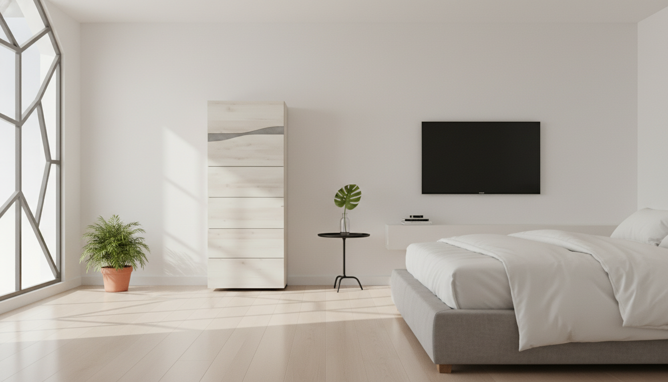 Ofrece mucho espacio de almacenamiento en formato estrecho, ideal para habitaciones pequeñas, con diseño moderno que aporta luminosidad y elegancia al dormitorio.
