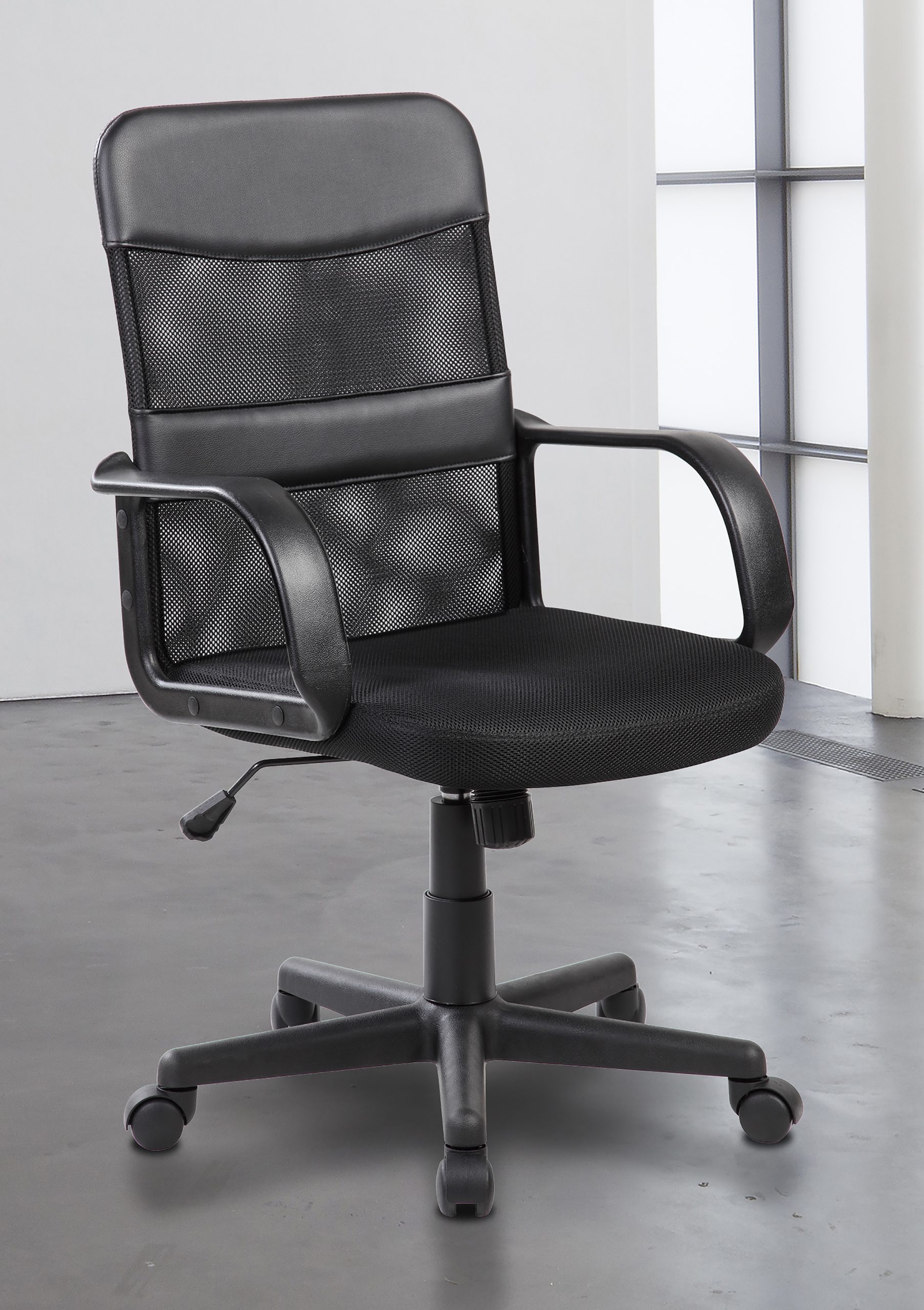 La silla de oficina SOF08 es ergonómica, con respaldo y asiento en malla transpirable, diseñada para proporcionar comodidad y ventilación durante largas jornadas de trabajo. Su estructura presenta un mecanismo de regulación de altura mediante pistón de gas, permitiendo ajustar la posición para adaptarse a diferentes usuarios. La base es de polipropileno resistente, con cinco ruedas giratorias que facilitan la movilidad sobre distintas superficies. Los reposabrazos están integrados en plástico duro, optimizando la postura de brazos y hombros. El diseño incorpora un respaldo medio, adecuado tanto para oficinas como para espacios domésticos, asegurando buena estabilidad y soporte lumbar.