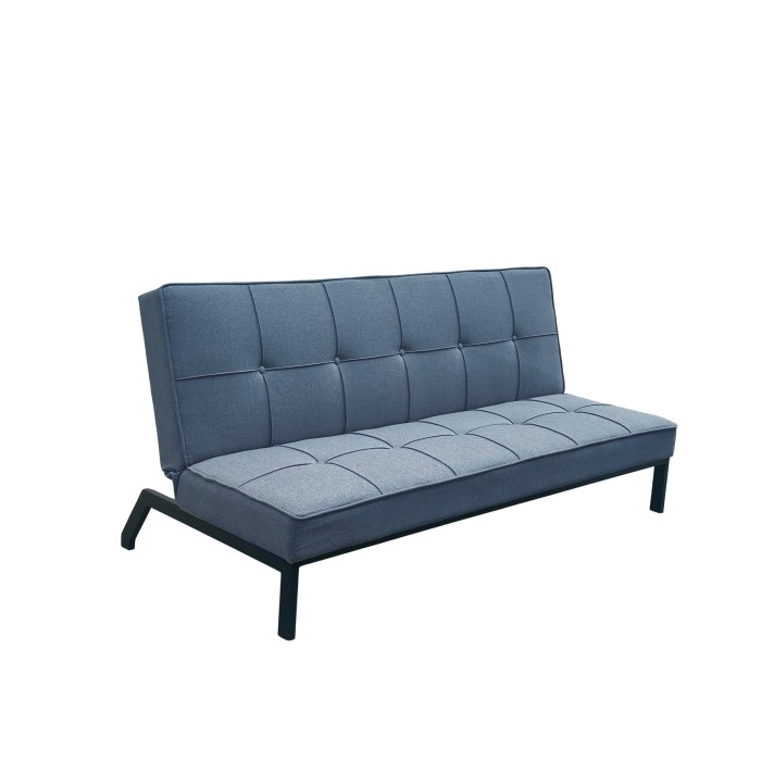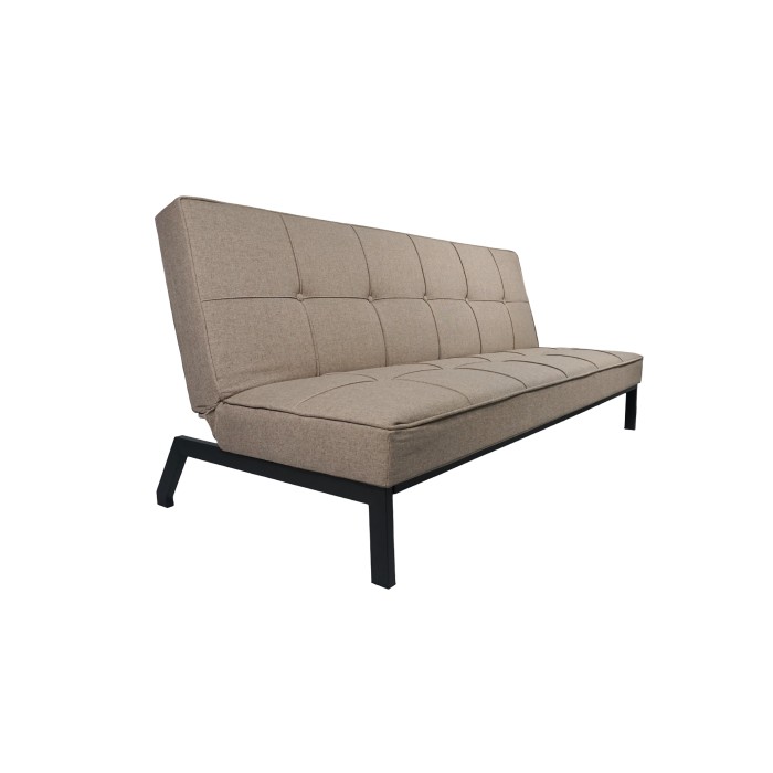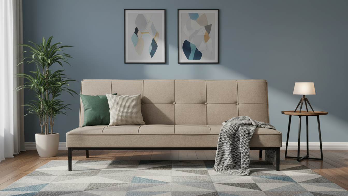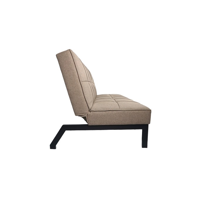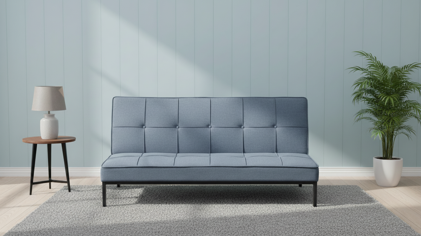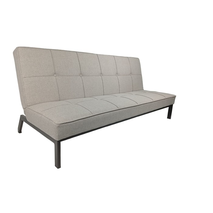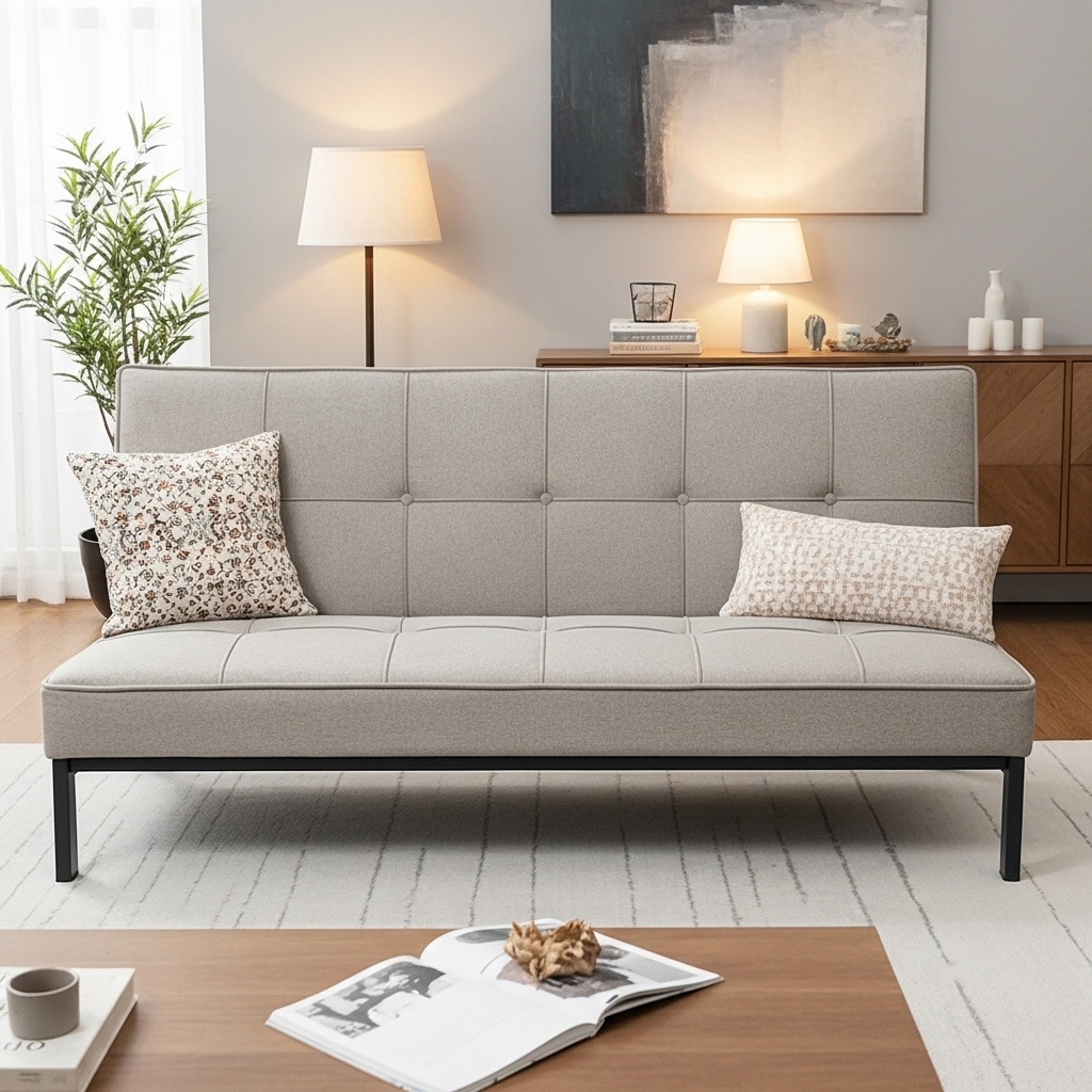 Sofá cama funcional de apertura clic-clac, con colchón de espuma de firmeza media y estructura metálica estable, ideal para uso diario ocasional y para optimizar el espacio en salones pequeños o habitaciones multiusos.