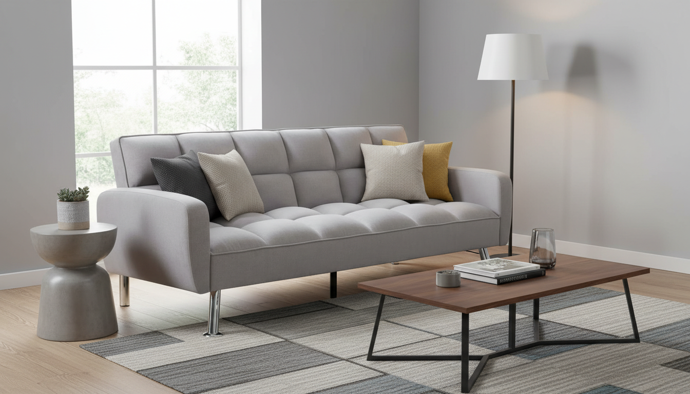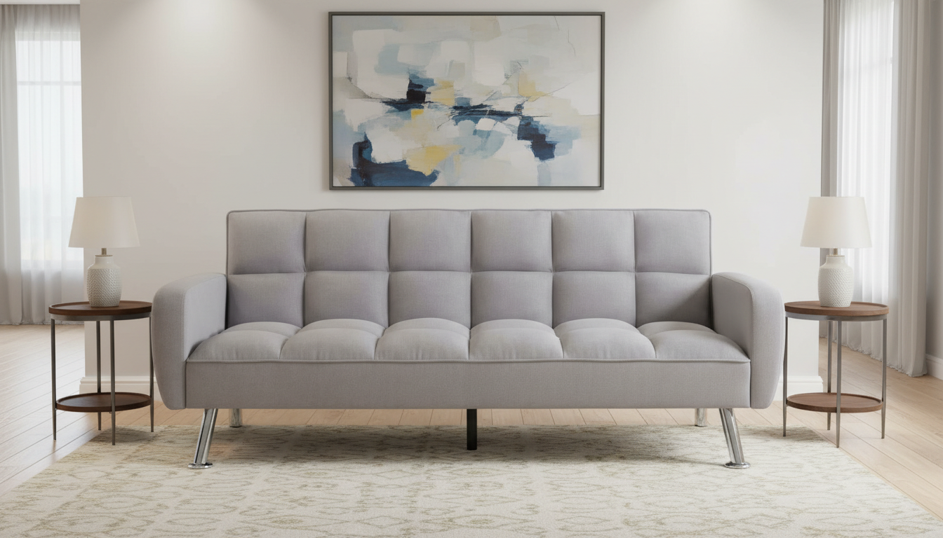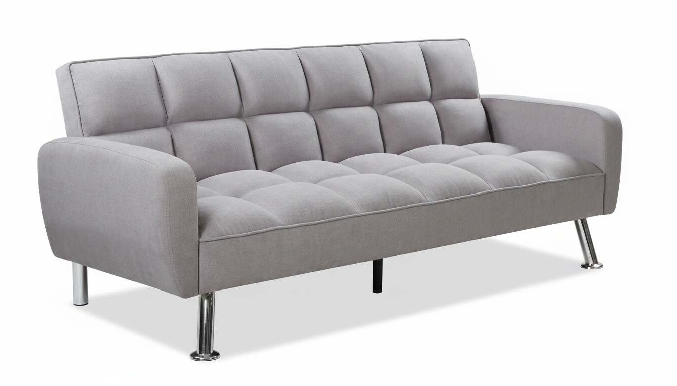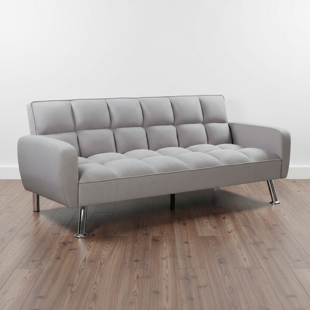 Sofá cama con brazos acolchados, tapizado en tela con costuras en cuadrícula y ribete perimetral. Patas frontales de metal cromado para mayor estabilidad y estilo moderno.